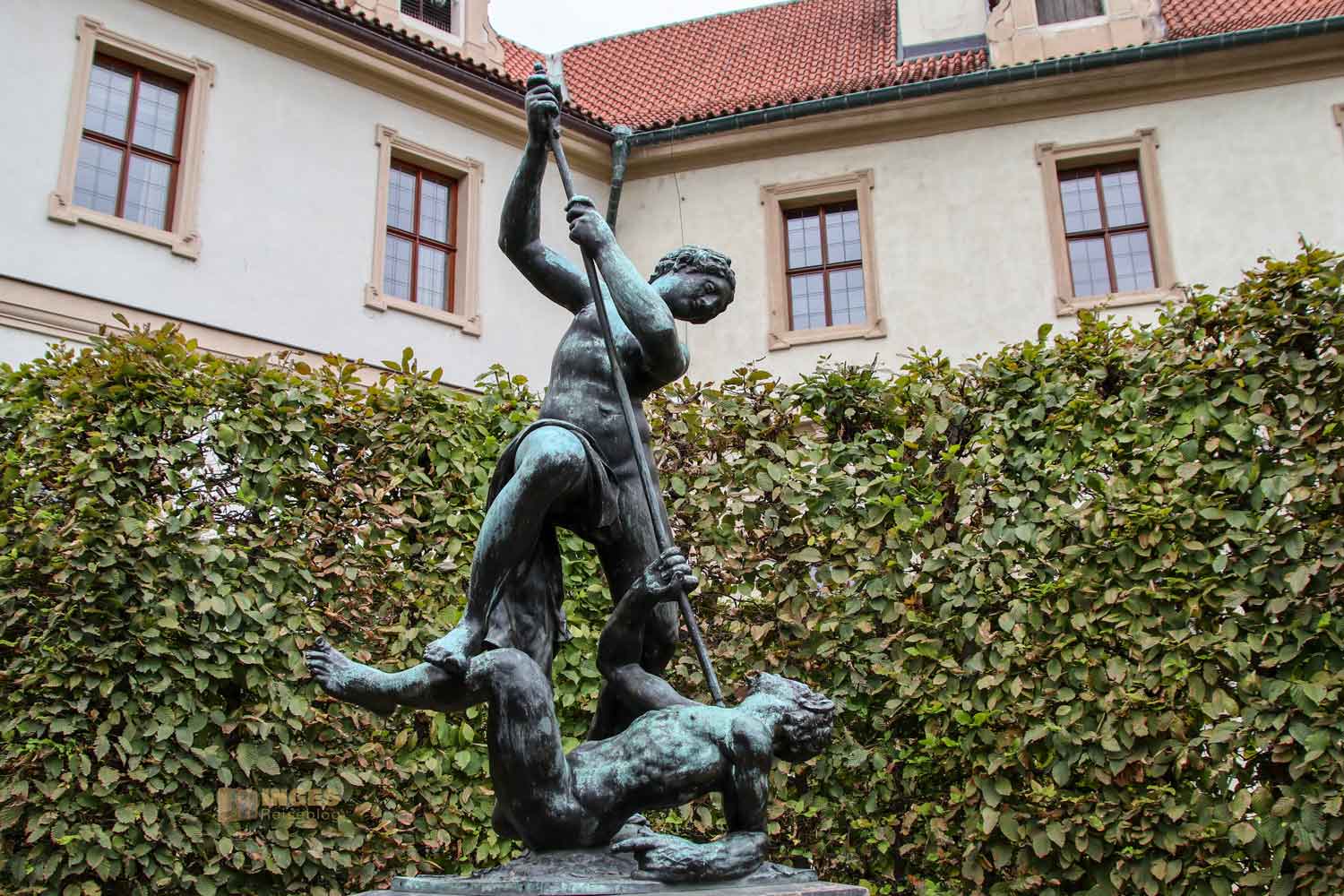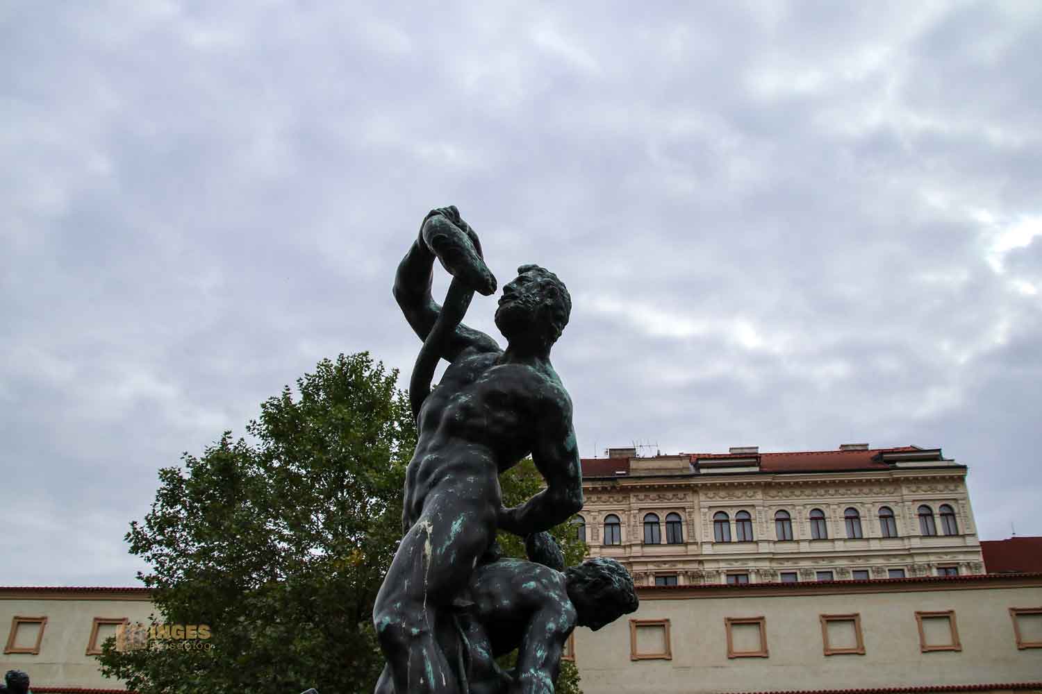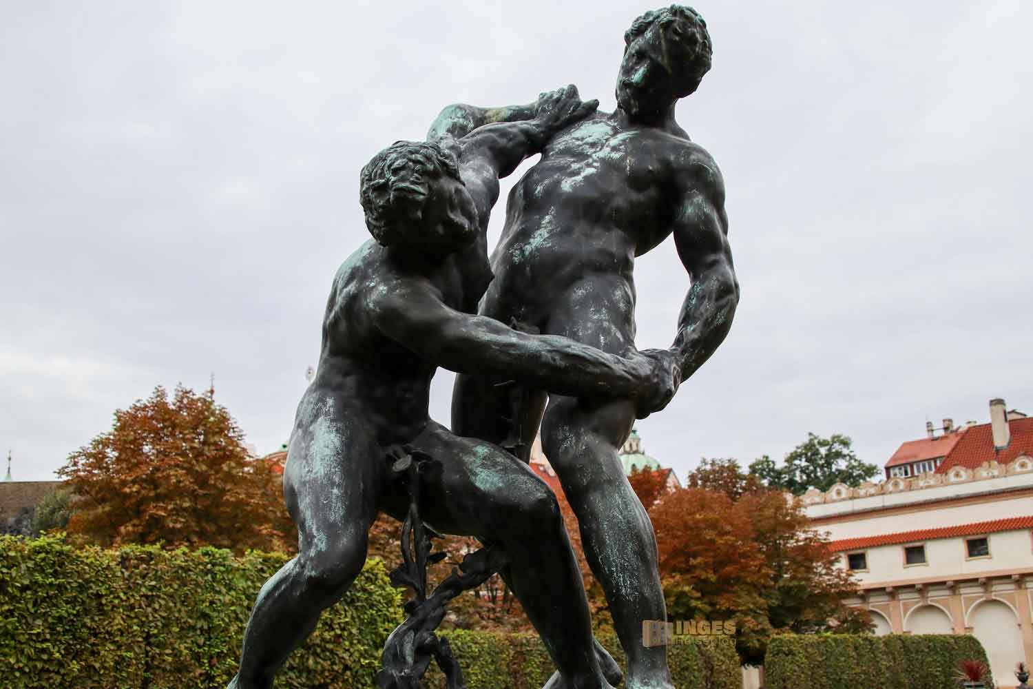Vermutlich hatte ein Familienmitglied des Hauses Waldstein ein Einsehen, und war der Überzeugung, dass die gestohlenen Figuren einfach in den Waldstein-Garten gehören. Er ließ 1914 Kopien davon anfertigen, die es jetzt zu bewundern gilt. Und immer haben die 'Herrschaften' die Prager Burg im Blick oder im Rücken.