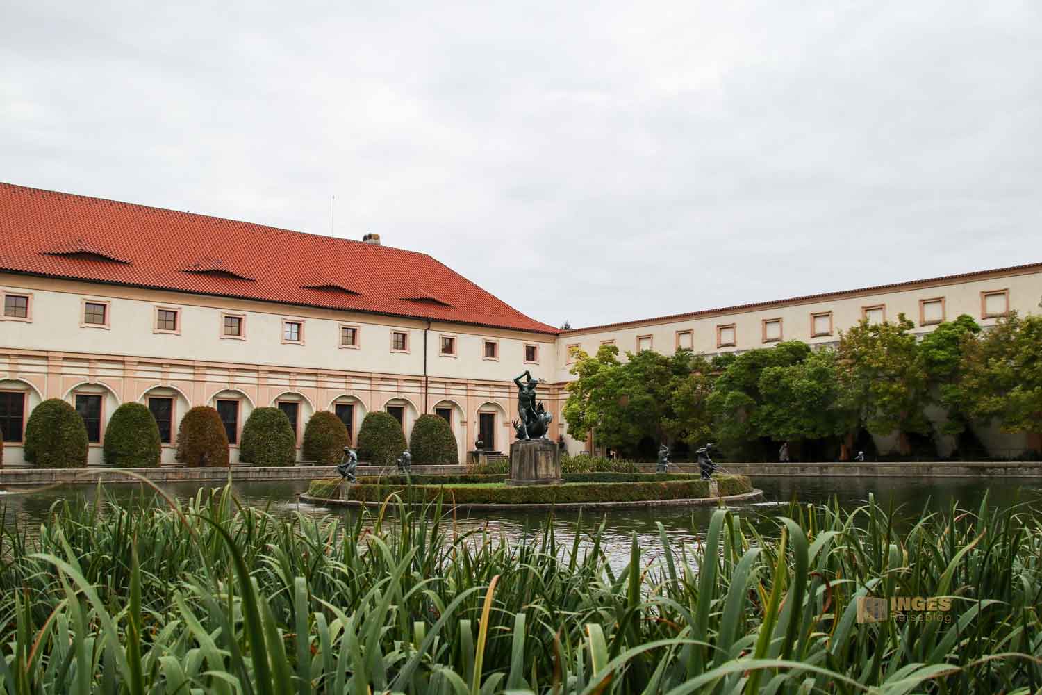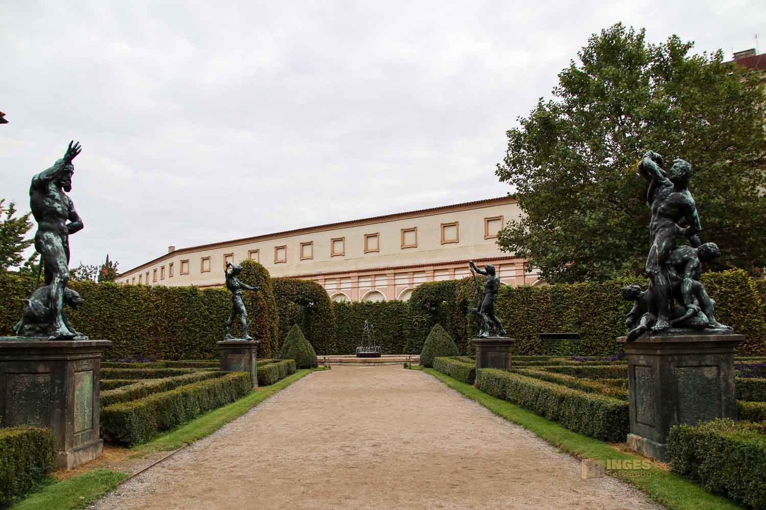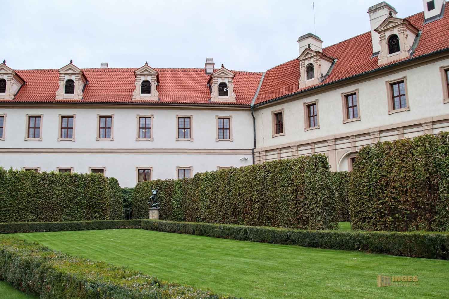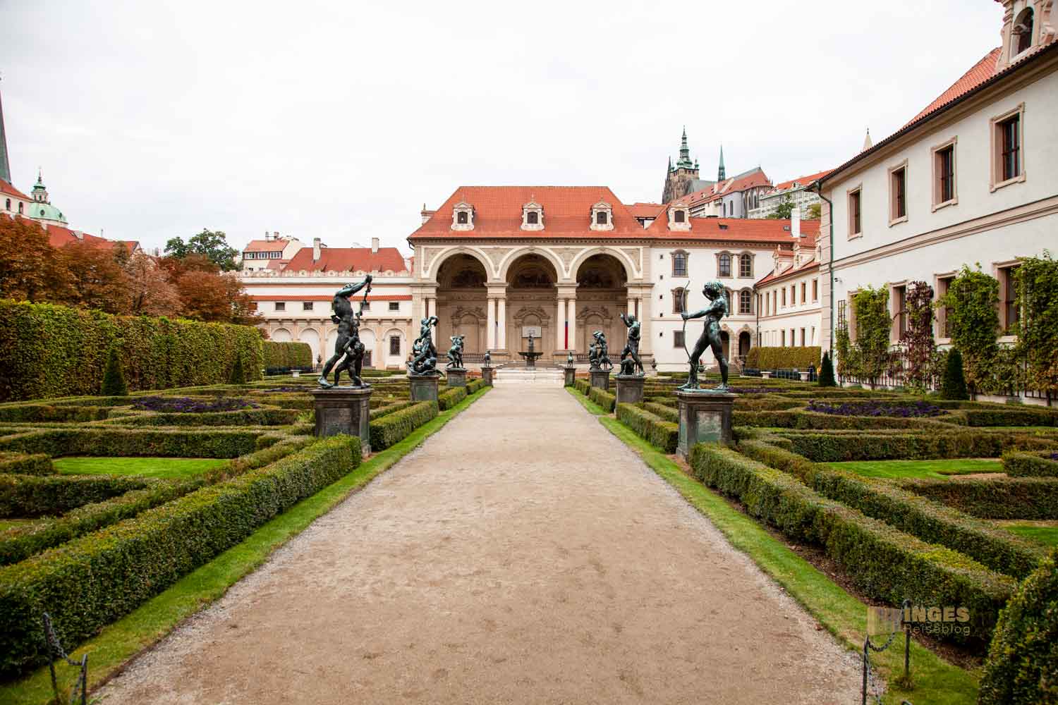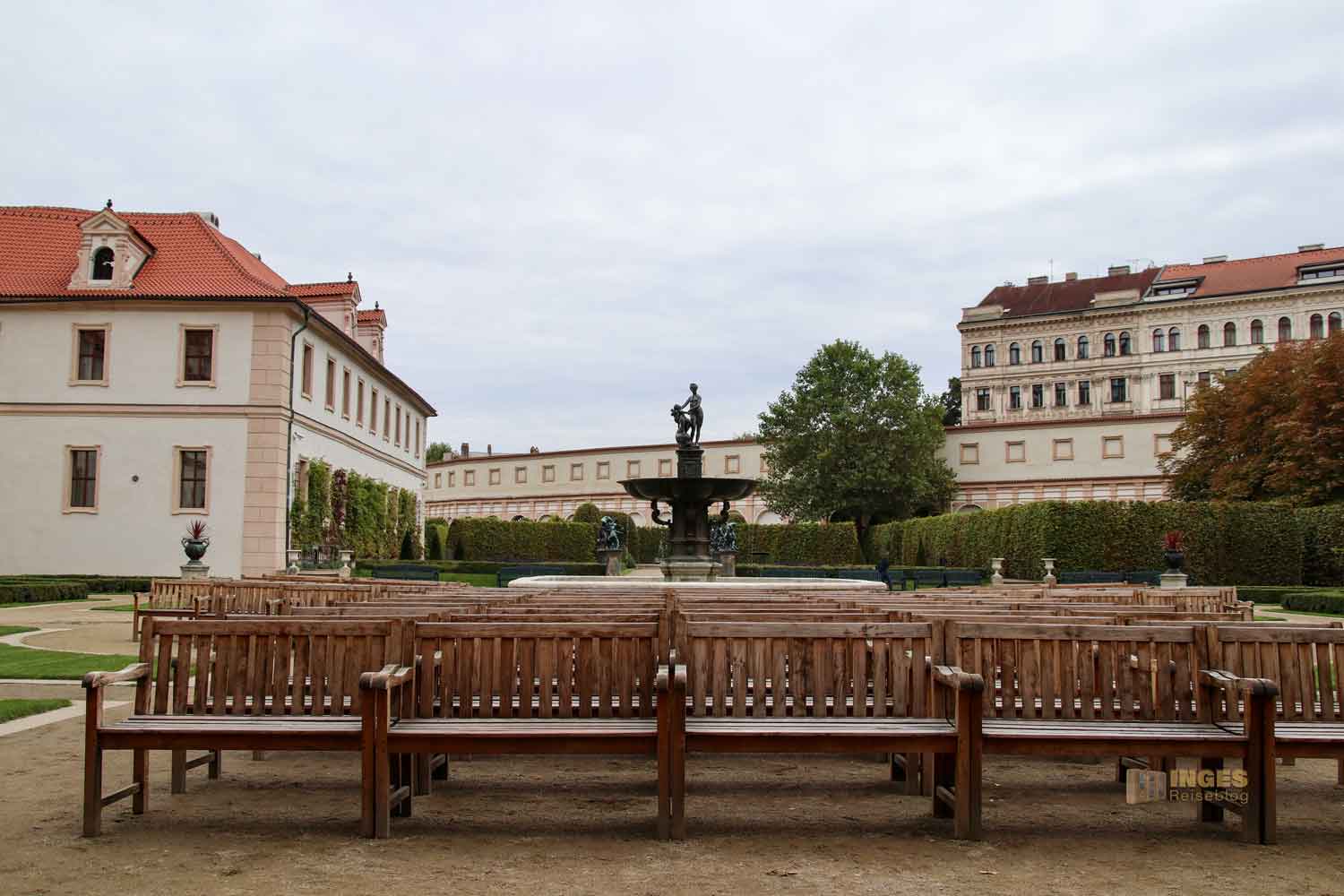 den es dem 17. Jahrhundert in Prag gibt - gemeinsam mit dem Waldstein-Palais, das sich an den Garten direkt anschließt. Unterhalb der Prager Burg sind ja die Palastgärten wie an einer Perlenschnur aufgereiht, so wie z.B. auch der Große Fürstenberg-Garten ein bisschen weiter in der Straße. Der Waldsteingarten ist mit seinen über 14.000 qm als zweitgrößter Garten im Zentrum von Prag jedoch einer der ersten, an dem sich unmittelbar ein herrliches Palais anschließt. Wenn man bedenkt, dass nur die Königsgärten der Prager Burg größer sind, als dieser herrliche geometrisch angelegte Garten, dann muss man bereits beim Anblick des Gartens annehmen, da war kein armer Mensch am Werk.