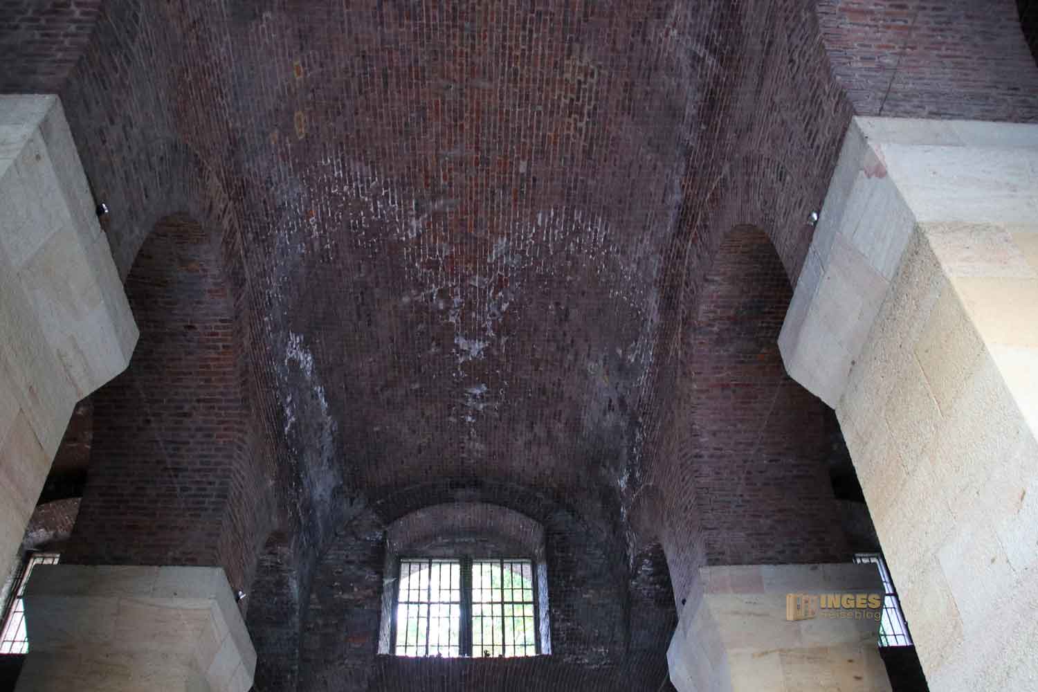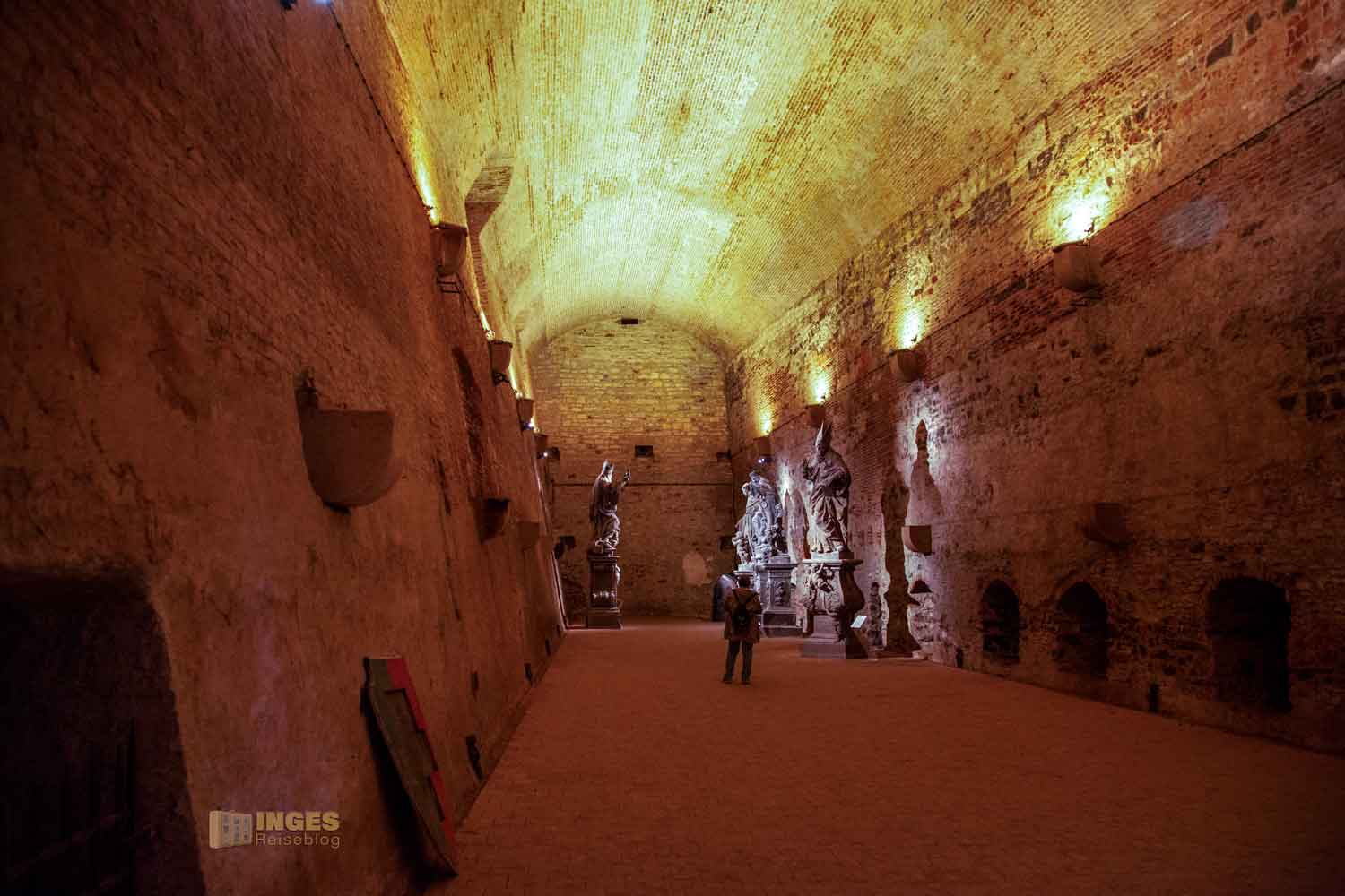 Oh Heiligs Blechle! Das war im ersten Moment, als ich aus dem Kasematten Gang in den Saal trat, mein Ausruf der Bewunderung. Wir Schwaben nehmen diese höchste Form der Bewunderung und Erstaunens nur in Ausnahmefällen her 😉 Der größte Saal auf dem ganzen Vyšehrad befindet sich gerade hier in der Unterwelt. 13 Meter geht er in die Höhe und hat eine Fläche von 330 qm, und wurde in der Zeit von 1656-1678 fertig gestellt. Lange Zeit diente dieser große Raum früher als Luftschutzraum und als Lager für Kartoffeln und Gemüse.