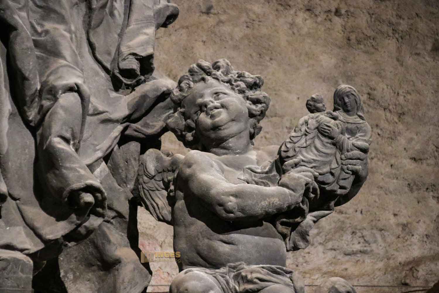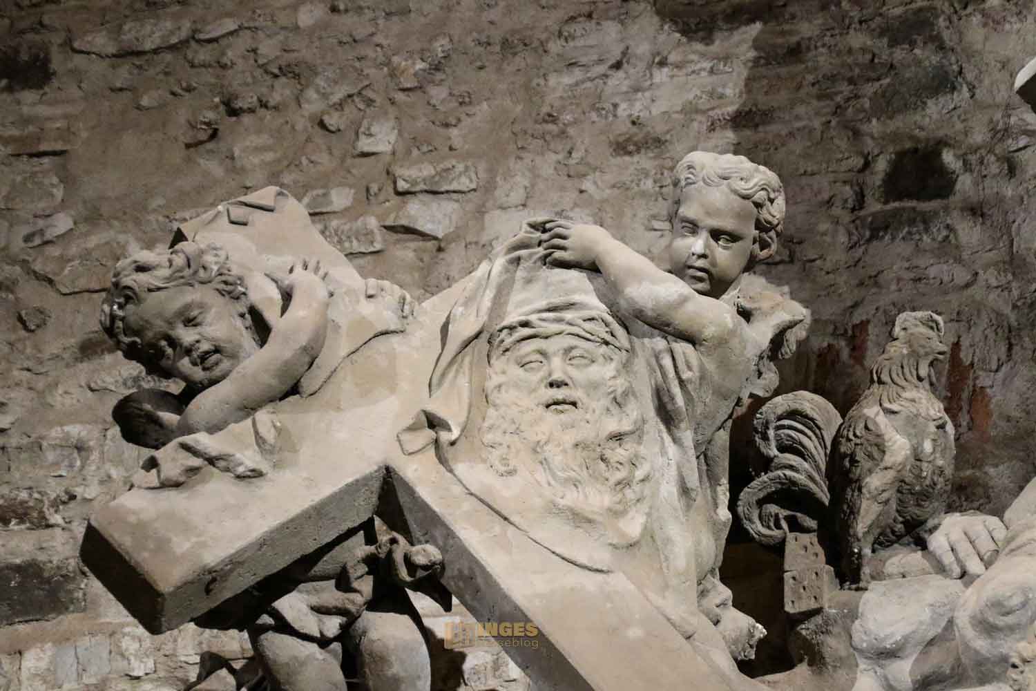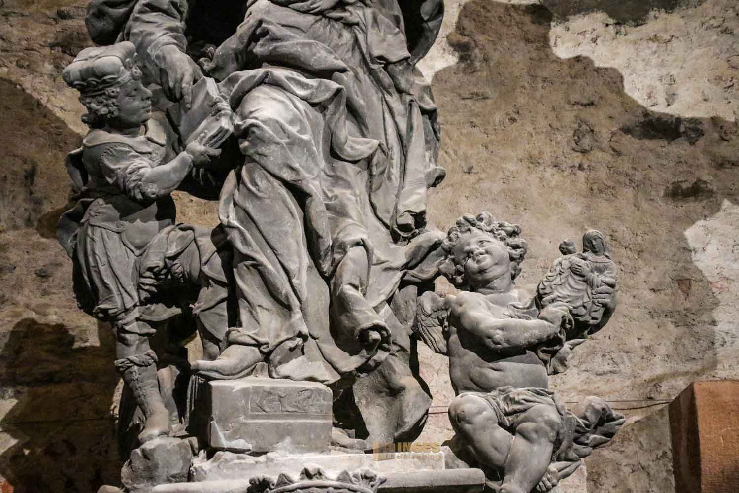 Man könnte die nachfolgenden Minuten vor Ort im Gorlice-Saal auch übertiteln "Inge im Glück" - denn wie ihr vielleicht schon bei meinen anderen Berichten bemerkt habt, ich habe eine Schwäche für Skulpturen (und vor allem für kleine Himmelsboten) im Lauf der Zeit entwickelt. Ich bin jedesmal aufs Neue fasziniert, wie ausdrucksstark man einen Stein doch bearbeiten kann. Da ich alle Statuen ja von der Karlsbrücke im Juni 2020 schon kennengelernt habe, will ich jetzt doch wissen, ob es einen Unterschied Original zur Kopie gibt.