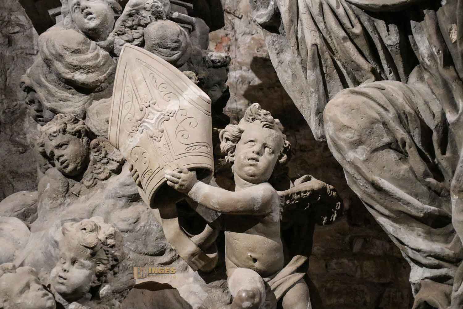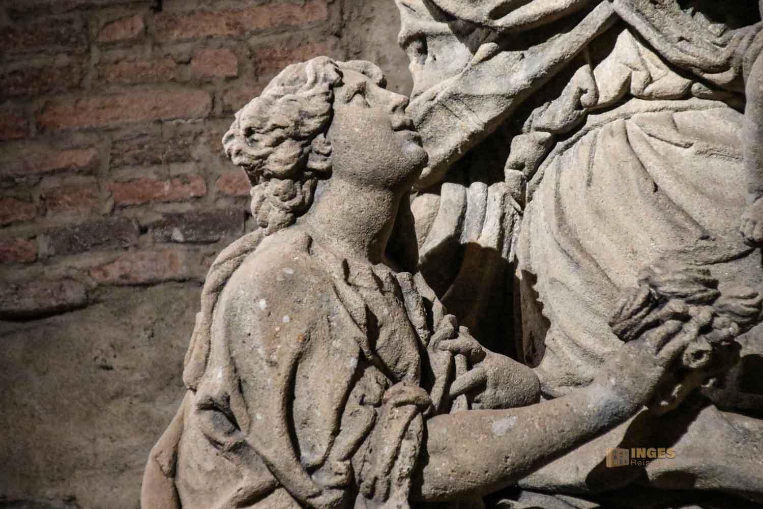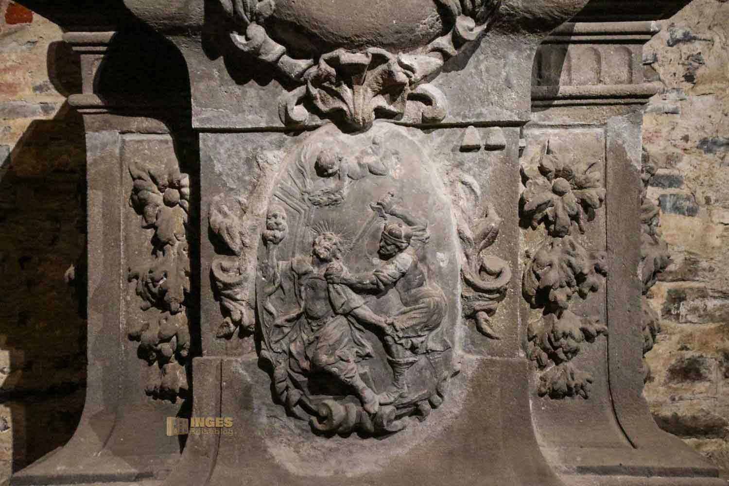 Man könnte die nachfolgenden Minuten vor Ort im Gorlice-Saal auch übertiteln "Inge im Glück" - denn wie ihr vielleicht schon bei meinen anderen Berichten bemerkt habt, ich habe eine Schwäche für Skulpturen (und vor allem für kleine Himmelsboten) im Lauf der Zeit entwickelt. Ich bin jedesmal aufs Neue fasziniert, wie ausdrucksstark man einen Stein doch bearbeiten kann. Da ich alle Statuen ja von der Karlsbrücke im Juni 2020 schon kennengelernt habe, will ich jetzt doch wissen, ob es einen Unterschied Original zur Kopie gibt.