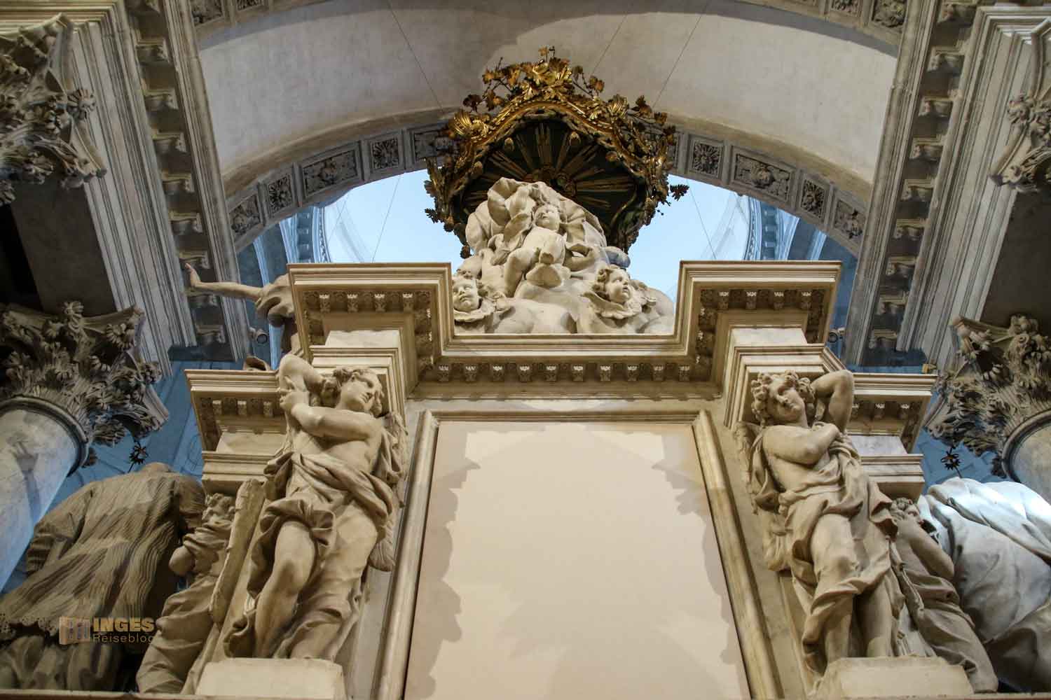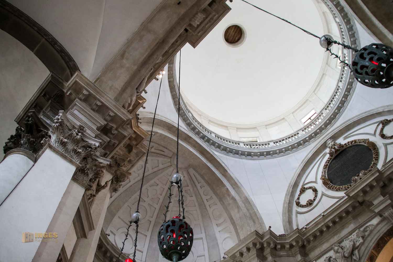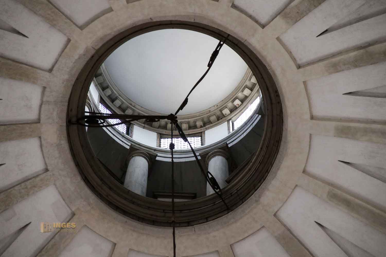 In acht Ecken ragen die Pfeiler bis zur Kuppel empor. Oben, über dem Gesims ist ein unterer Laufgang (aber nicht für die Öffentlichkeit). Helligkeit fällt in die Kirche durch die sechzehn Fenster rundum. Da war es schon ein bisschen Tüfftelarbeit des Architekten, damit die 40 Meter hohe Kuppel nicht zuviel Gewicht bekommt. Er löste dieses 'Problem', indem er die Kuppel mit Holz herstellte, außen mit Blei verkleidete und innen mit leichten Ziegel mauerte, die anschließend verputzt wurden.