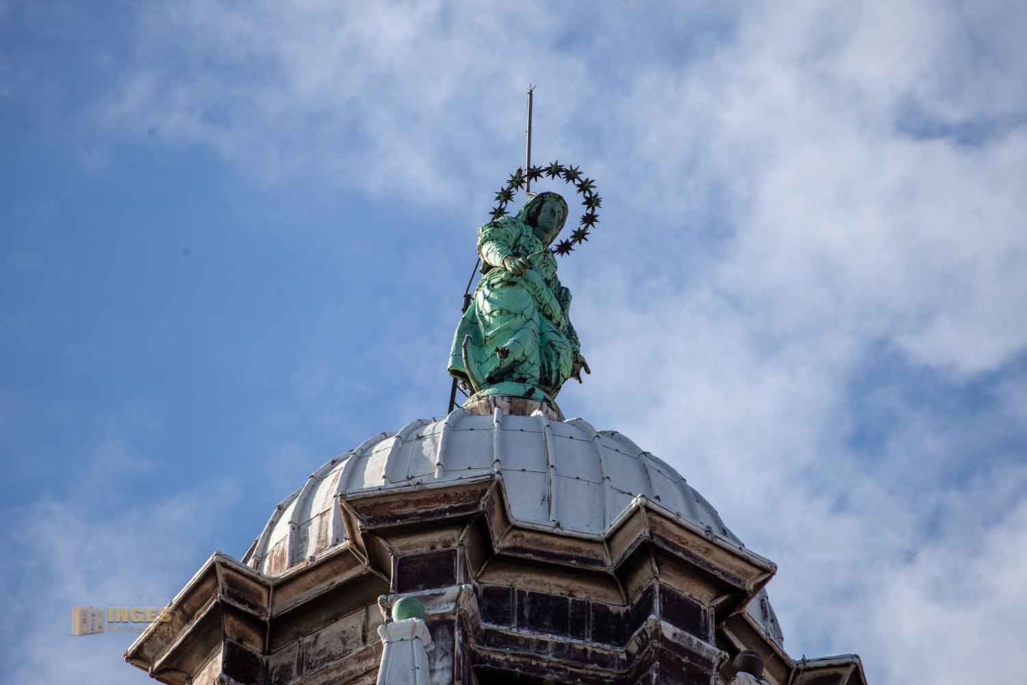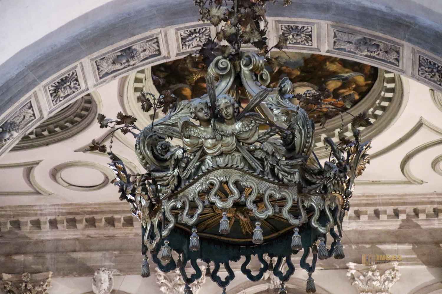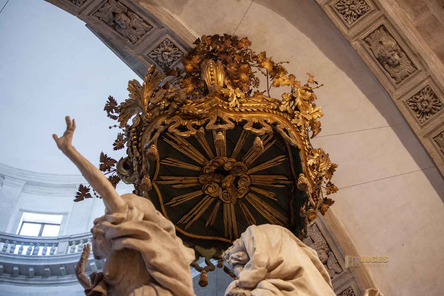In acht Ecken ragen die Pfeiler bis zur Kuppel empor. Oben, über dem Gesims ist ein unterer Laufgang (aber nicht für die Öffentlichkeit). Helligkeit fällt in die Kirche durch die sechzehn Fenster rundum. Da war es schon ein bisschen Tüfftelarbeit des Architekten, damit die 40 Meter hohe Kuppel nicht zuviel Gewicht bekommt. Er löste dieses 'Problem', indem er die Kuppel mit Holz herstellte, außen mit Blei verkleidete und innen mit leichten Ziegel mauerte, die anschließend verputzt wurden.