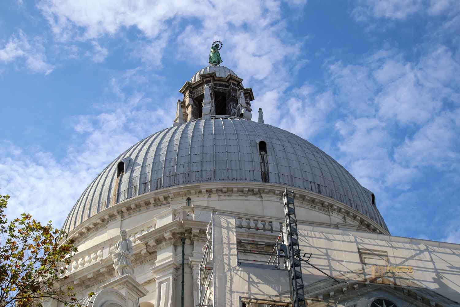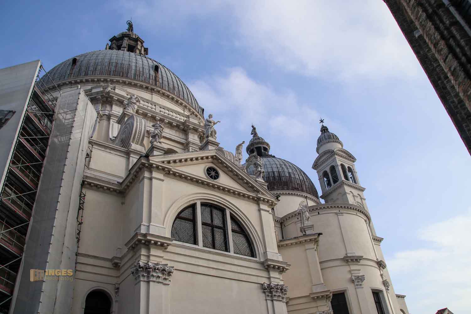 Die Pest war 1631 noch nicht endgültig besiegt, als die Vorarbeiten für die Kirche zur Grundsteinlegung begannen. Auf sage und schreibe über einer Million Baumstämmen wurde dieser gelegt. Für diese Befestigung hat man über 2 Jahre gebraucht. Die Kirche wurde in einem achtseitigen Grundriss gebaut, bekam zwei Kuppeln und zwei Campanili. 55 Meter ist die Kirche hoch. Ganz oben, auf der größten Kuppel ist die Marienstatue mit einem Kranz aus zwölf Sternen. Auf der kleinen Kuppel steht der Heilige Markus - also beide Verehrer der Stadt Venedig. 30 Jahre wurde an der Kirche gearbeitet, bei der Longhena auch immer wieder mit technischen Problemen konfrontiert wurde. Es ist halt doch nicht so einfach solch eine Kuppel zu bauen. Das durfte auch Brunelleschi mit seinem gigantischen Kuppelbau beim Dom zu Florenz schon erfahren.