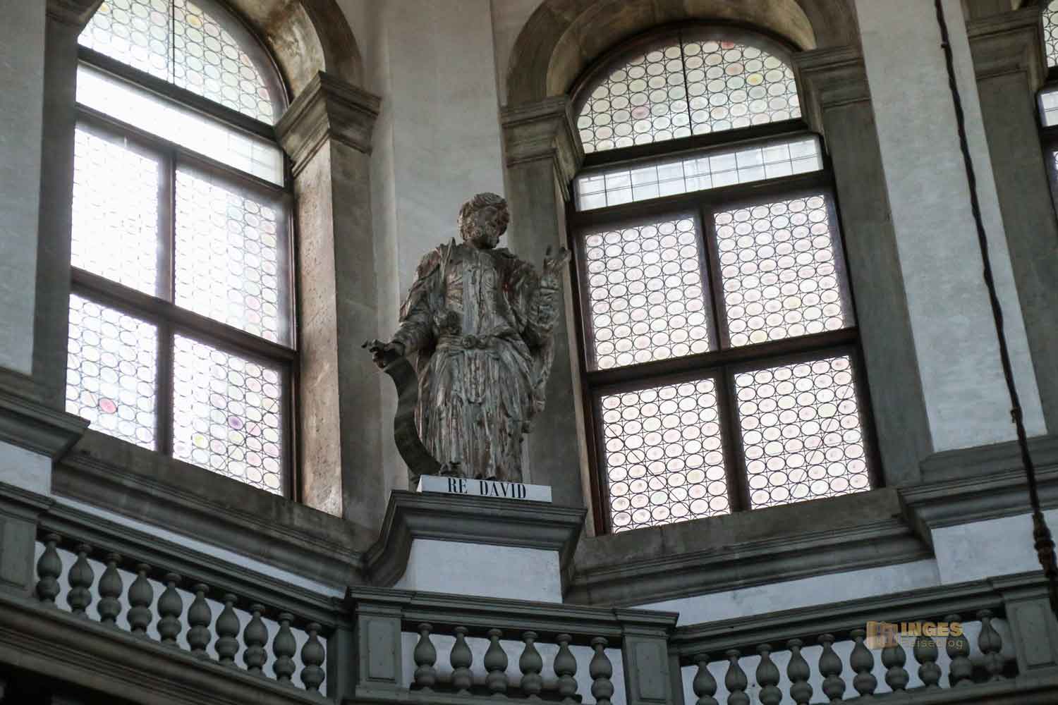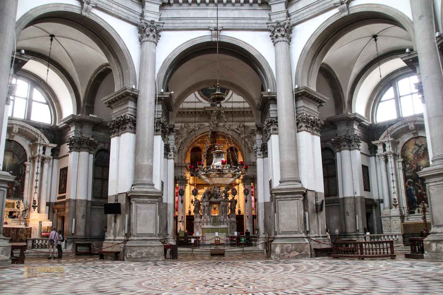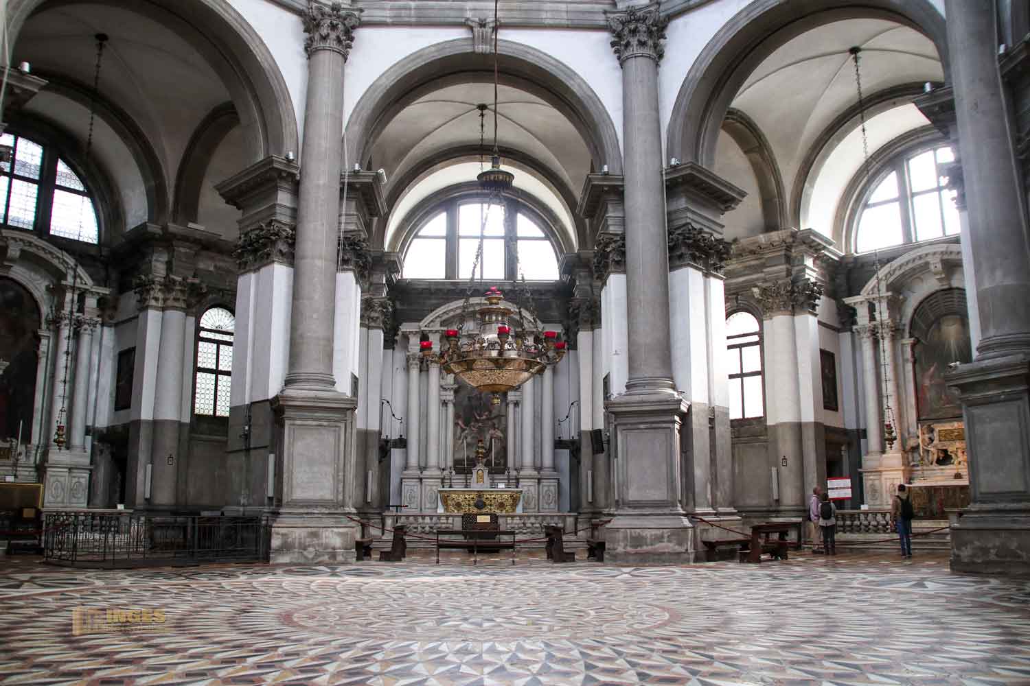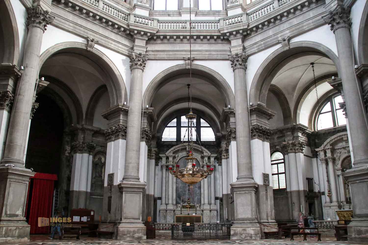 Wenn man den Kirchenraum und die Aufteilung ein bisschen auf sich wirken lässt, und sieht wo Longhena den Hochaltar platziert hat, dann erkennt man die Intention der Planung - die Kirche soll die Marienkrone darstellen. Das passt zur Verherrlichung der Mutter Gottes und der Schutzpatronin der Stadt. Den inneren Kreis der Kirche mit dem herrlichen Marmorboden darf man nicht betreten, aber auch vom Umgang aus, hat man einen hervorragenden Blick zur