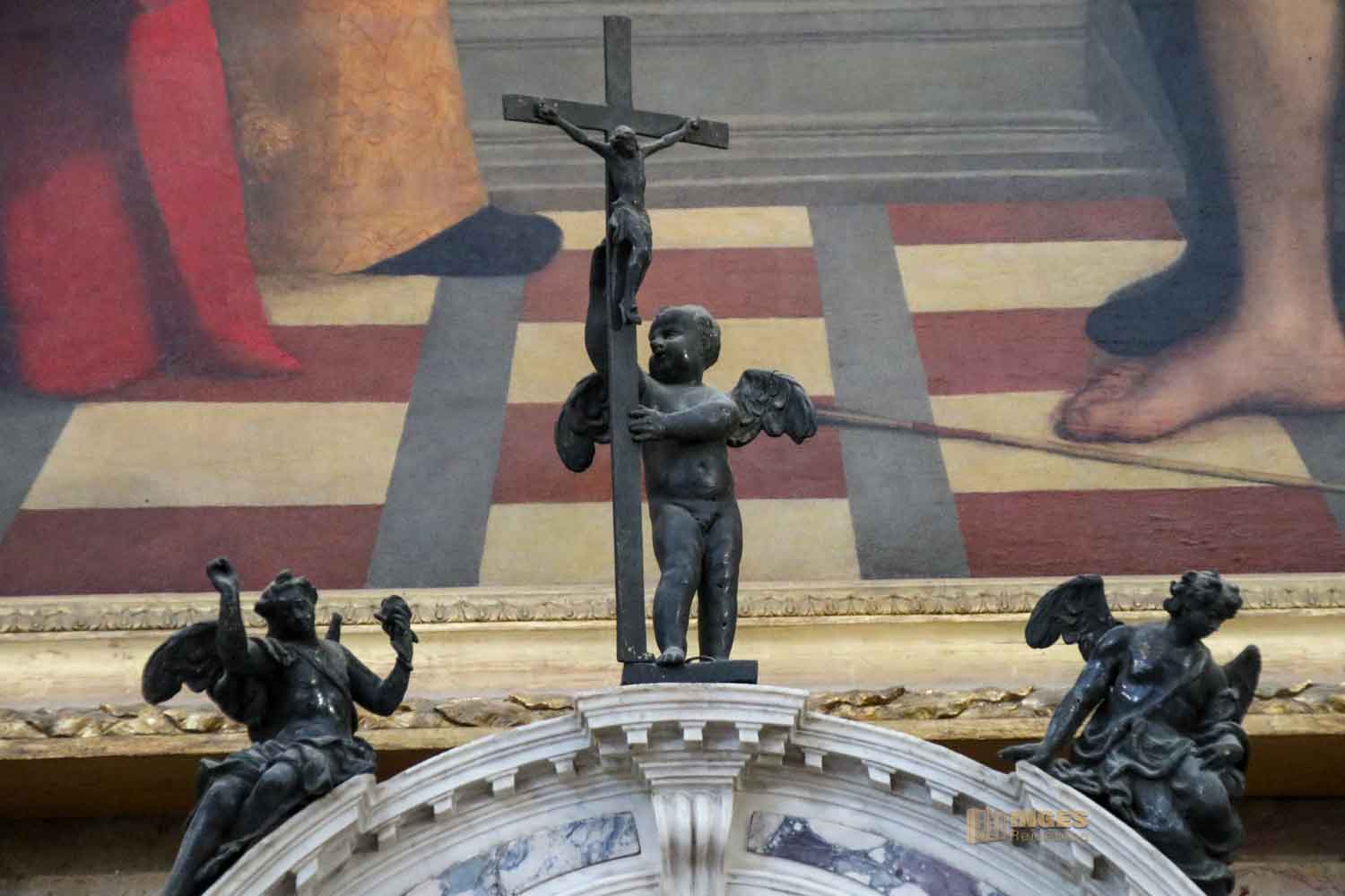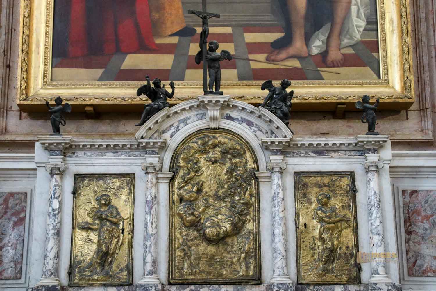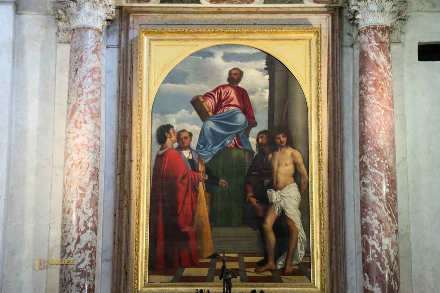 Es zeigt den Schutzpatron von Venedig mit vier der Pestheiligen, und greift damit wieder die Entstehungsgeschichte der Basilika Santa Maria della Salute auf. Rochus zeigt schon auf deine Pestbeule und es scheint, er bittet die beiden Ärzte, das Brüderpaar aus Aleppo Kosmas und Damian um Hilfe.