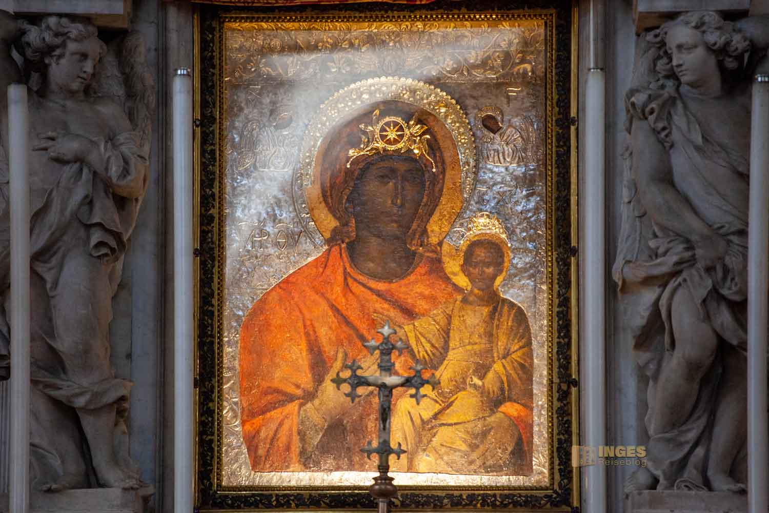 Die beiden Figuren außen rechts und links zeigen u.a. den Hl. Marco, den Stadtpatron Venedigs. Auch das Altarbild, eine byzantinische Ikone der Jungfrau Maria hat Wunder gewirkt. Angeblich soll sie vom Hl. Lukas gemalt worden sein und aus dem 12./13. Jahrhundert stammen. Ob es wirklich so ist? Auf jeden Fall wurde die Ikone 1670 von der Insel Kreta nach Venedig überbracht.