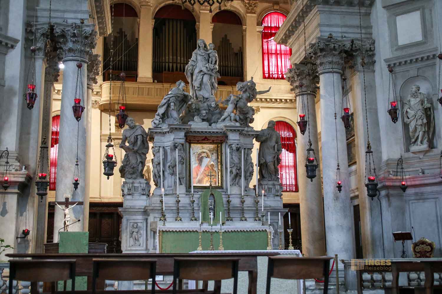 Longhena hat den barocken Hochaltar geplant und der flämische Bildhauer Josse de Corte hat die Statuengruppe ab 1670 dargestellt. In der Mitte die Himmelskönigin mit dem Jesuskind, die Venedig von der Pest erlöst. Auf der linken Seite ist 'Venedig' als junge Frau symbolisiert, die die Muttergottes um Hilfe für ihre Stadt anfleht. Auf der rechten Seite wird die 'Pest' dargestellt, eine alte Frau in zerlumpten Kleidern, die, wie es scheint von einem Engel vertrieben wird. Sie hat keine Macht mehr in Venedig die Seuche weiter zu verbreiten. Eine sehr starke Symbolkraft hat diese Gruppe, und es verwundert nicht, dass diese Kirche (genau wie Il Redentore als weitere Votivkirche) einen hohen Stellenwert in Venedig hat.