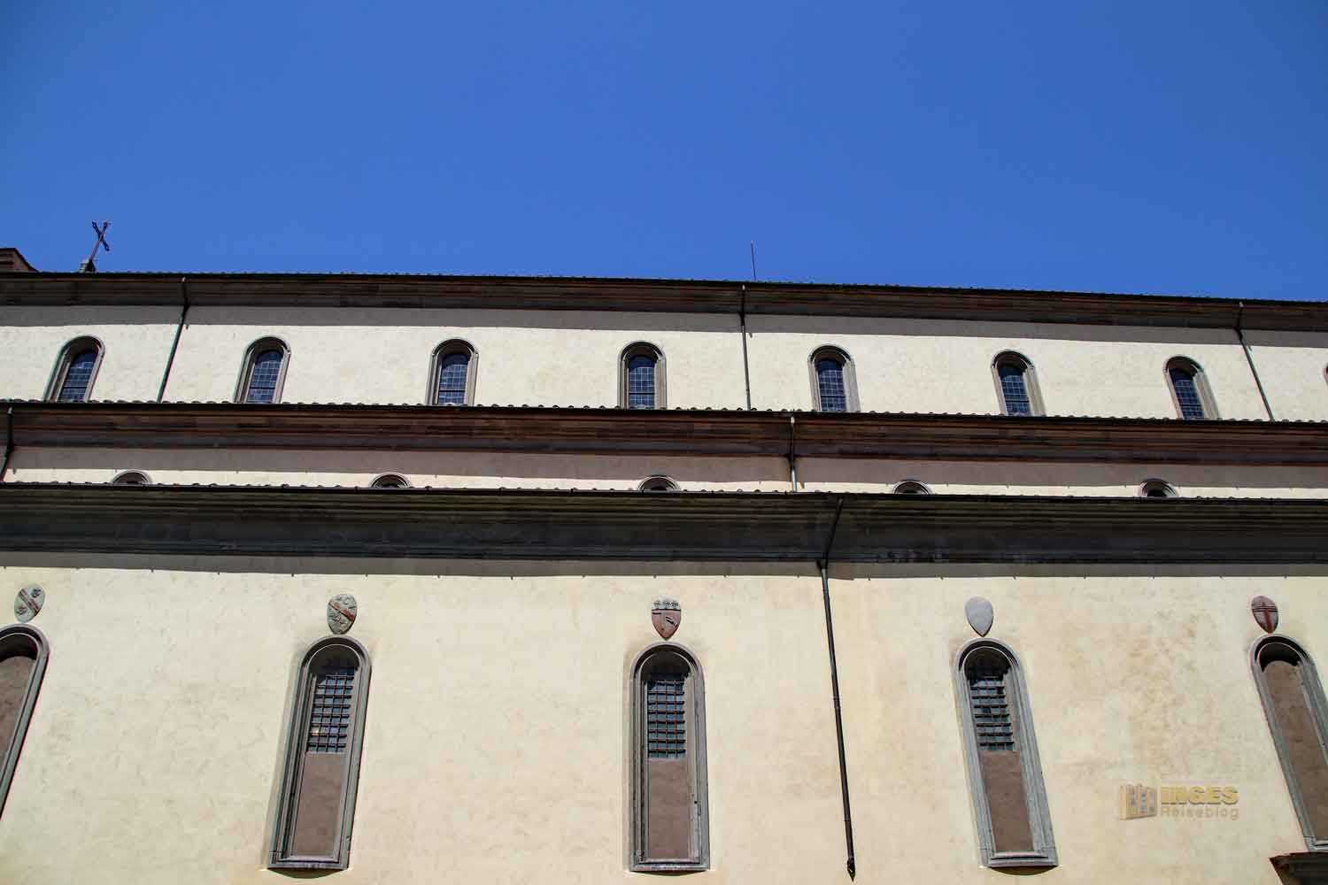 Kirchentag - so könnte man den Besichtigungsplan unseres heutigen Tages übertiteln. Kirchen gibt es ja zuhauf in Florenz, und nach unseren Erfahrungen die wir schon machen durften - unscheinbare Fassade, wunderschöne Kirche - ist es schon etwas schwer auszusortieren, bei welchen wir die Kirchentüren öffnen, und wo wir sie zulassen. Ich hab bei dieser Entscheidung immer noch den kritischen Blick meines Mannes in Prag in Erinnerung: gut 60 Kirchen verteilen sich in der Stadt. Als ich dies mal so beiläufig erwähnte, meinte er fast entsetzt: Die willst du jetzt aber nicht alle anschauen? Nein, wir haben uns auch da auf die wichtigsten beschränkt 😀 - genauso wie in Florenz auch. Aber es gibt halt hier einfach so viele wichtige 😉