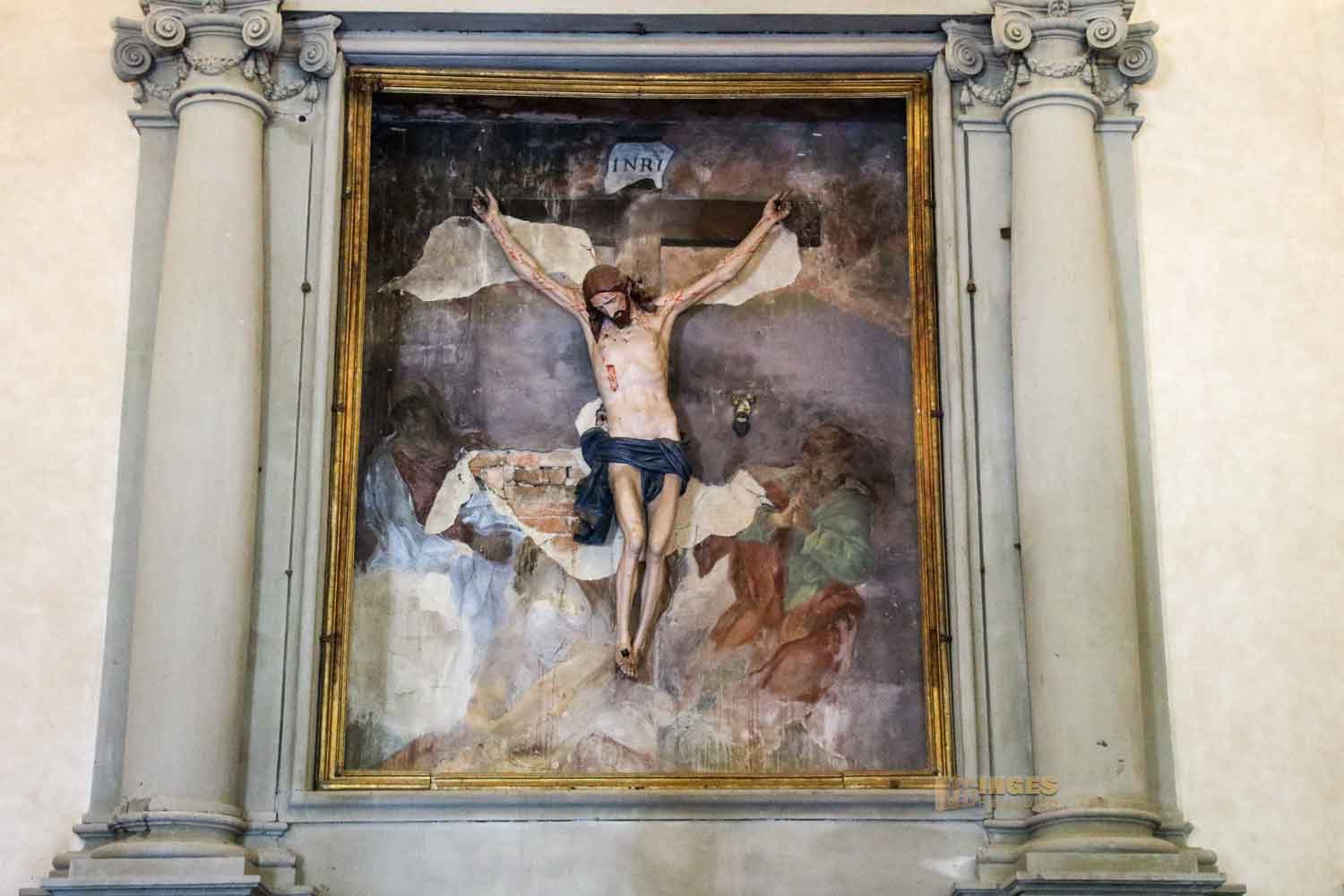 Aber hier in Santo Spirito hat Michelangelo die Anatomie des menschlichen Körpers studiert. Nein, nicht etwa in Büchern - die gab es zu dieser Zeit ja noch nicht, so wie heute. Er hat sich einfach, verbotenerweise, Leichen vom Krankenhaus des Klosters geholt, um sie zu sezieren, um damit jeden Muskel, einfach die gesamte Anatomie zu studieren. Darüber hat er sich Notizen gemacht, um sie dann in seinen Werken umzusetzen. Das von ihm entstandene bedeutende Holzkruzifix von 1493 hängt hier.
