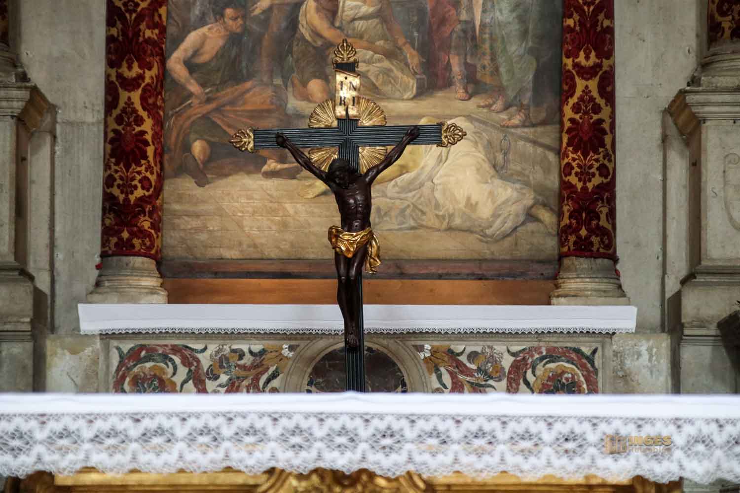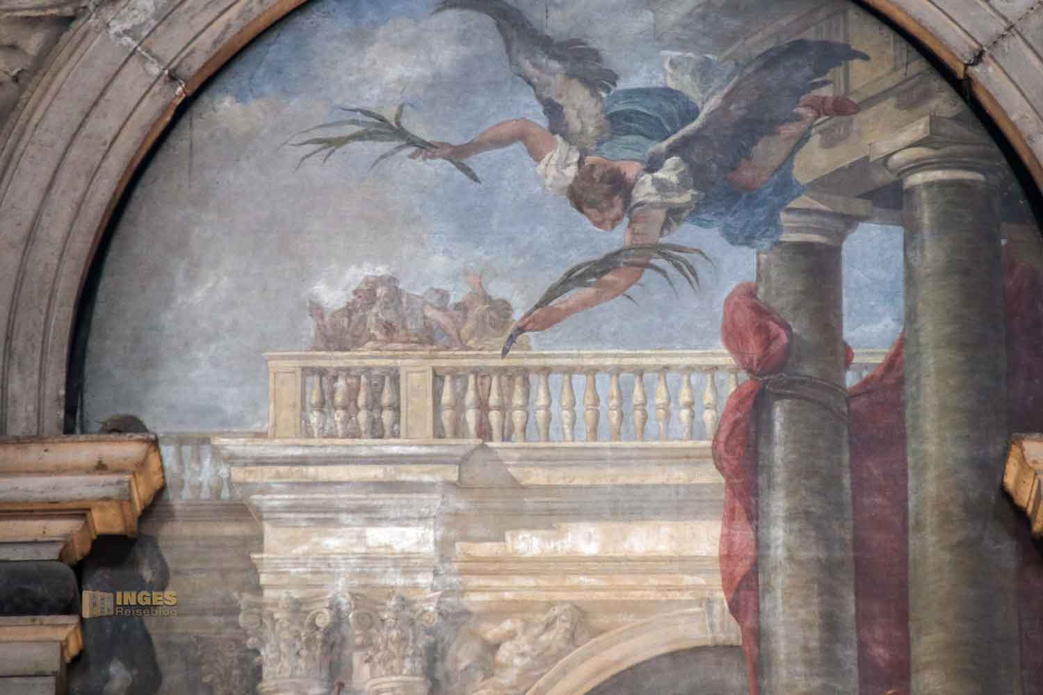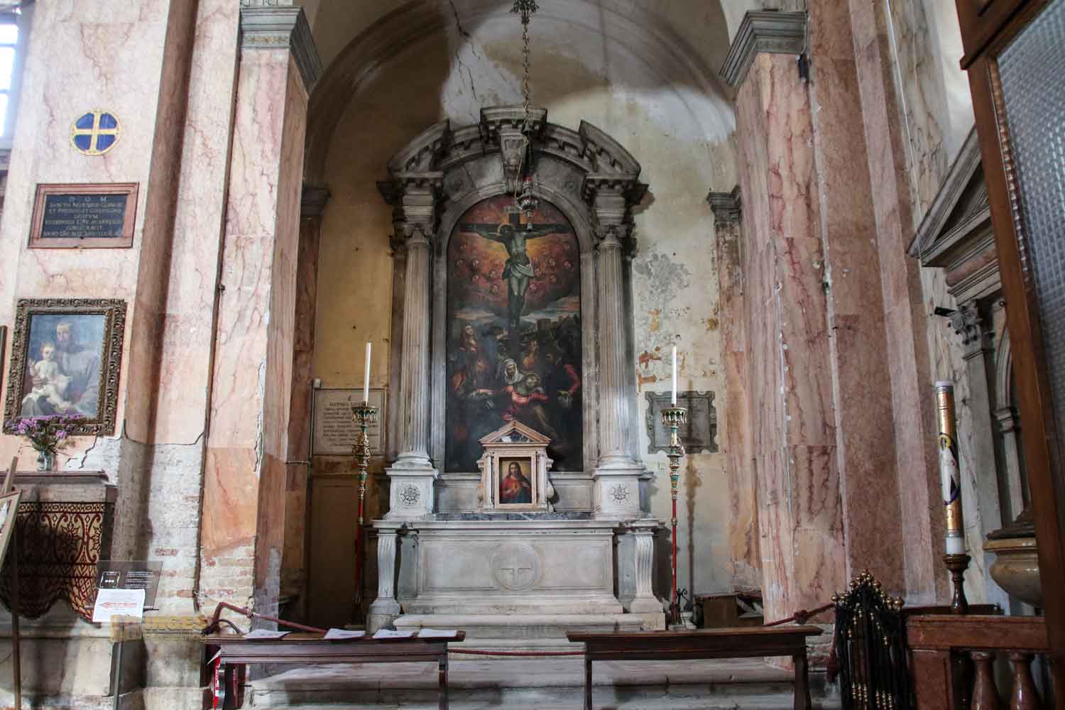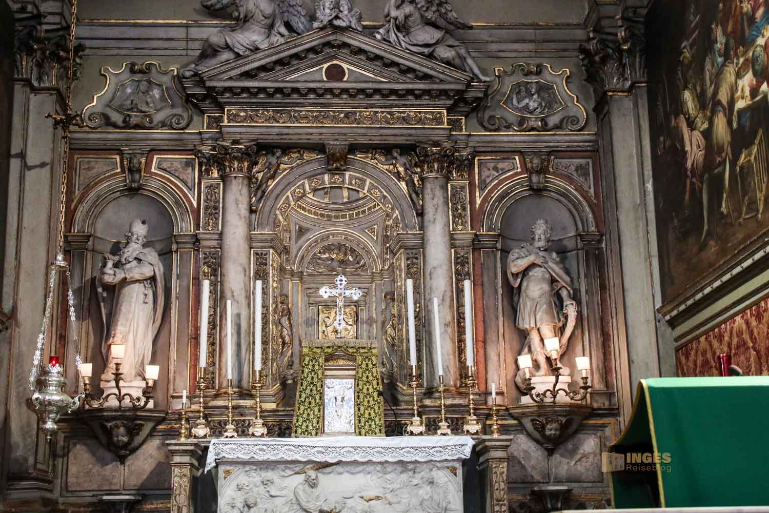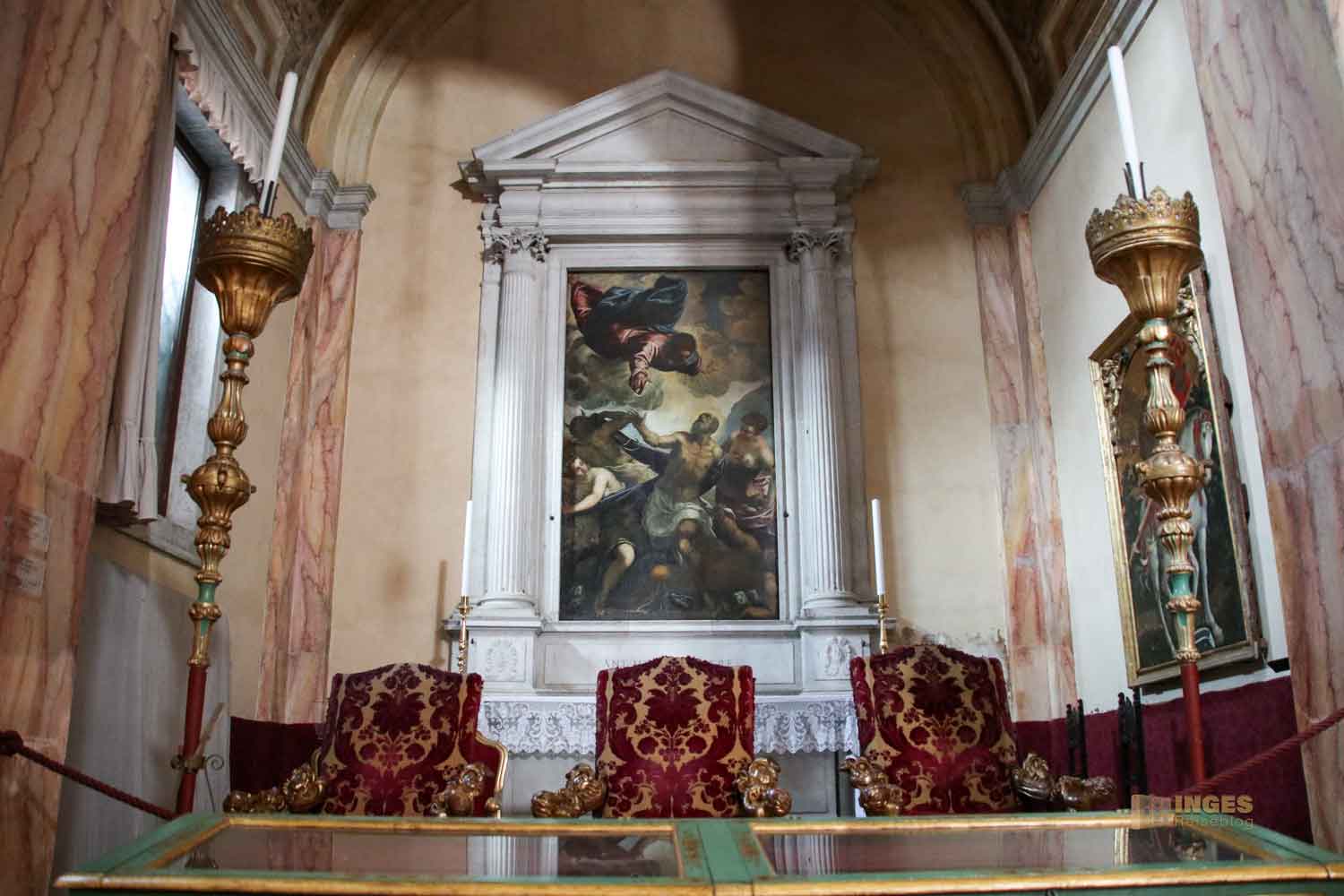 Wie ihr bei der Gesamtansicht der Kirche gesehen habt, gibt es ein einziges Längsschiff. Der Grundriss hat die Form eines Kreuzes. Zwei Kapellen haben den Einsturz 1583 teilweise überlebt, diese Kapelle ist eine davon. Wer genau schaut, der sieht an der linken Säule das eingravierte Datum 1556, vermutlich der Abschluss der damaligen Restaurierung. Wie in so vielen Kirchen werden die Kapellen und Seitenaltäre oft gesponsert, so auch in San Trovaso.