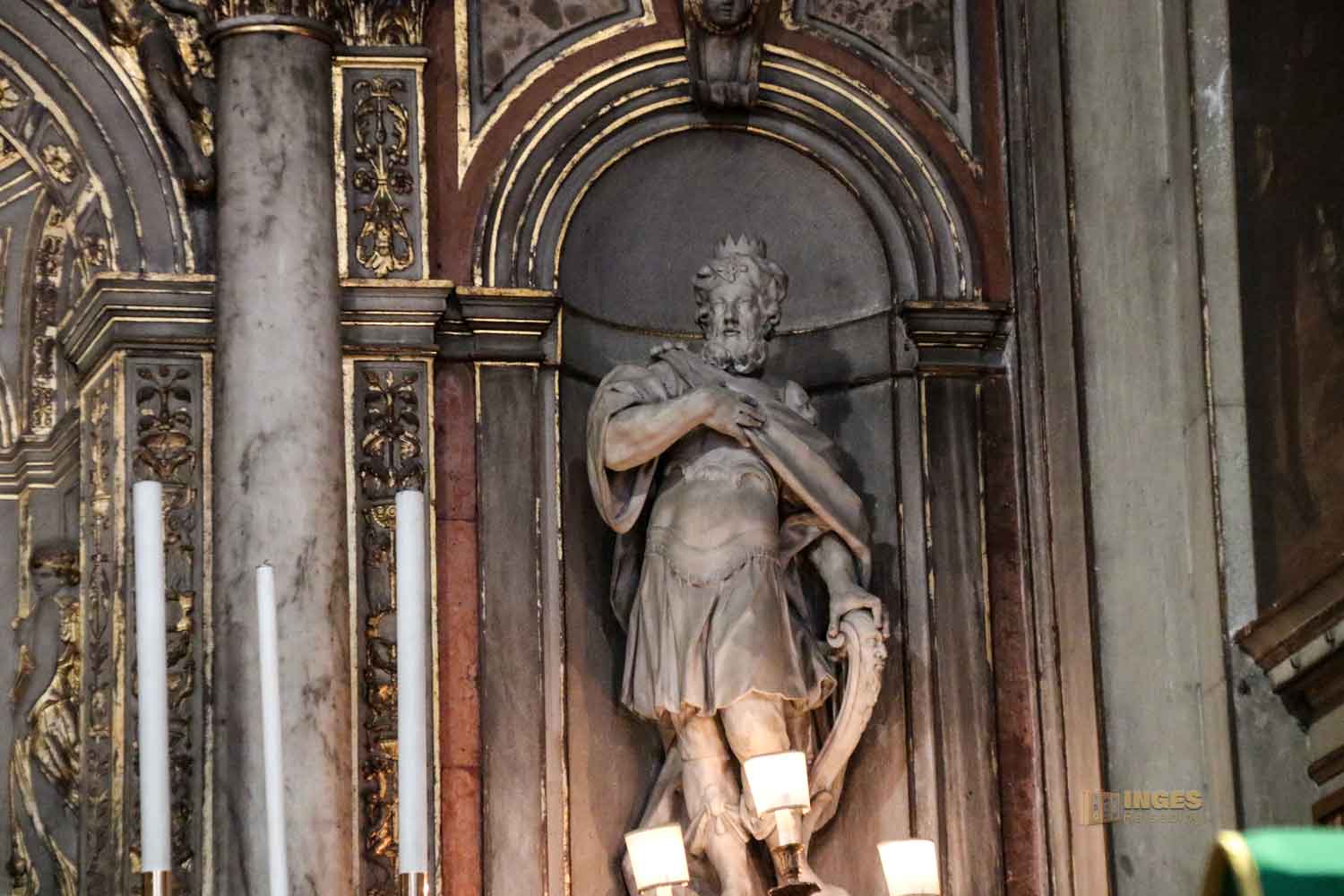 Rechts vom Altar wird David als Krieger dargestellt, trotzdem unverkennbar mit Krone und der Harfe in der Hand. Links steht Melchisidek, ein mythischer König, in der Hand Brot und Krug. Wenn ihr mehr über ihn nachlesen möchtet, dann klickt HIER.