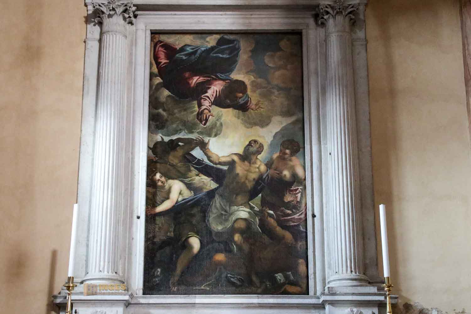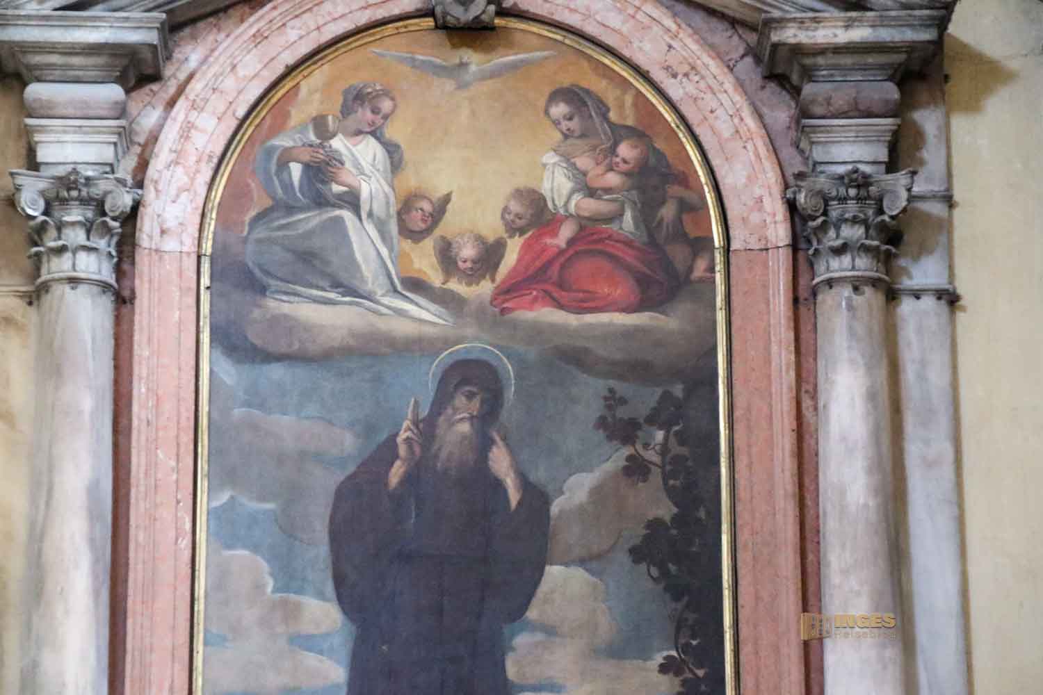Das Altargemälde zeigt die "Versuchungen des Hl. Antonius" und stammt aus der Hand von Jacopo Tintoretto.