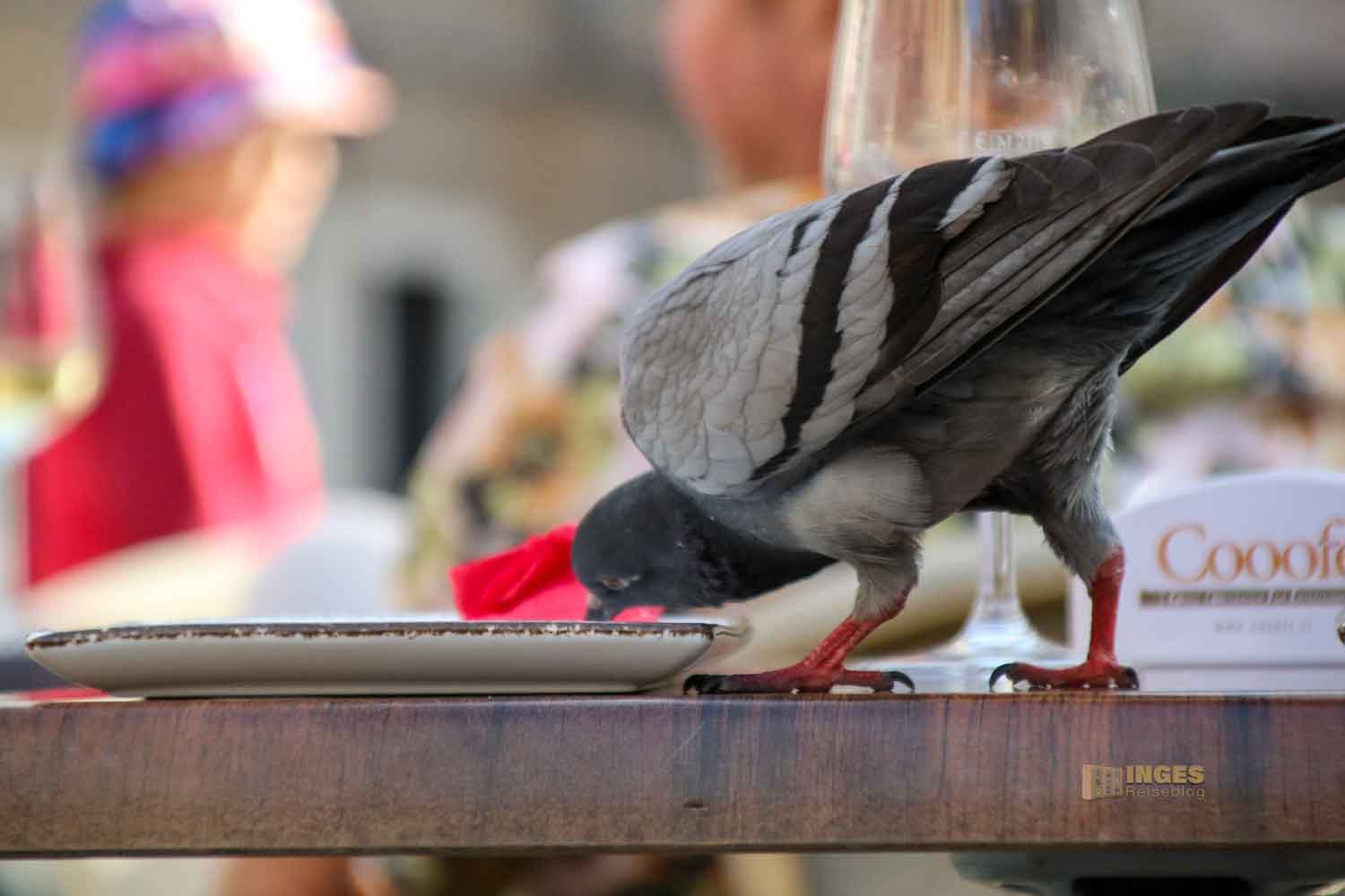 Egal, auf dem Campo Santa Maria Nova kam uns das kleine Cafè Ai Miracoli gerade richtig, um die Wartezeit bis zur Öffnung der Kirche zu überbrücken. Wir sind ja schließlich im Urlaub und sind ohne Eile unterwegs. Das war dann so ein Plätzchen, wo ich tatsächlich die Zeit hätte vergessen können. Ich gebs ja zu, ich beobachte gerne Leute (wer tut das nicht?). Hier waren es aber die Tauben, die sich um die Krümel auf den Teller gestritten haben. So ein ums andere Mal musste der Kellner sehr schnell rennen, um sein Geschirr (vor allem die Gläser) vor einem Aufprall auf dem Boden zu retten. In Venedig ist es bei Strafe verboten, Tauben zu füttern. Sie suchen sich dann halt ihr Futter am Tisch der Menschen. Auch wenn Emma und ich es versucht haben, das Gerangel der Tauben um den besten Krümel einzufangen, haben wir nicht geschafft, das Geschehen unverwackelt aufs Bild zu bekommen 😀 😀 Da ging es bei einer Taube schon besser 😉 Ich muss euch das einfach zeigen ....