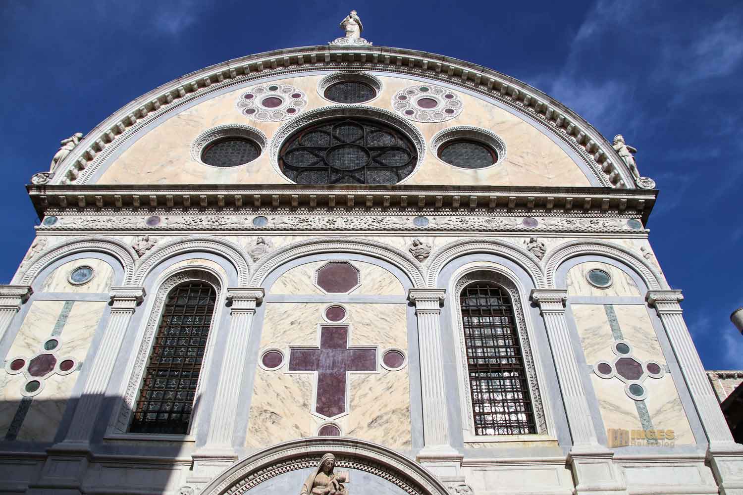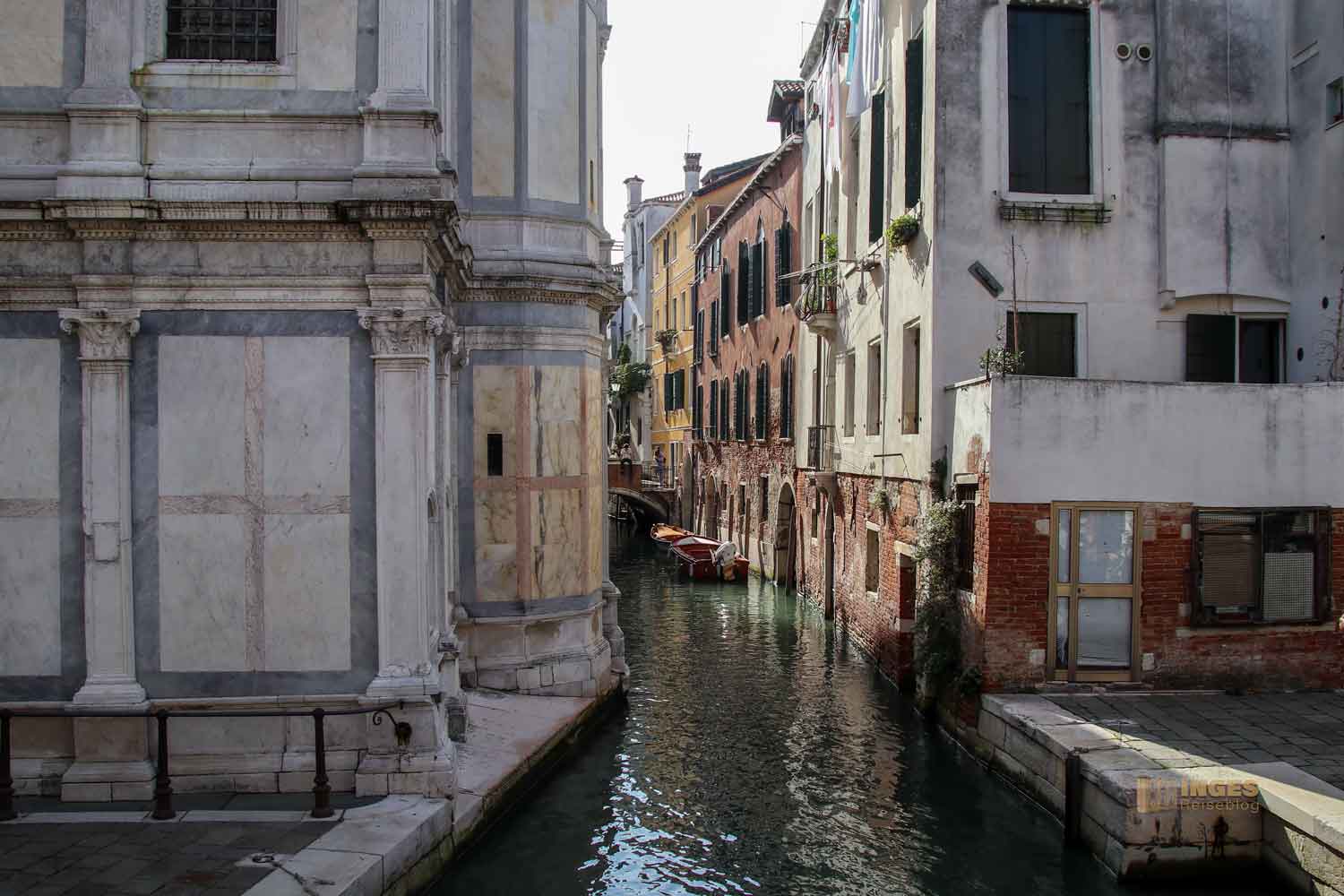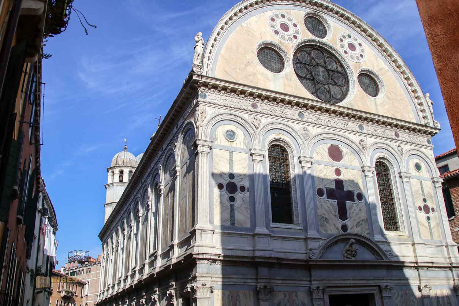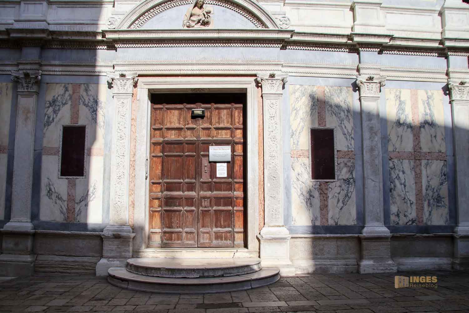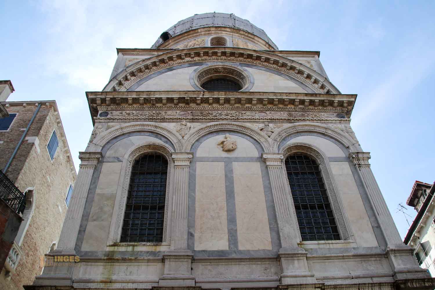 beginnt. Hier kann die Kirche mit zwei Alleinstellungsmerkmalen trumpfen. Zum einen ist es in Venedig eine von ganz wenigen Kirchen, die frei steht. Meist sind die Kirchen in Venedig entweder komplett an die anderen Häuser angebaut, oder grenzen zumindest mit einer Seite an andere Gebäude. Das ist hier nicht - würde man eine Front schwimmen, dann könnte man rund um die Kirche gehen. Das zweite Merkmal ist die Außenfront, die man in Venedig tatsächlich nur einmal so vorfindet - sie ist völlig mit Marmor verkleidet. Allein schon das macht neugierig sie dann auch im inneren zu sehen.