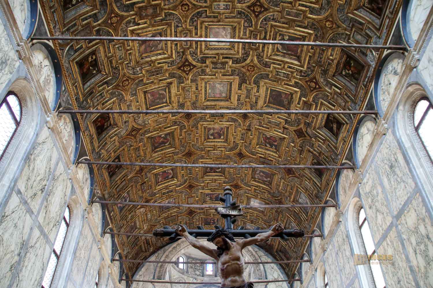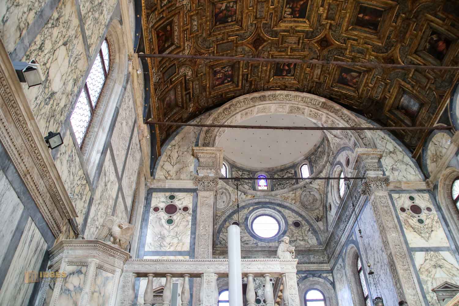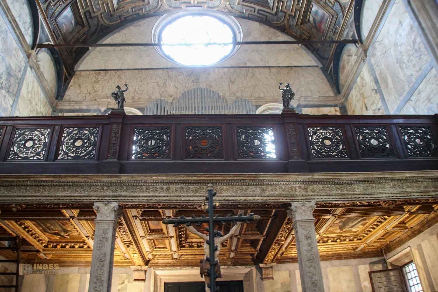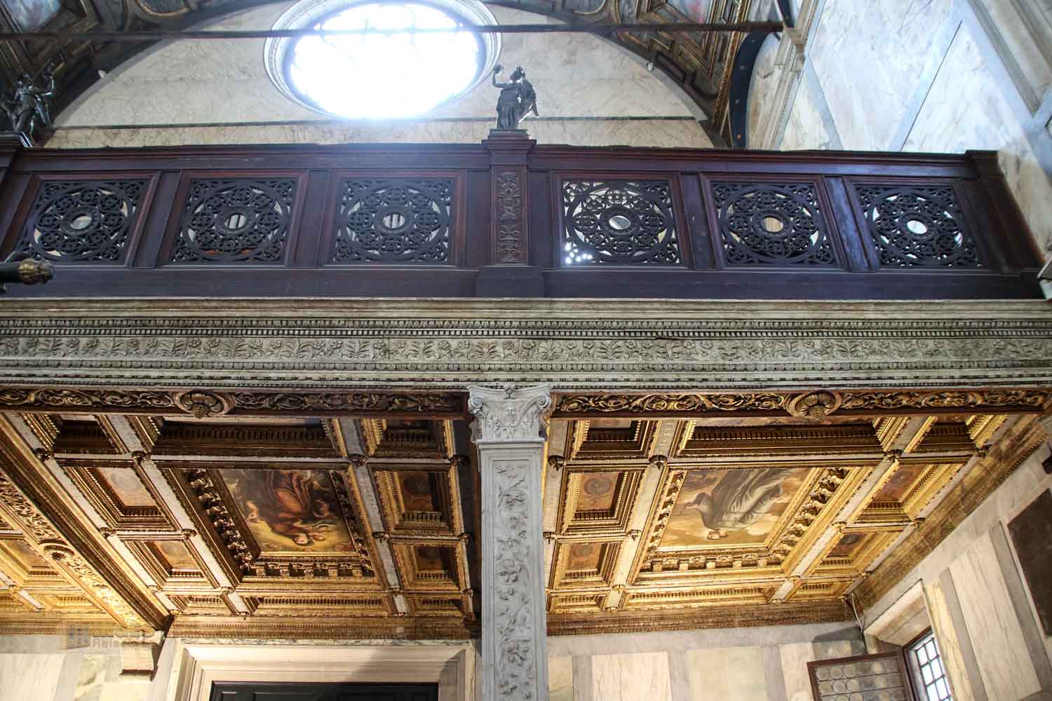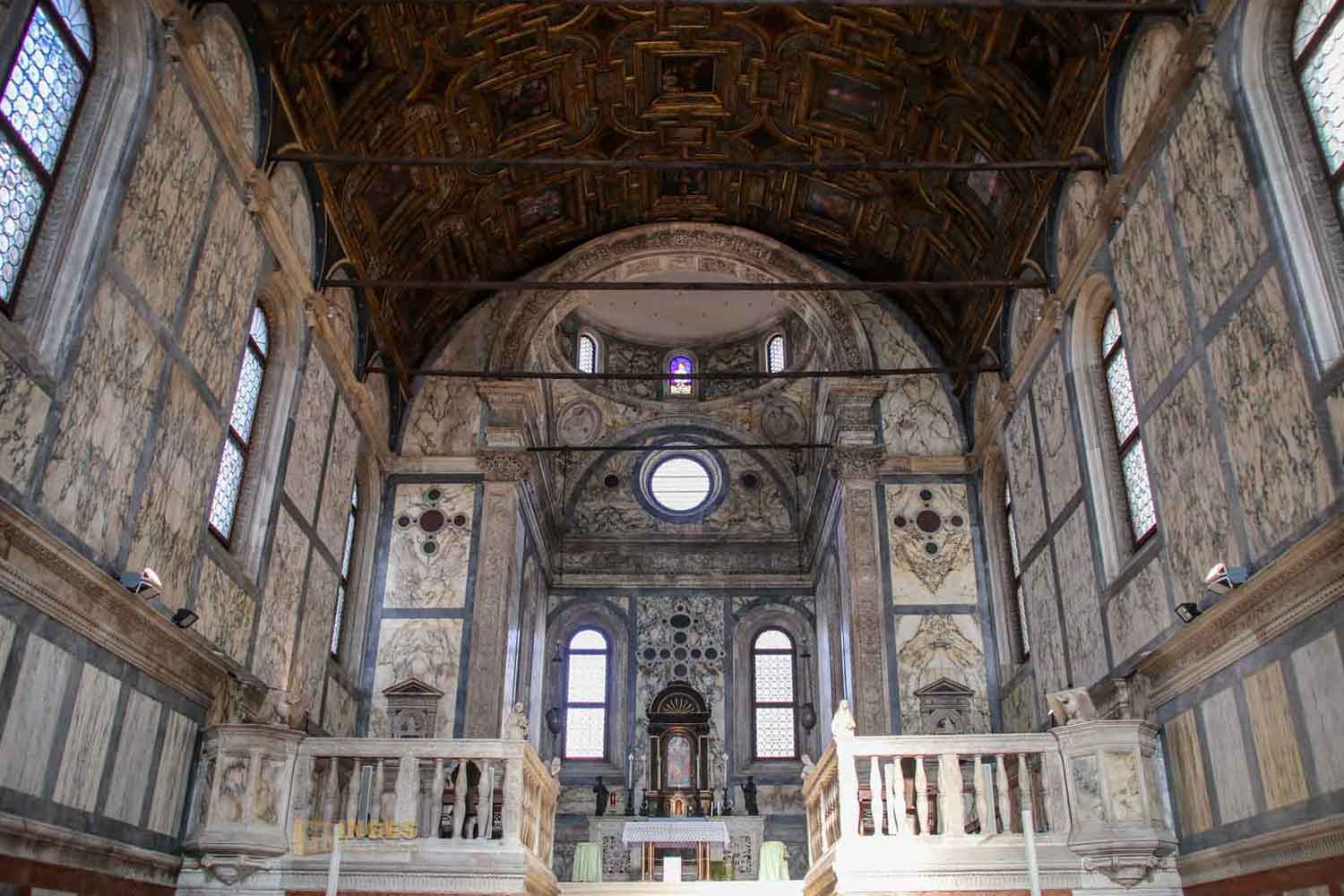 Die Kirche kostet eine kleine Eintrittsgebühr oder ist im Choruspass zur Besichtigung beinhaltet, aber ich finde, sie ist ein Muss bei den Kirchenbesichtigungen. Die Decke der Hochempore, die damals den Klarissinnen vom benachbarten Kloster vorbehalten war, ist eine Holzdecke von Ende des 16. Jahrhunderts. Auf diesen 'Balkon' führte ein Durchgang (den gibt es heute nicht mehr) zum Kloster. Auch wenn viel vom Aussehen der Kirche dem Baumeister Pietro Lombardo oder seinen Söhnen zugerechnet werden kann, an dieser wunderschönen Holzdecke hatten andere Künstler aus dem Veneto ihre Hände dran.