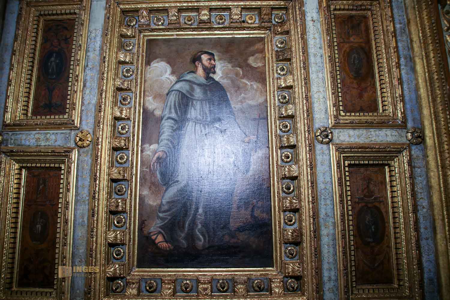 Im mittleren Kassettenfeld ist die Madonna mit ihrem Kind dargestellt, links von ihr (in Blickrichtung Kircheninneres) wie noch weitere Male in der Kirche, der Ordensgründer der Klarissen, der Hl. Franziskus. Ich glaube zu ihm braucht man keine Erklärungen, jeder kennt ihn und seinen berühmten Sonnengesang. Wer doch mehr über ihn lesen möchte, der klickt bitte HIER.