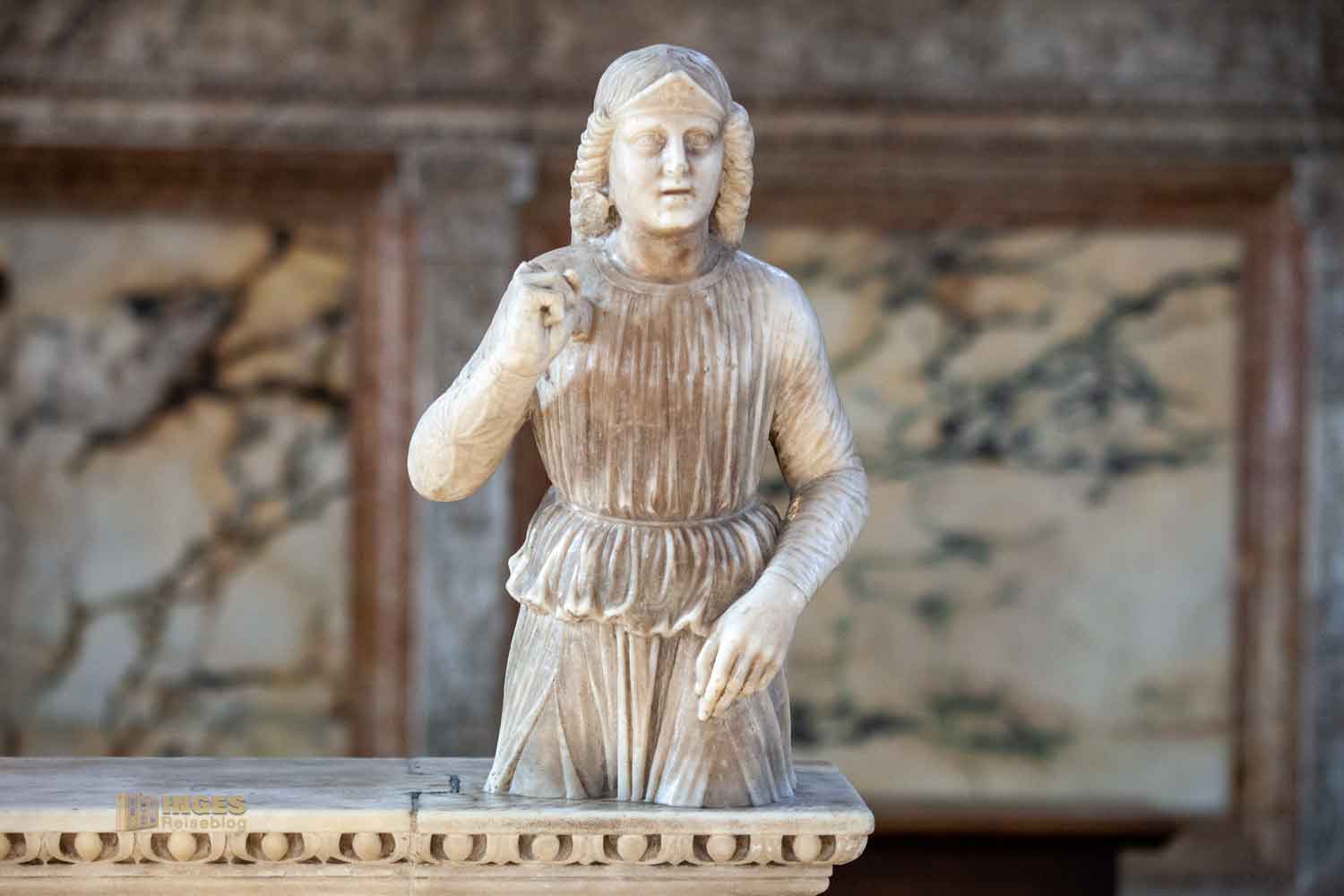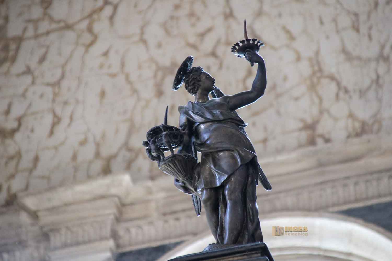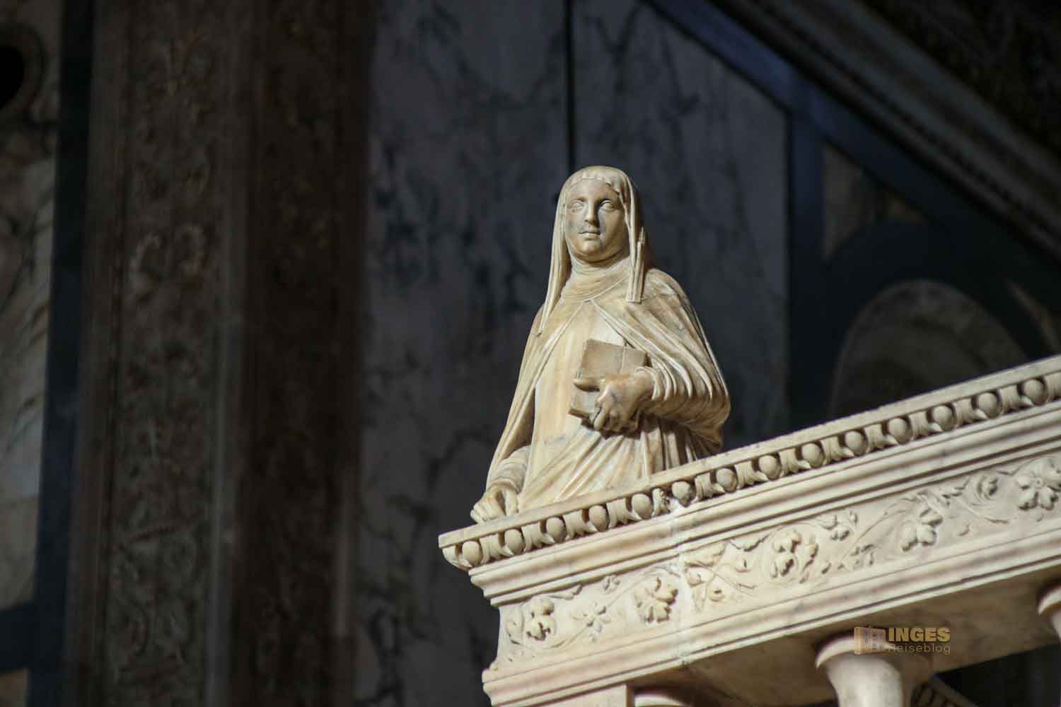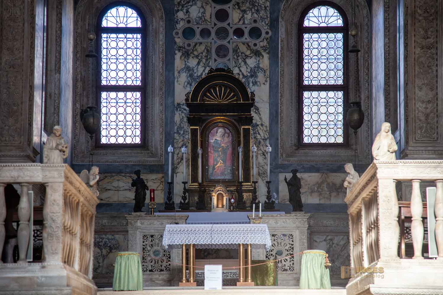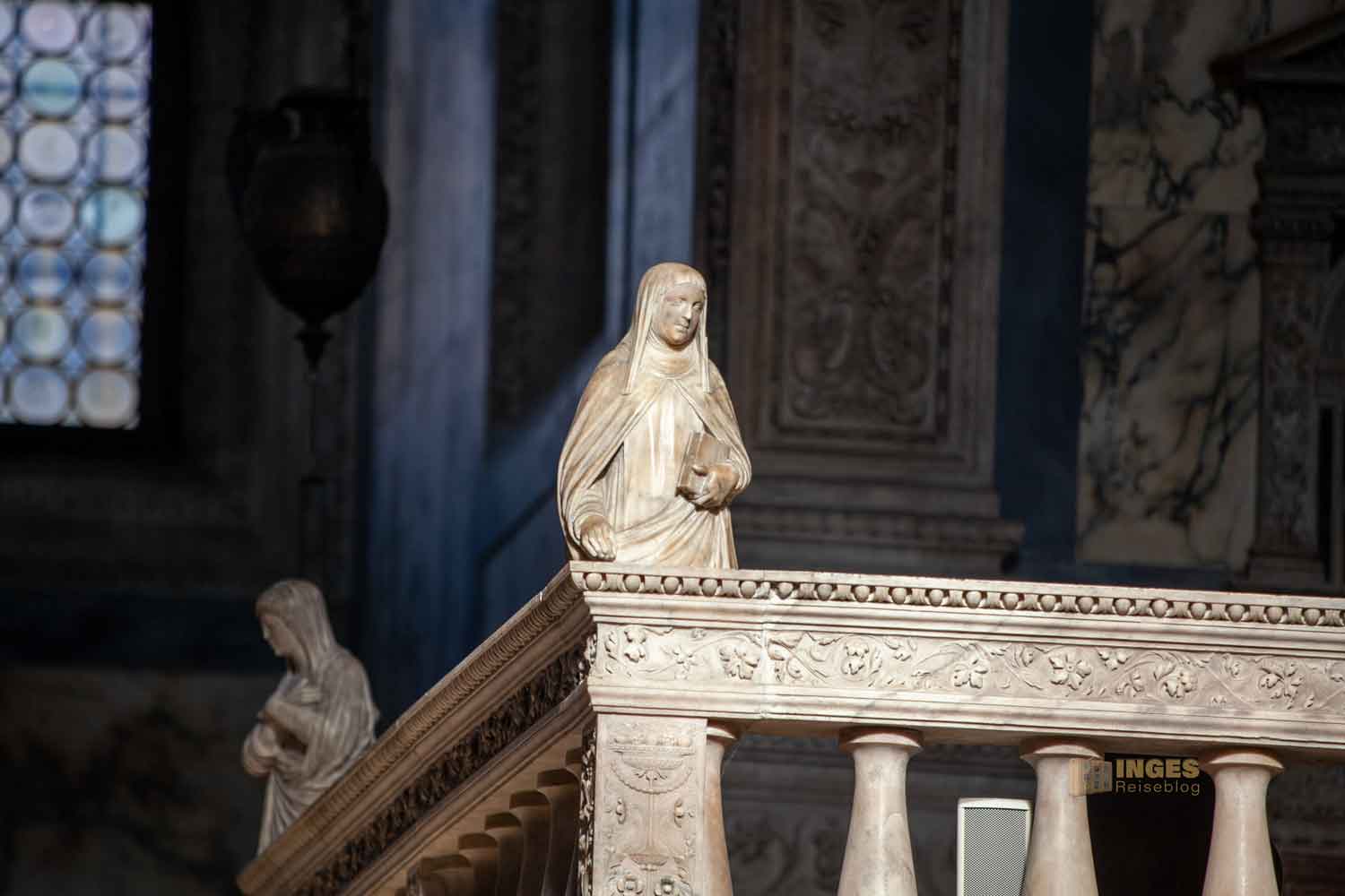 Die Hl. Chiara und der Hl. Franziskus zeigen sich in voller Größe noch jeweils unter dem Ambo. Wunderschön auch das Marmorrelief von Pietro Lombardo, das den Sockel im Altarraum ziert.