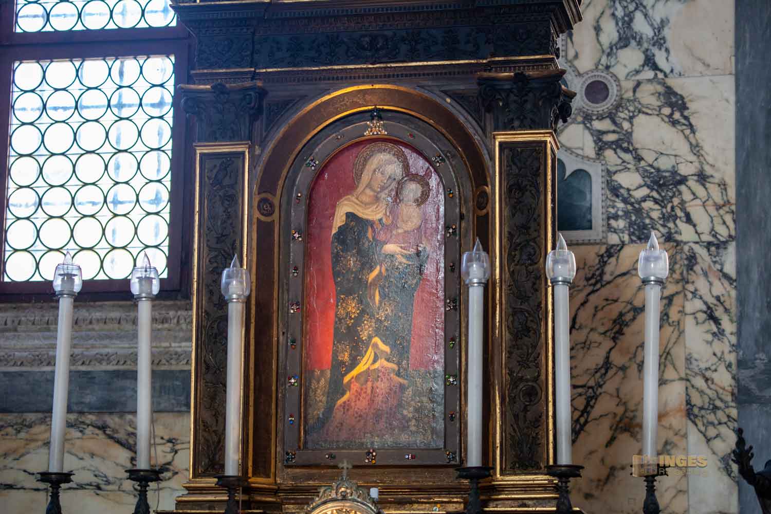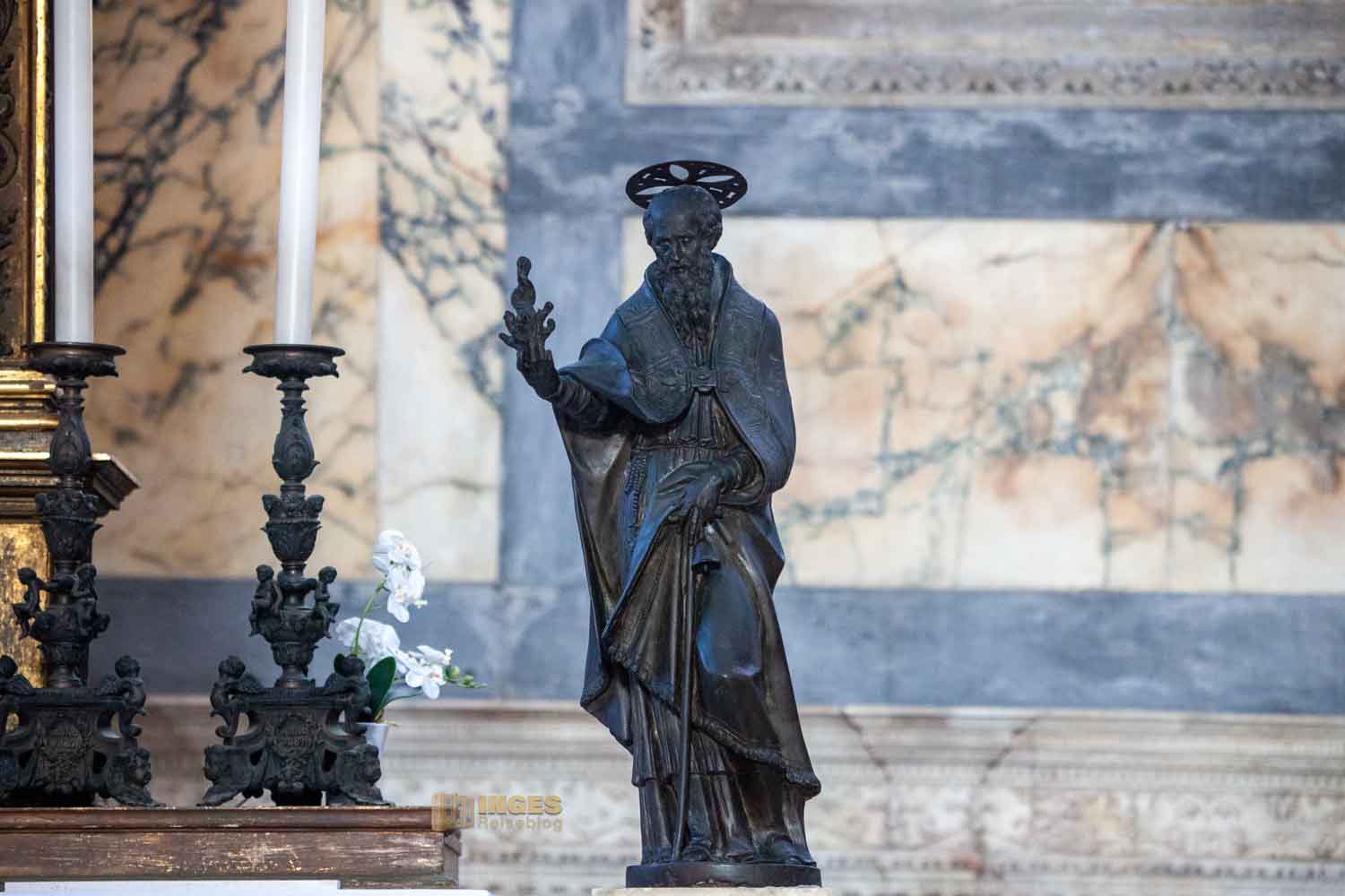 Fast könnte man versucht sein, die Kirche als 'schlicht' zu bezeichnen. Wenn man damit üppige und viele Seitenaltäre meint, dann trifft das zu 100% zu. Aber ich kann diese Kirche alles andere als 'schlicht' nennen. Für mich hat sie einen Touch von etwas edlem durch den Marmor - für die Muttergottes das Beste! Und manchmal bin ich wirklich dankbar, wenn man sich in einer Kirchenausstattung auf das Wesentliche konzentriert. Trotzdem gibt es noch weitere Blickfänge in der Chiesa.