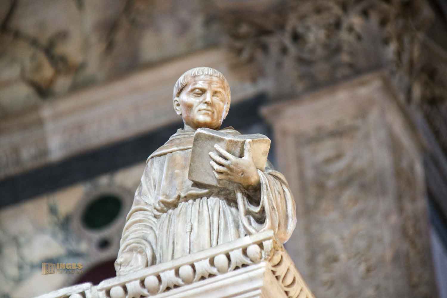Ein Adler ziert jeweils das Pult. Jeder Treppenaufgang zeigt auf der Balustrade zu jeder Seite zwei Statuen, die der Sohn des Baumeisters, Tullio Lombardo im 16. Jahrhundert für die Kirche gefertigt hat. Rechts vorne ist die Hl. Chiara zu sehen - ihr gegenüber unverkennbar der Hl. Franziskus. Im Hintergrund der Erzengel Gabriel und Mariä Verkündigung.