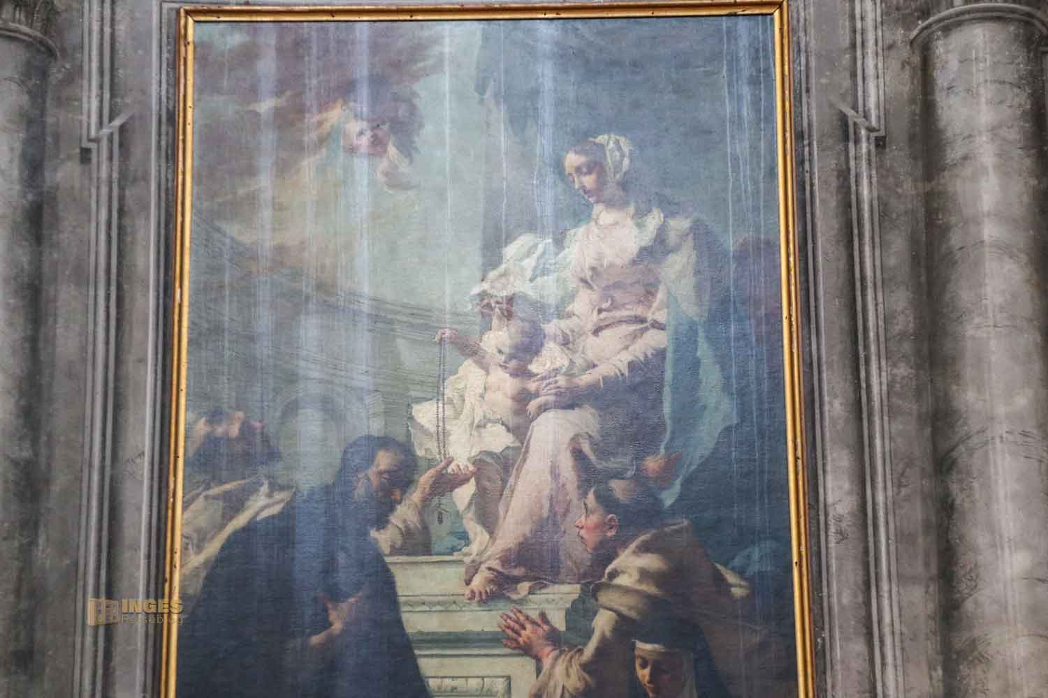 Francesco Daggiù hat es auf Kosten eines privaten Spenders gemalt. Der Hl. Vinzenz Ferrer, Gründer des Dominkanerordens soll mit der Rosenkranzmadonna im Mittelpunkt des Gemäldes stehen. Nein, nein - da muss auch noch die Hl. Teresa von Avila mit aufs Bild, schließlich ist auch sie eine Ordensgründerin. Der Orden der unbeschuhten Karmelitinnen geht auf sie zurück. Und dann bezahlt der Unbekannte eine große Summe, damit die Heilige auch mit aufs Gemälde kommt. Irgendwie für mich ein bisschen zusammengewürfelt, da ich zwischen dem Hl. Vinzenz und der Hl. Teresa keine Verbindung finden konnte. Es soll aber aufgrund der Darstellung mit Licht und Dunkel als das Meisterwerk der Kirche gelten. In Venedig könnt ihr am Zattere-Kai die Kirche Santa Maria dell Rosario besuchen, die ganz der Rosenkranzmadonna gewidmet ist.