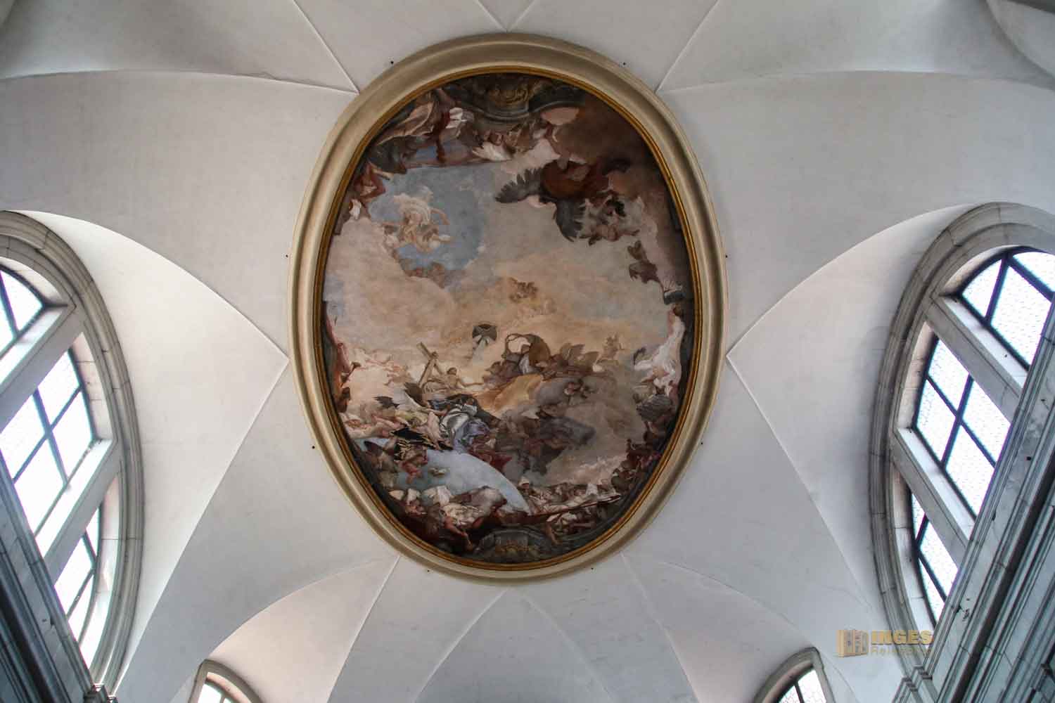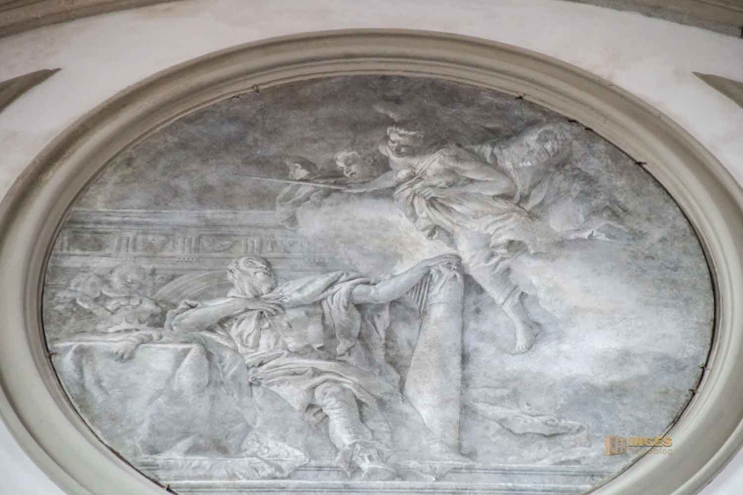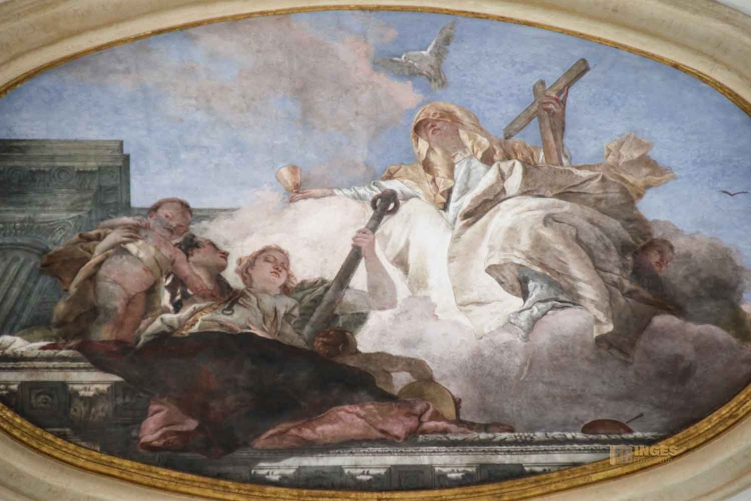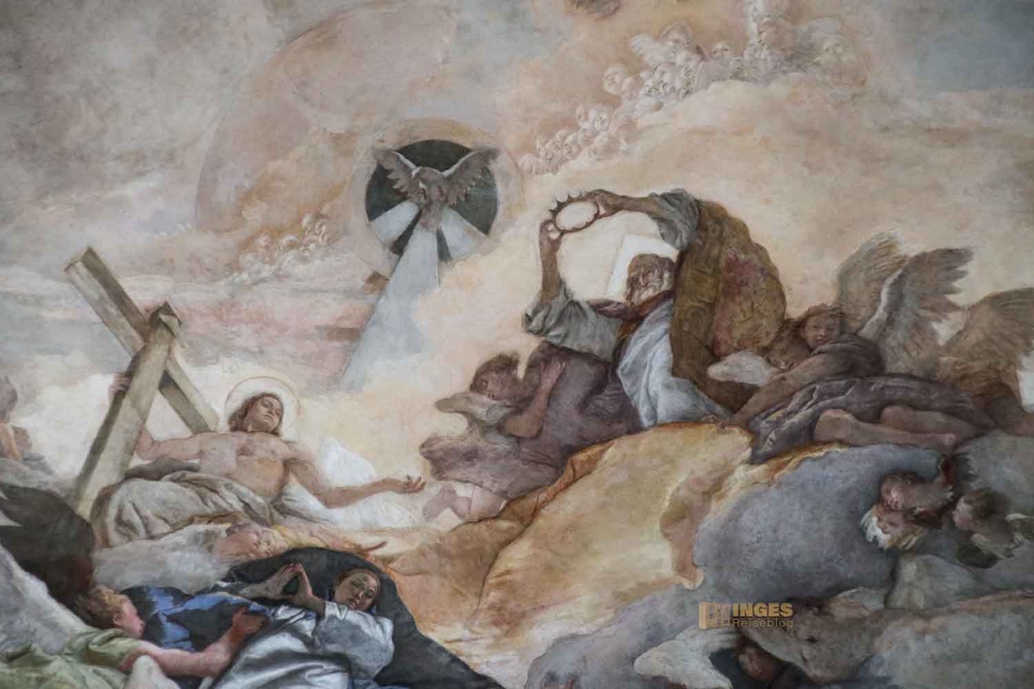 spiegelt die Form der Kirche wieder. In dem ovalen Fresko stellt Giovanni Battista Tiepolo, einer der bedeutendsten Maler in Venedig des ausklingenden Barocks, die Krönung Mariens dar.