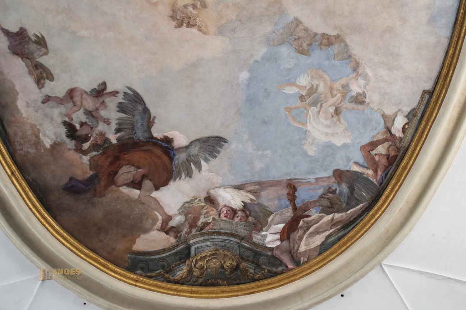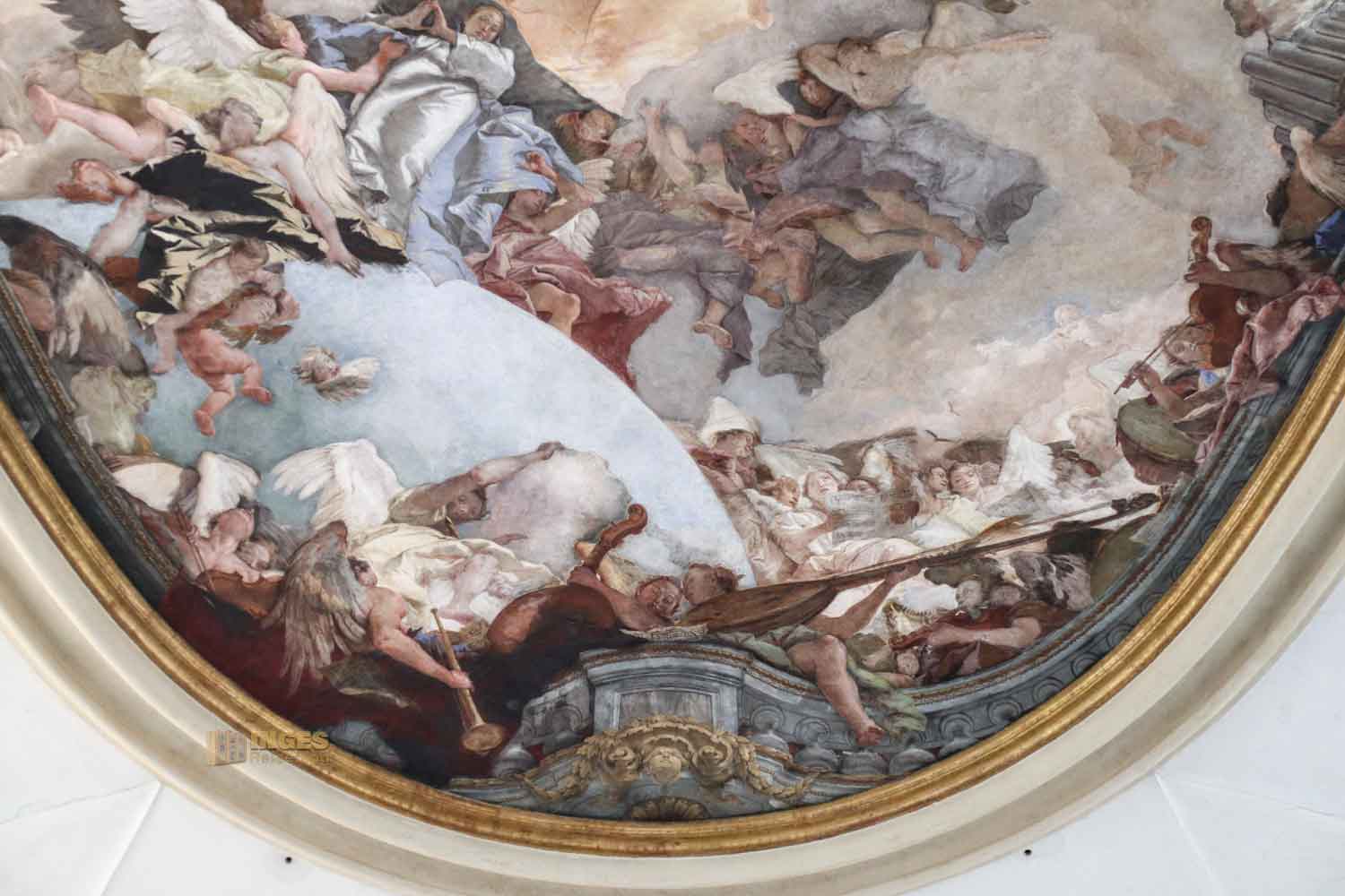 Aber nicht nur das, er greift das Thema des Ospedale auf, die musikalische Erziehung der jungen Mädchen, und stellt die Musik in seinem Fresko so dar, wie sie im Ospedale gelehrt wurde. Der Chor der Mädchen und die Instrumente die dort gespielt wurden, vorwiegend waren das Saiteninstrumente.