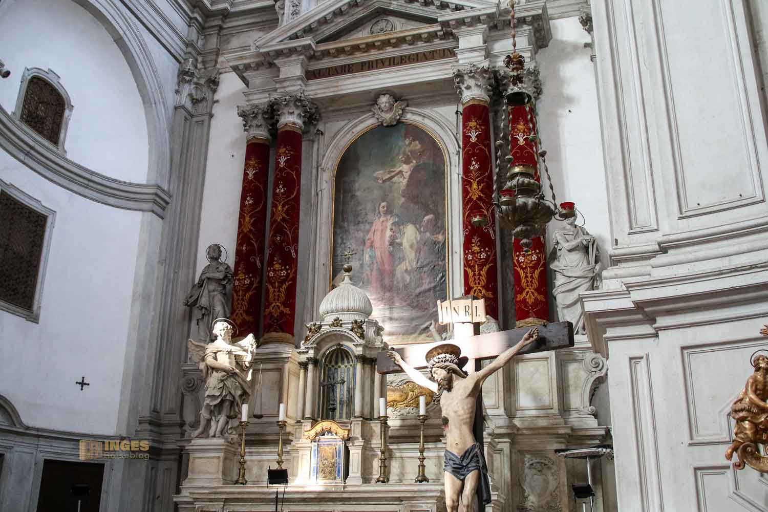 bei der ihr entgegen den sonst üblichen Außenfotos in diesem Bericht keine bekommt. Ihr wisst ja, ich mag kein 'schmückendes Beiwerk' in Form von Menschen auf meinen Fotos (nur wenn es absolut nicht anders geht). Hier auf dem langen Kai ist es aber schlicht unmöglich, keine Menschen aufs Foto zu bekommen. Ihr erkennt die Kirche aber trotzdem. Geht einfach noch ein Stückchen nach dem Denkmal Vittorio Emanule II. weiter, es ist die einzige Kirche am Riva. Wenn ihr Glück habt, denn die meisten Kirchen haben Mittagspausen, dann seht ihr die geöffnete Kirchentüre, evtl. noch kombiniert mit einem Plakat, welches für ein Konzert einlädt.