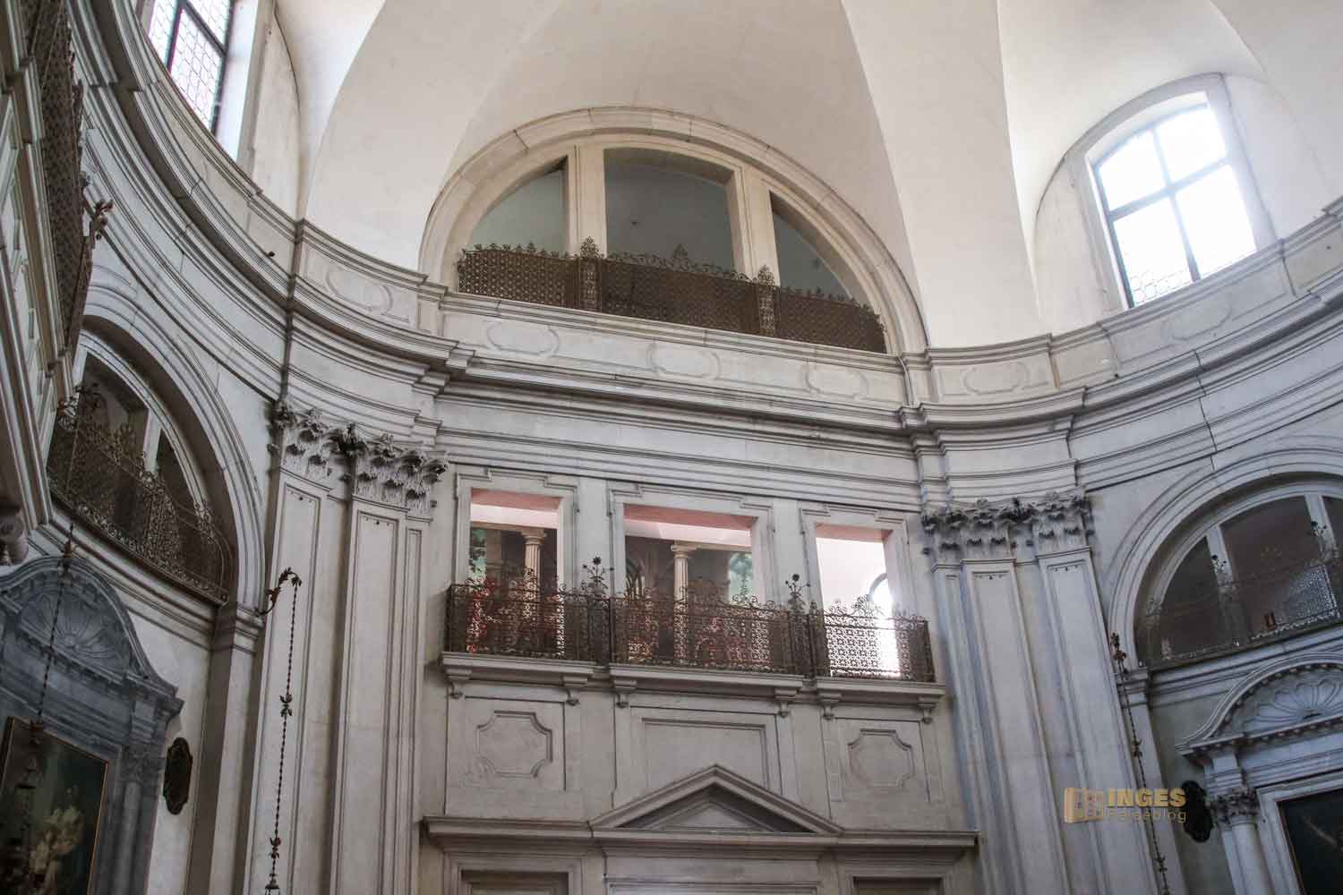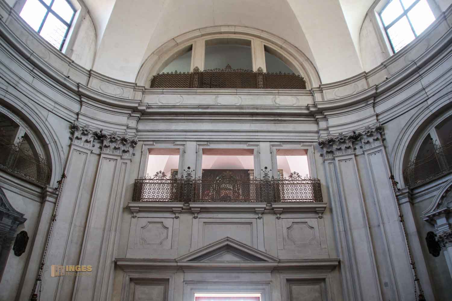 Auch die Innengestaltung hat Massari vorgenommen. Zeigt sich die Kirche nach außen in einer rechteckigen Form, so ist das Innere der Kirche im Oval gebaut. Mein erster Blick geht zum