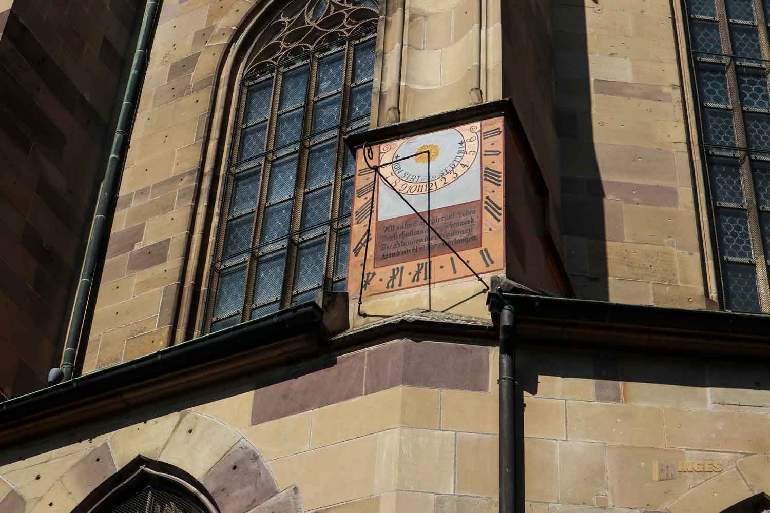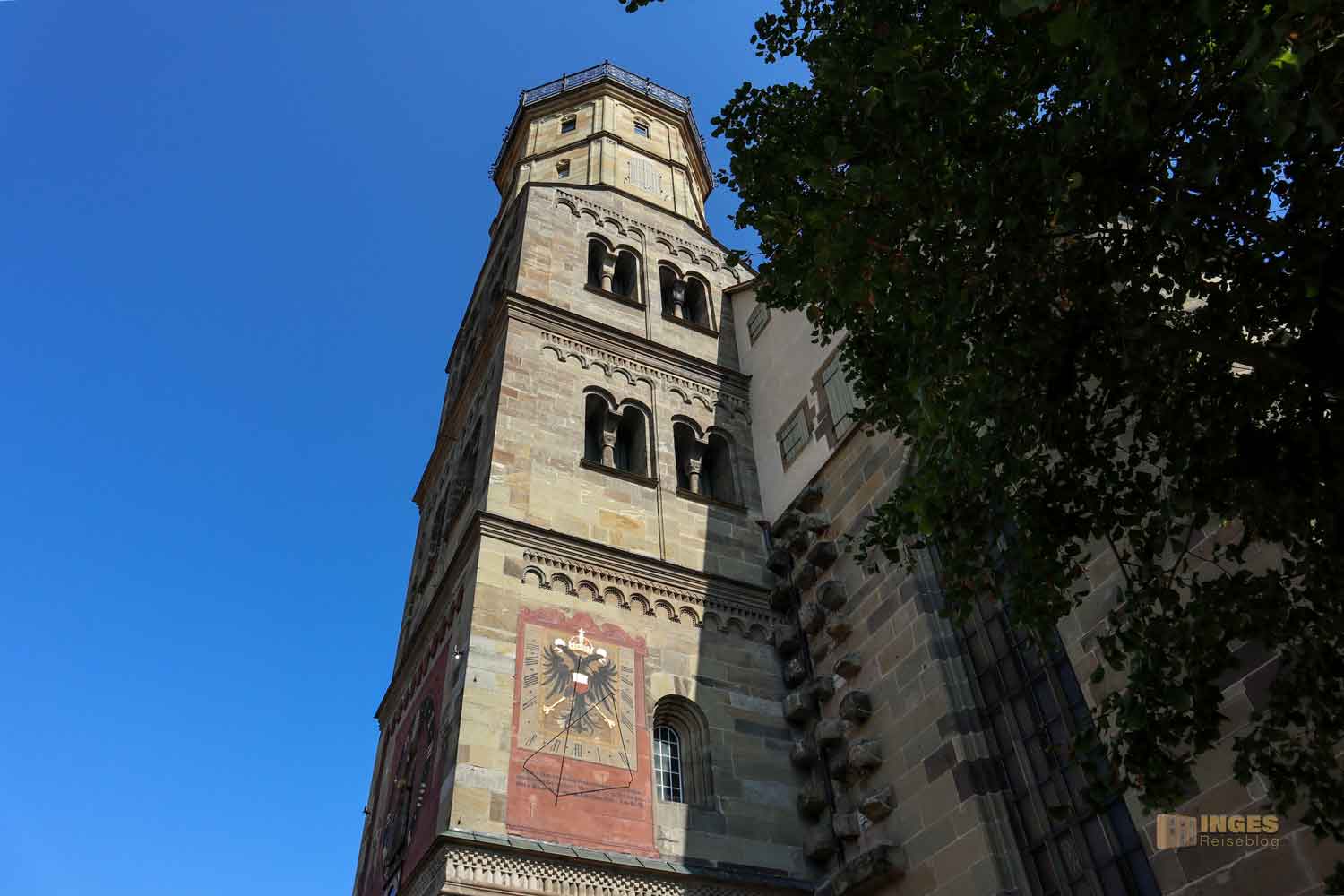 Der Erzengel Michael, der der Kirche den Namen gegeben hat, überblickt von oben ob auf dem Marktplatz auch alles gerecht zugeht. Leider hatte er an unserem Besuchstag so gar keinen Überblick, und ich keinen Blick auf ihn. Er war im Zuge von Bau- oder Renovierungsarbeiten eingerüstet. Freie Sicht dagegen gibt es auf die Astronomische Uhr am Kirchenturm. Sie erinnerte mich spontan an unseren Aufenthalt in Prag Ende Juni. Am Altstädter Rathaus in der Altstadt von Prag ist auch eine angebracht. Die ist aber halt schon noch ein bisschen aufwändiger gestaltet 🙂