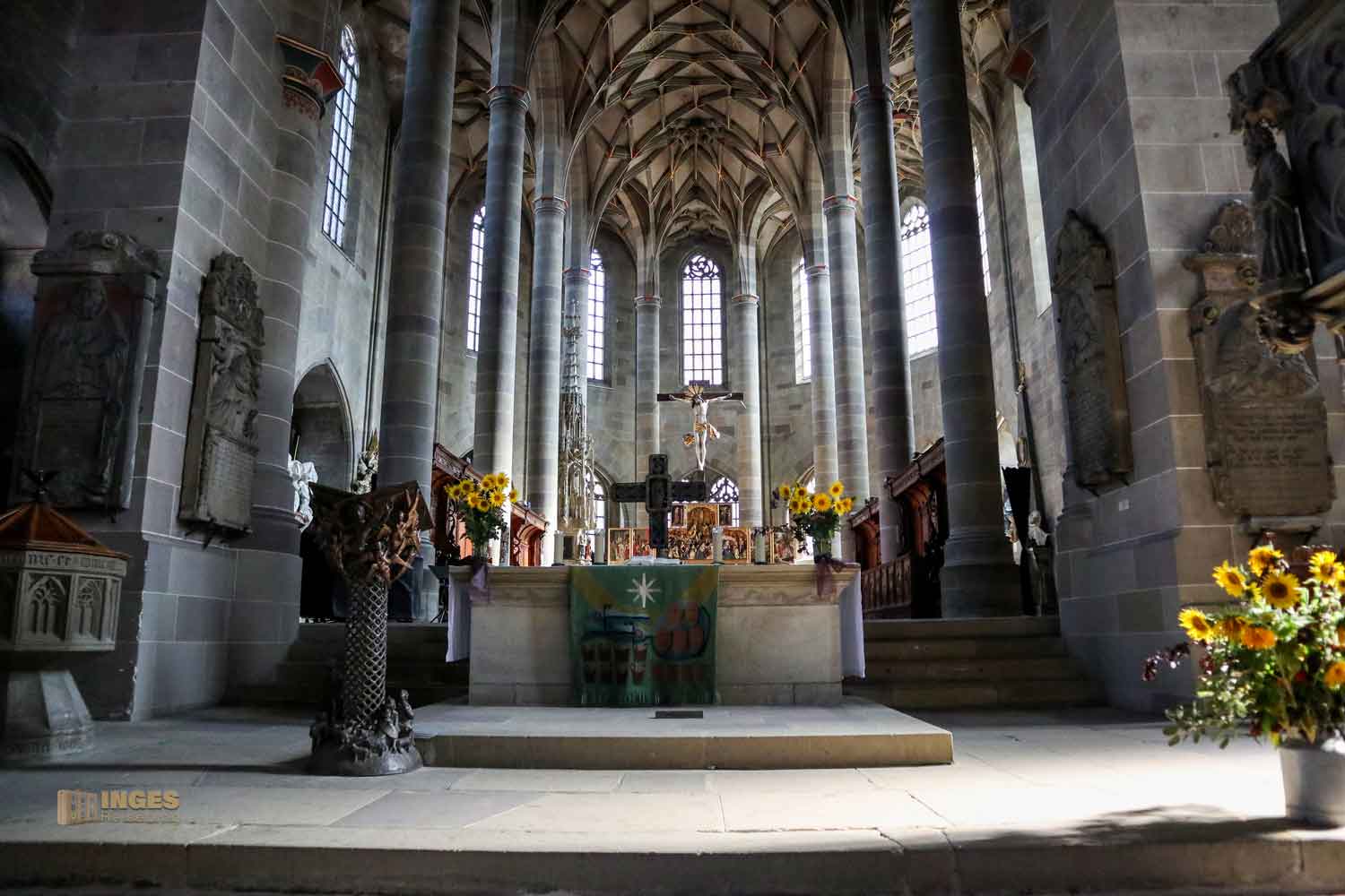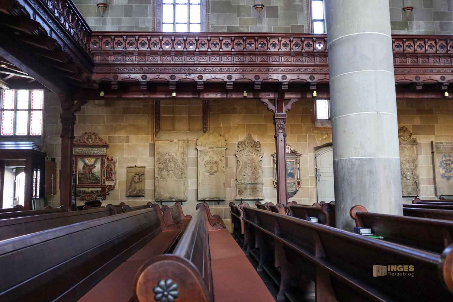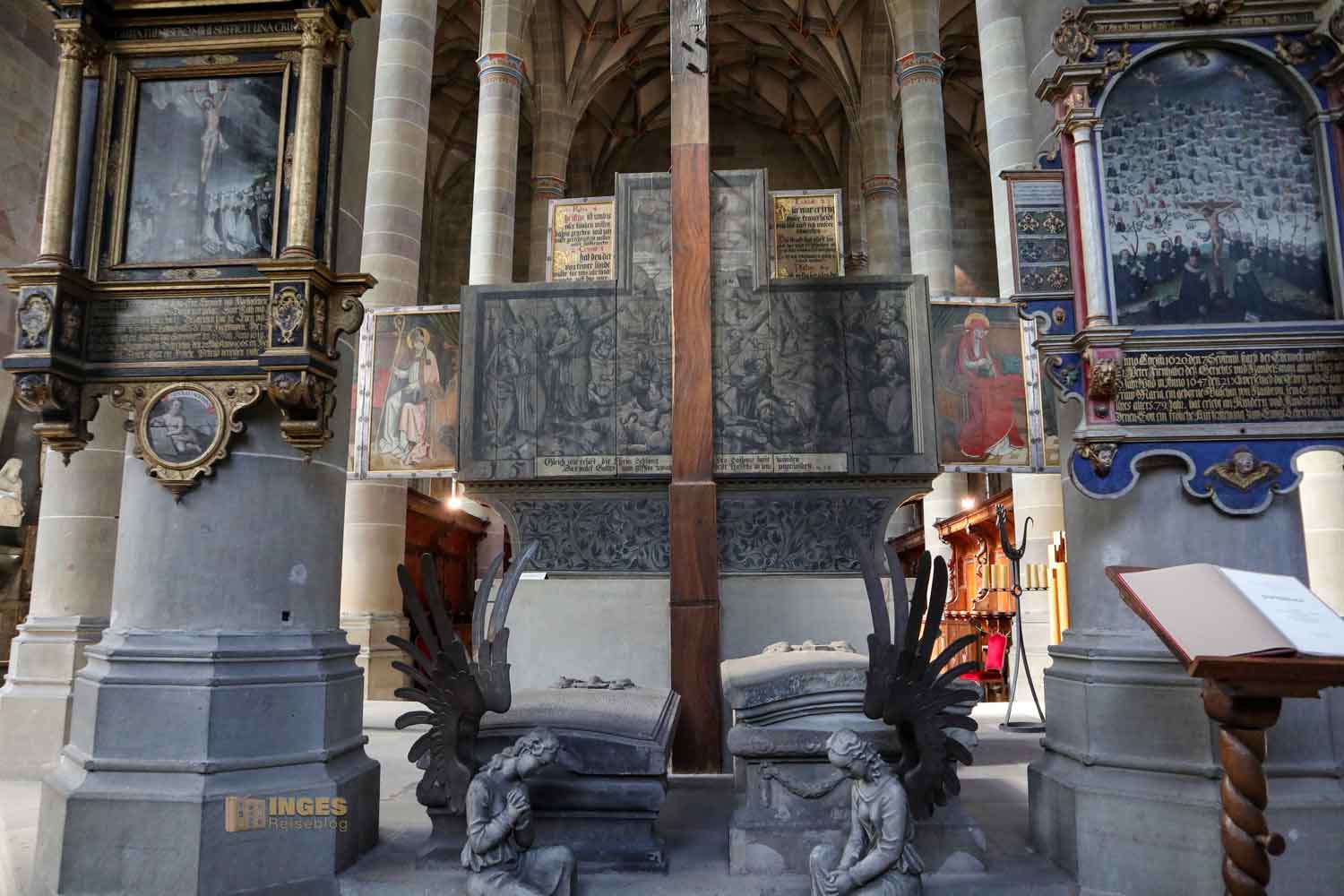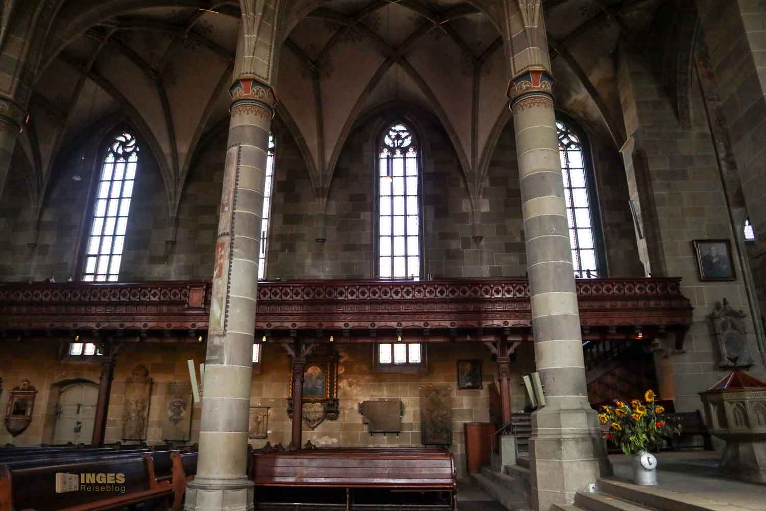 Im Langhaus ist unübersehbar das Hl. Grab von 1455/56 und 1510 und in der Michaelskapelle (Sakristei) der Michaelsaltar von 1520. Der Kanzel und dem vordere Altar mit seinem Lesepult sollte man auch einen Blick schenken. Kommt einfach mit mir durch die Kirche ...