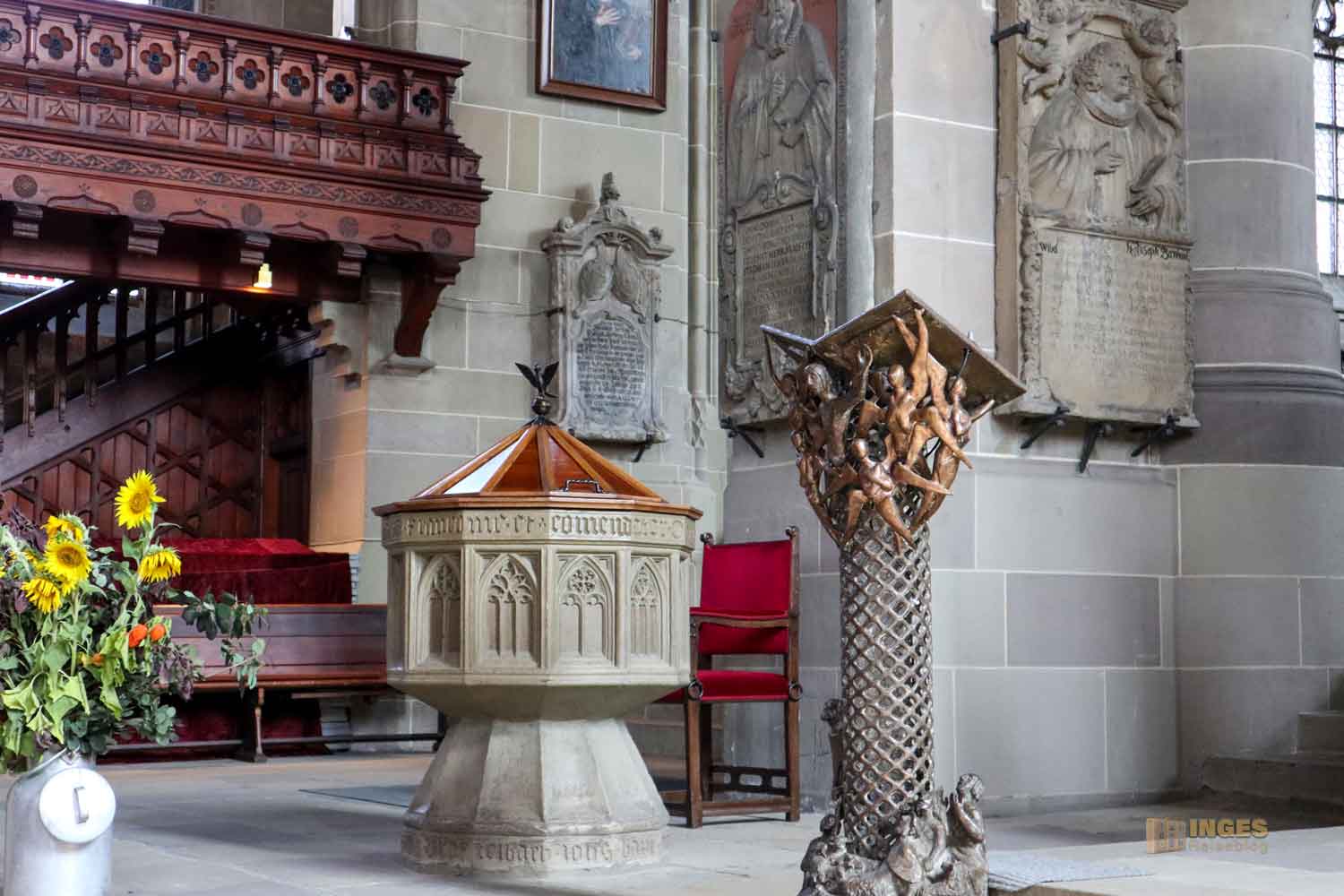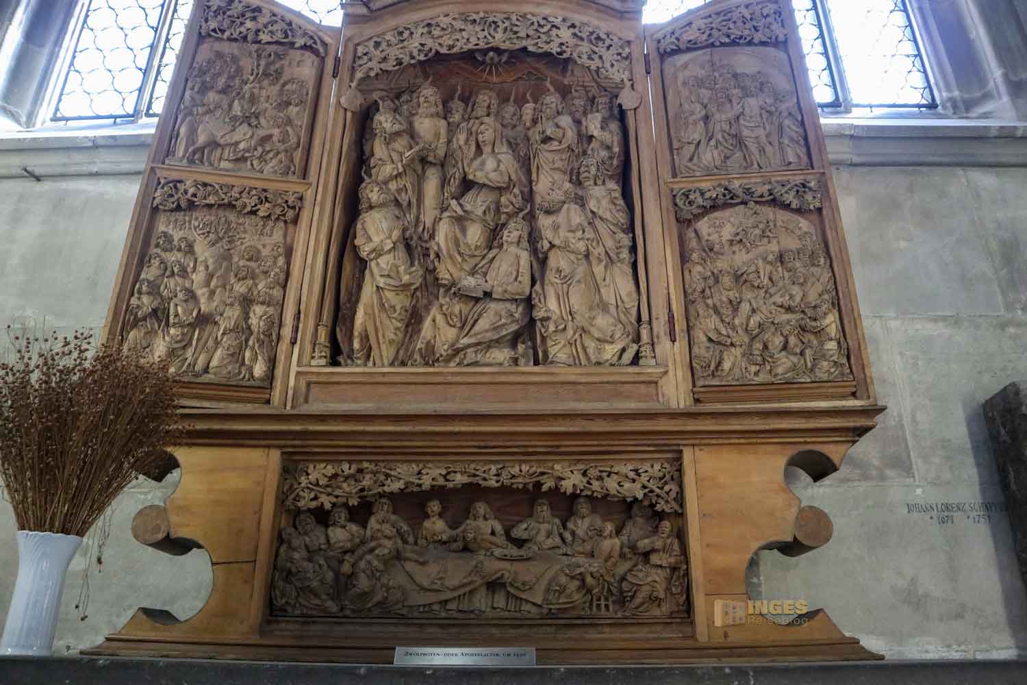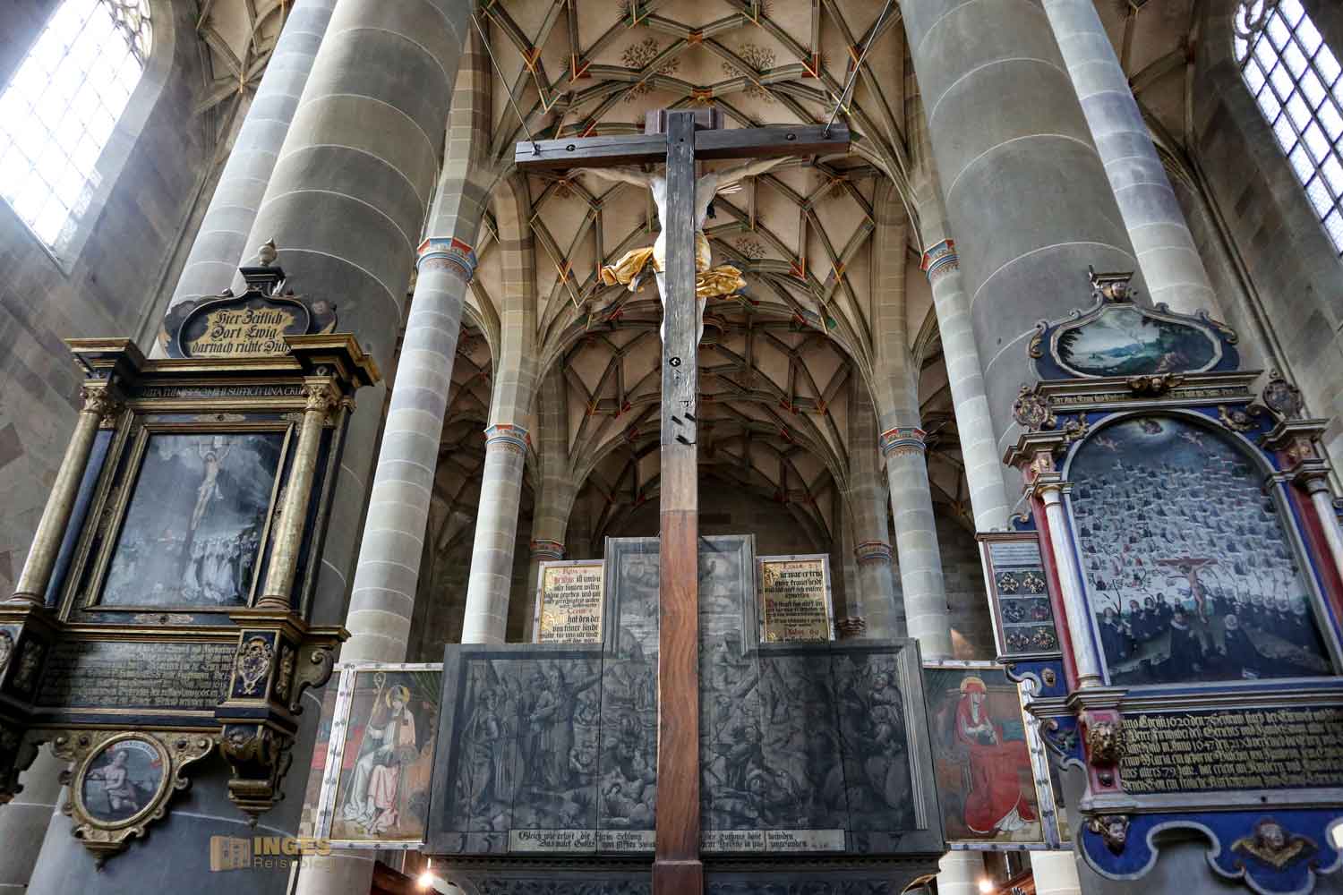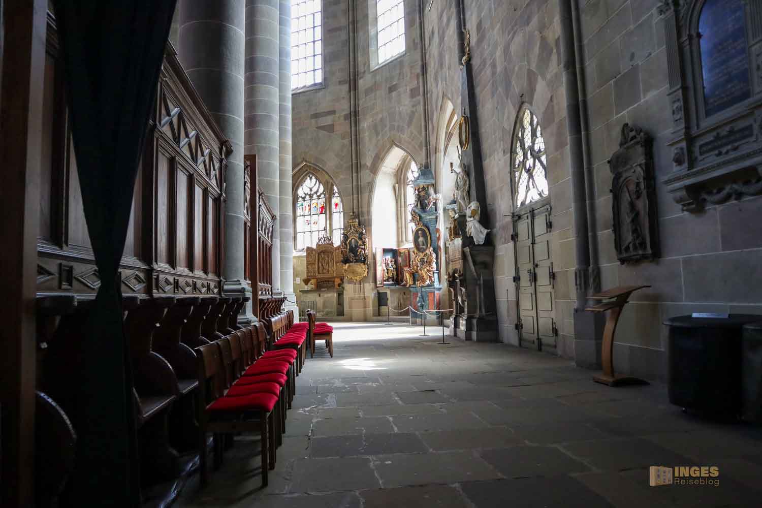 Im Langhaus ist unübersehbar das Hl. Grab von 1455/56 und 1510 und in der Michaelskapelle (Sakristei) der Michaelsaltar von 1520. Der Kanzel und dem vordere Altar mit seinem Lesepult sollte man auch einen Blick schenken. Kommt einfach mit mir durch die Kirche ...