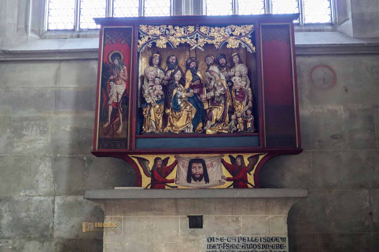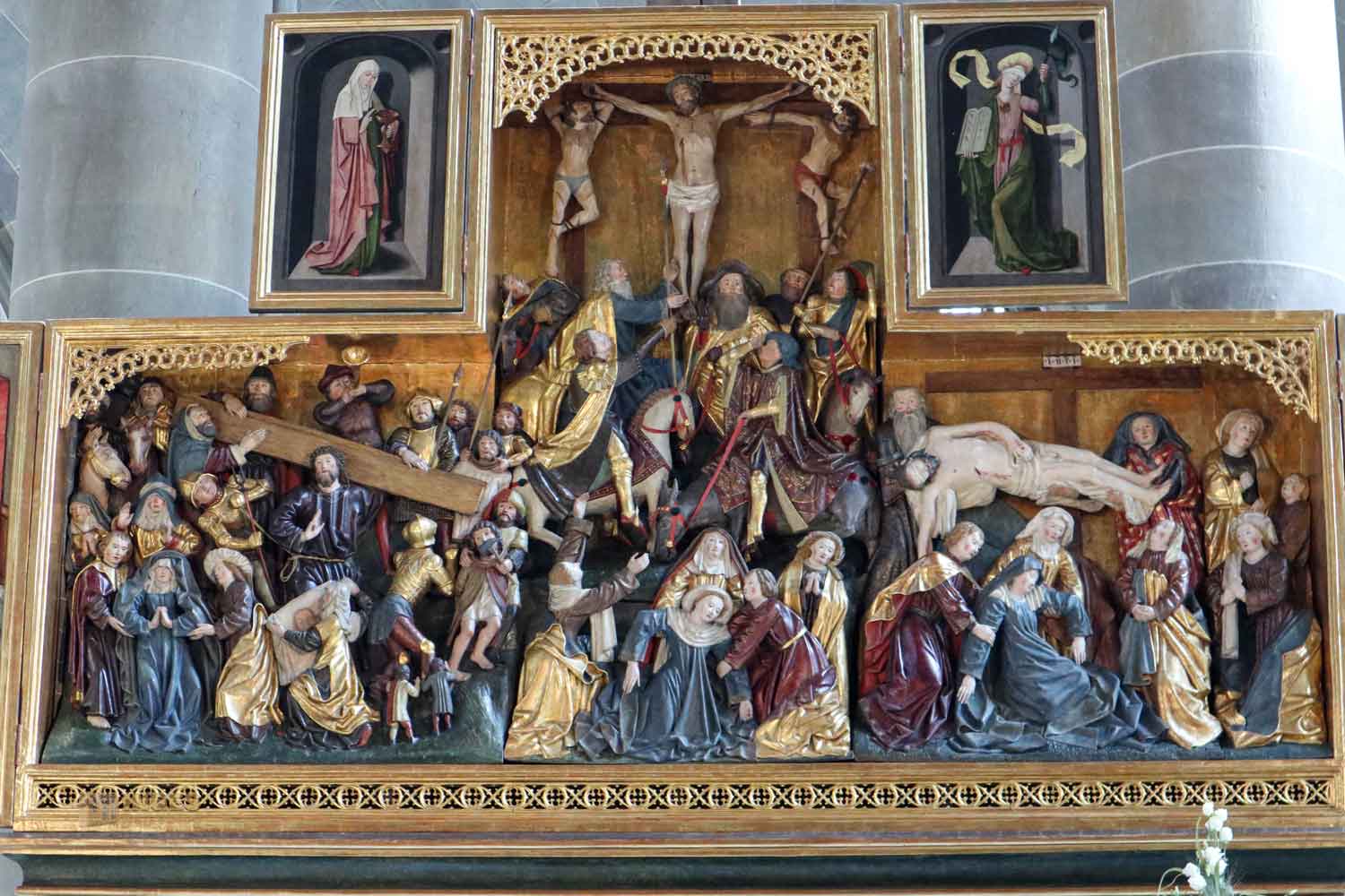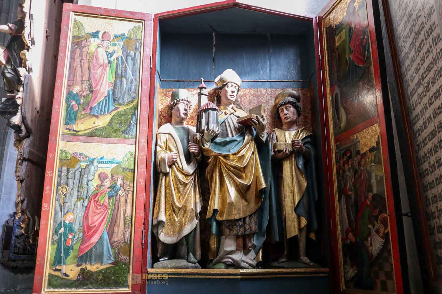 im Chor stammt von 1460 und ist etwas ganz Besonderes. Er zeigt die Passion und Auferstehung Jesu. Wir hatten Glück und der Flügelaltar, der von einem niederländischen Künstler stammen soll, war geöffnet. Der Altarschrein zeigt in geschnitzten Figurengruppen Szenen aus der Kreuzigung.