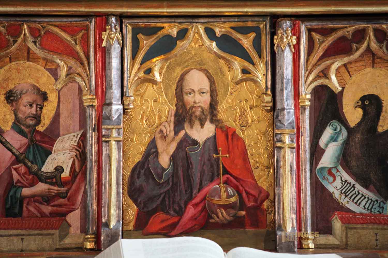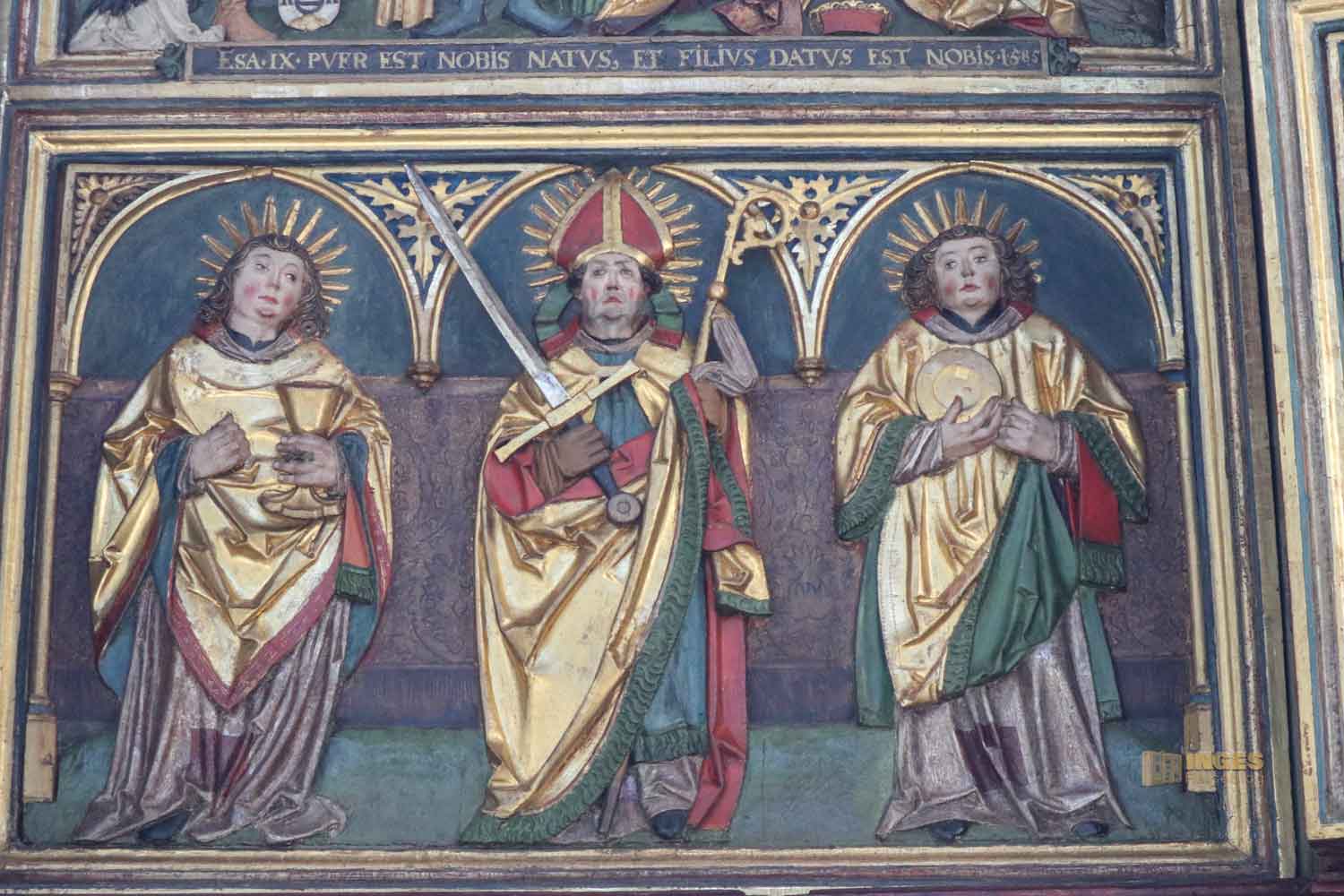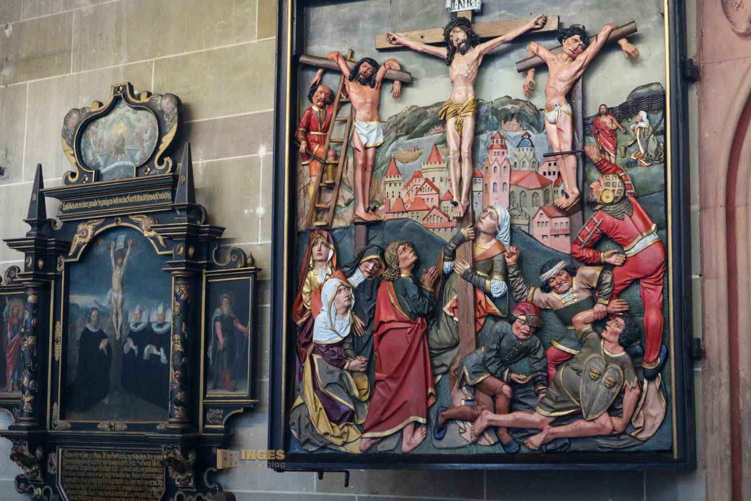 im Chor stammt von 1460 und ist etwas ganz Besonderes. Er zeigt die Passion und Auferstehung Jesu. Wir hatten Glück und der Flügelaltar, der von einem niederländischen Künstler stammen soll, war geöffnet. Der Altarschrein zeigt in geschnitzten Figurengruppen Szenen aus der Kreuzigung.