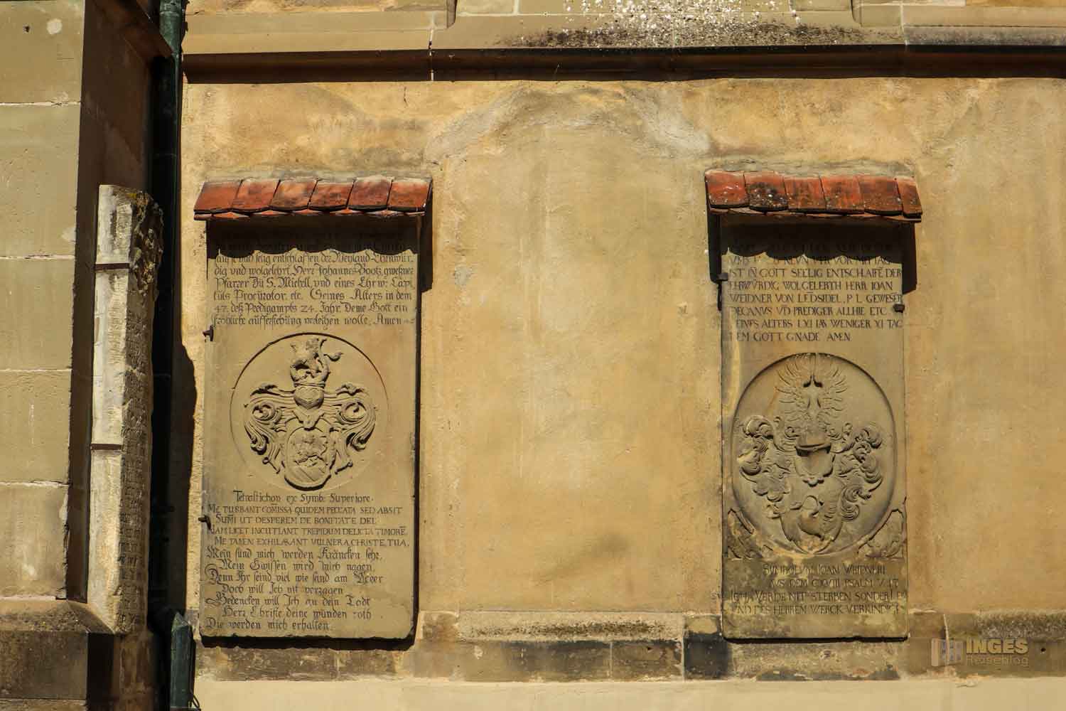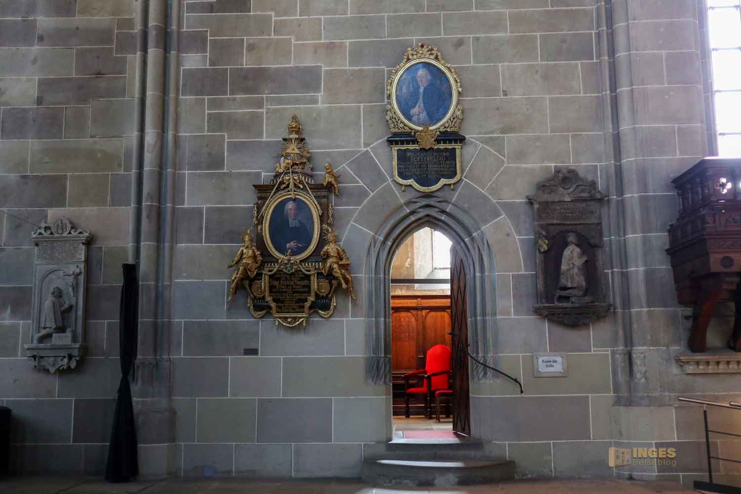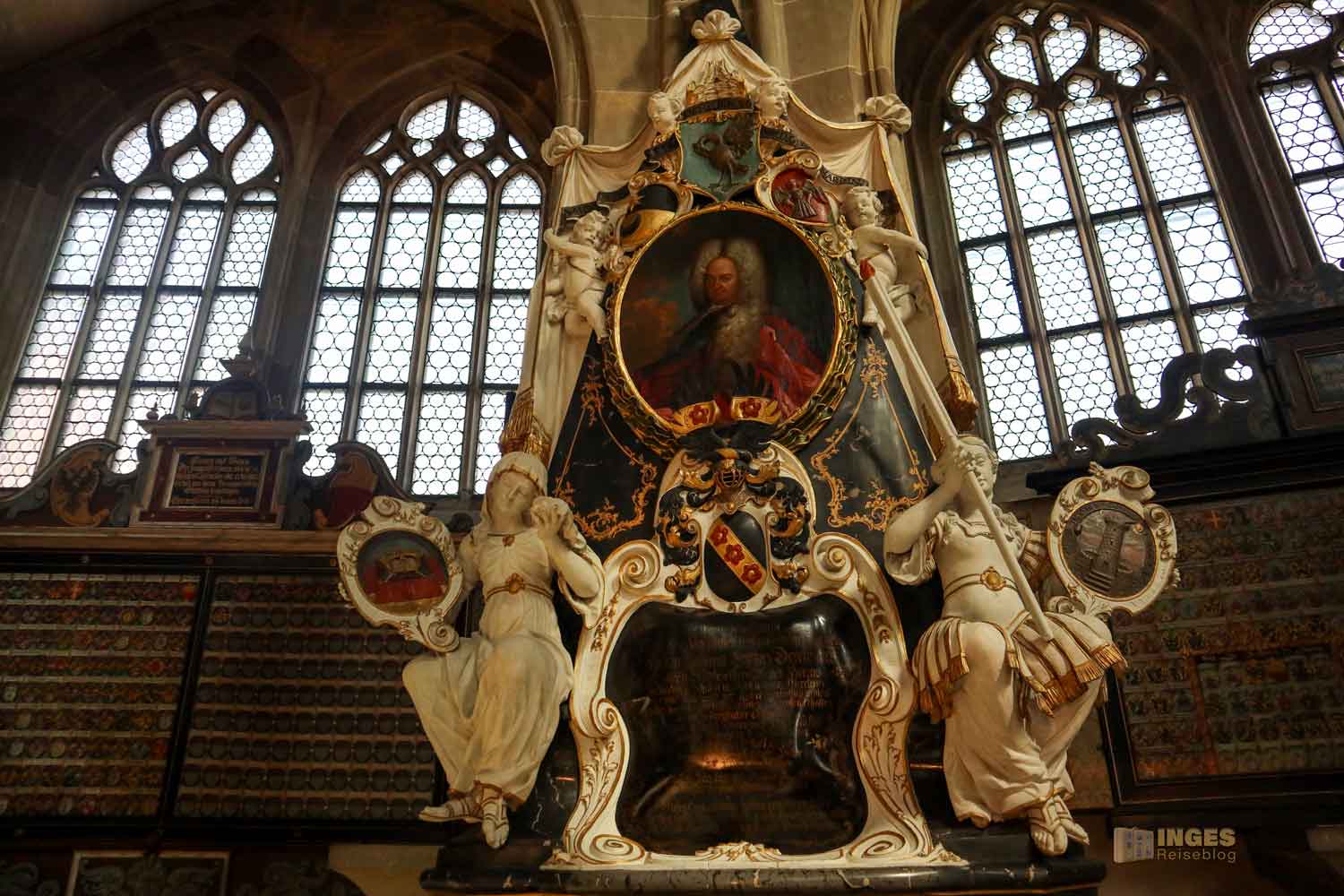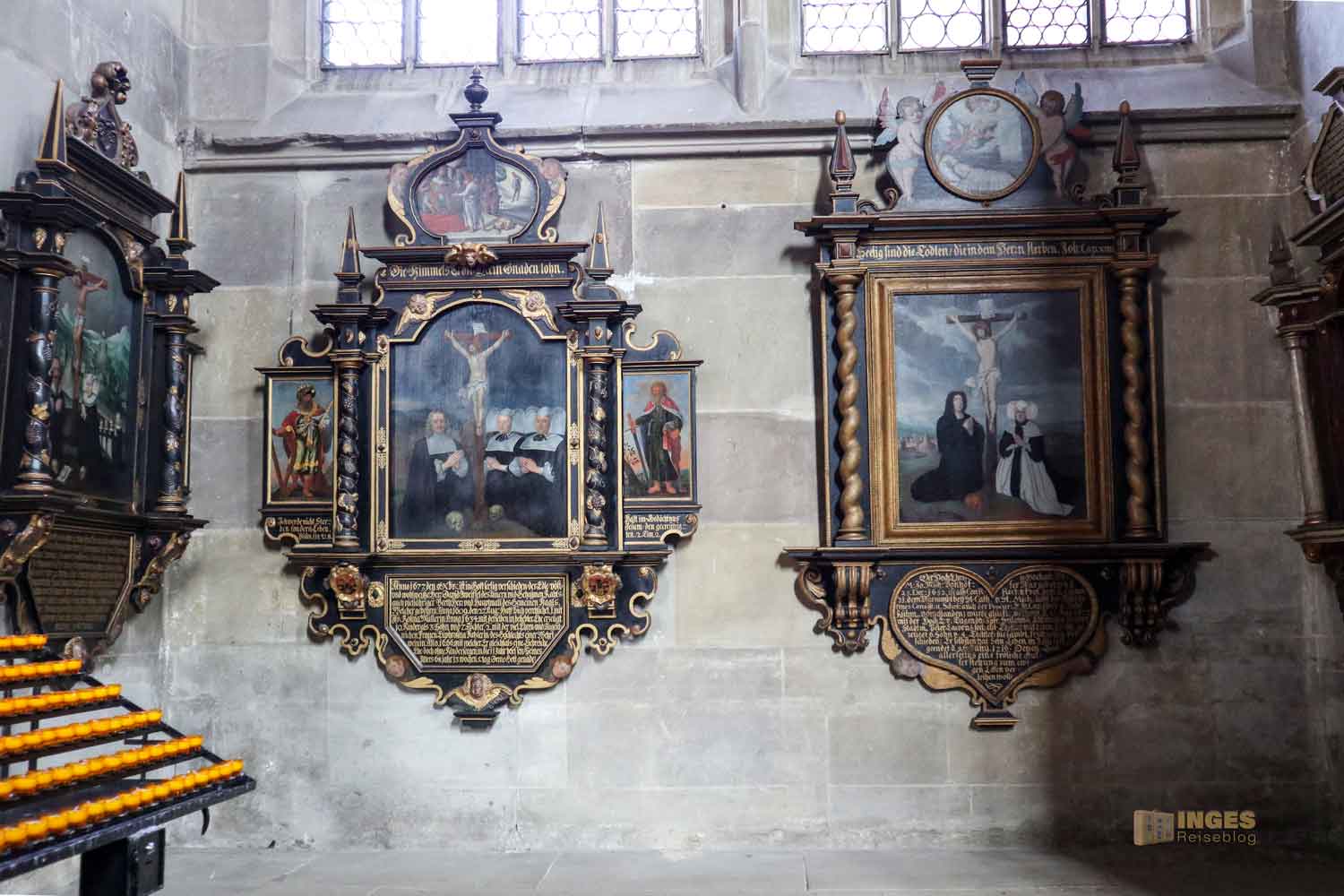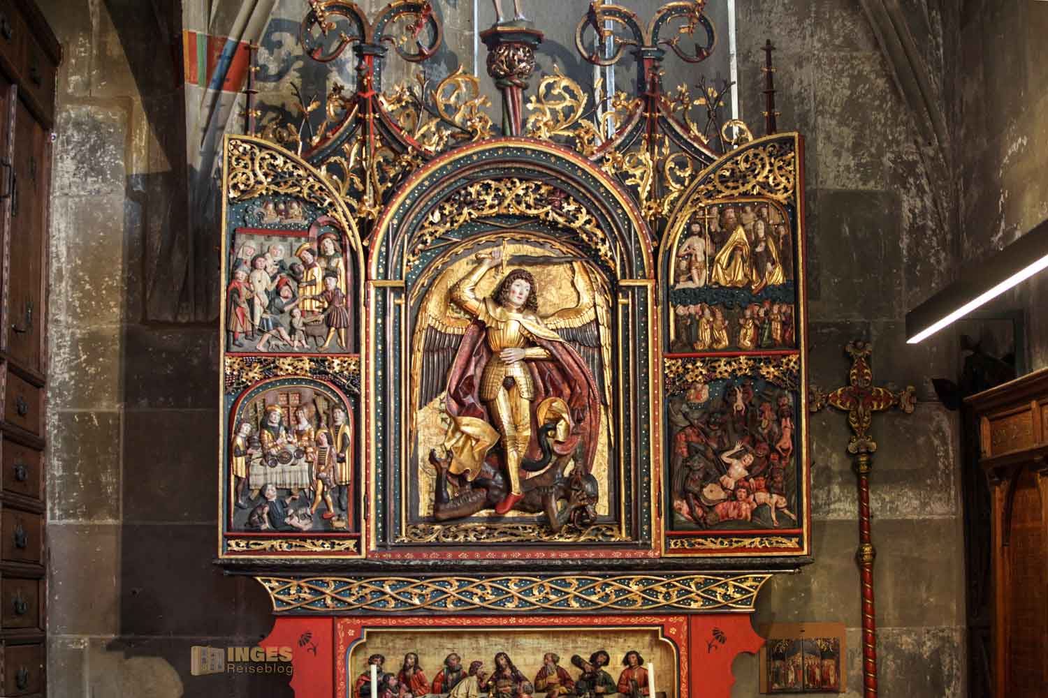Ich war ja wirklich nun schon in sehr vielen Kirchen, und St. Michael erinnert mich mit den Chorkapellen sehr an unser Hl.-Kreuz-Münster und auch an den Veitsdom in Prag. Aber diese Anzahl an Altären und Altärchen, an Grabdenkmalen und Epitaphen ist schon eine Erwähnung in Zahlen wert: 10 Chorkapellen, 31 Grabmale und über 50 Epitaphen (also Erinnerungsmale für Verstorbene). Die große Anzahl ist dem geschuldet, dass im 14. Jahrhundert eine große Frömmigkeit und Sorge um das Seelenheil von Verstorbenen vorherrschte. Und so bekam eben jeder seine Ehrung in der Kirche. 1462 waren 12 Priester an der Kirche, die vorwiegend predigten.