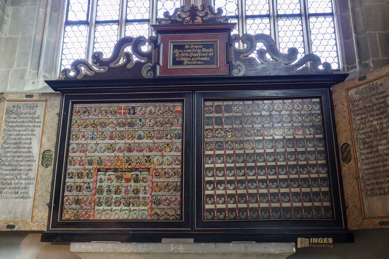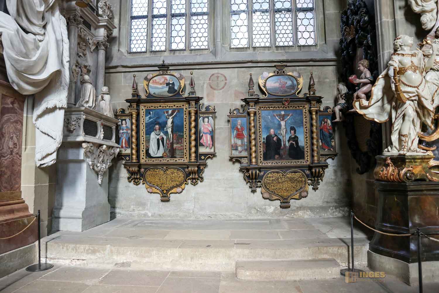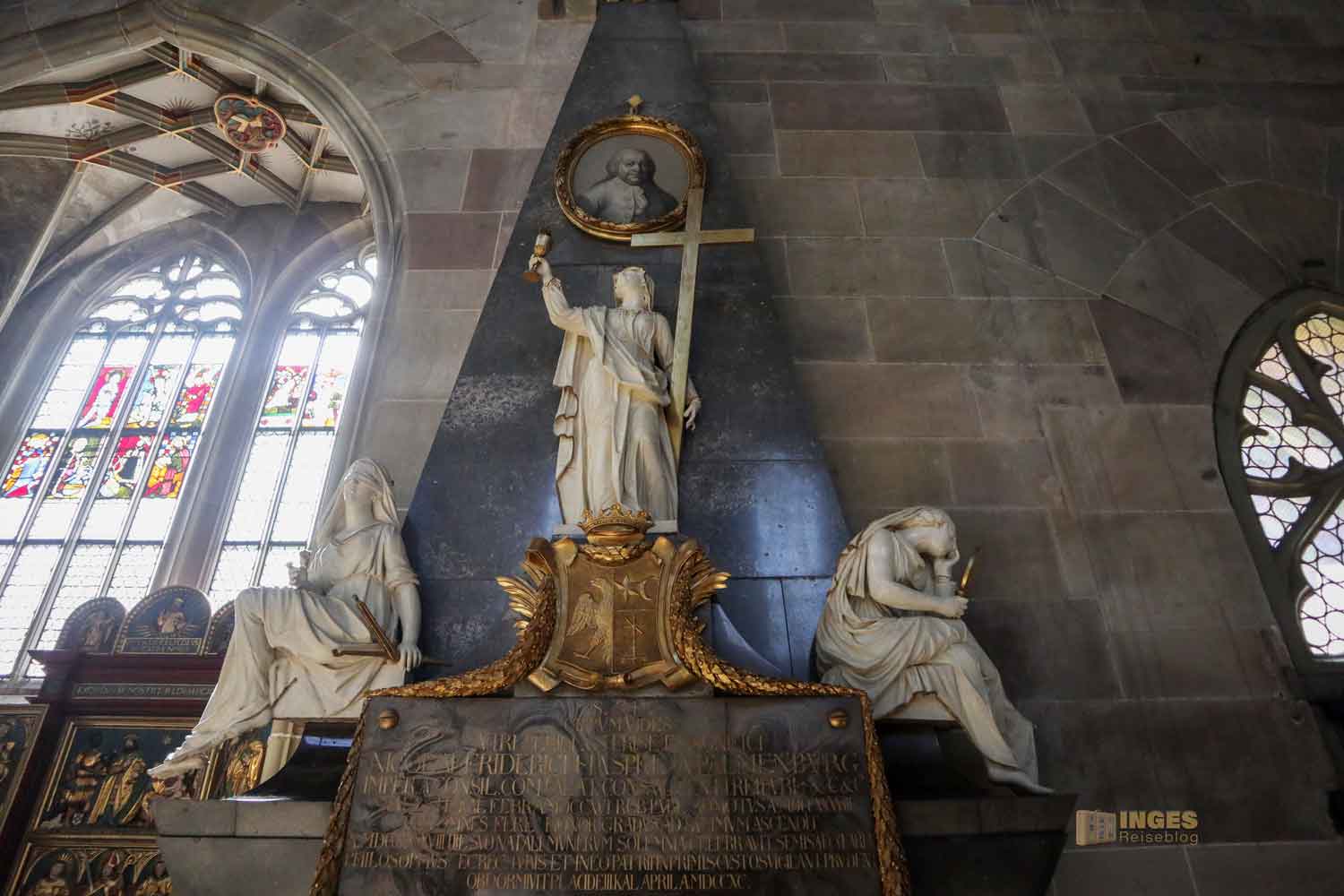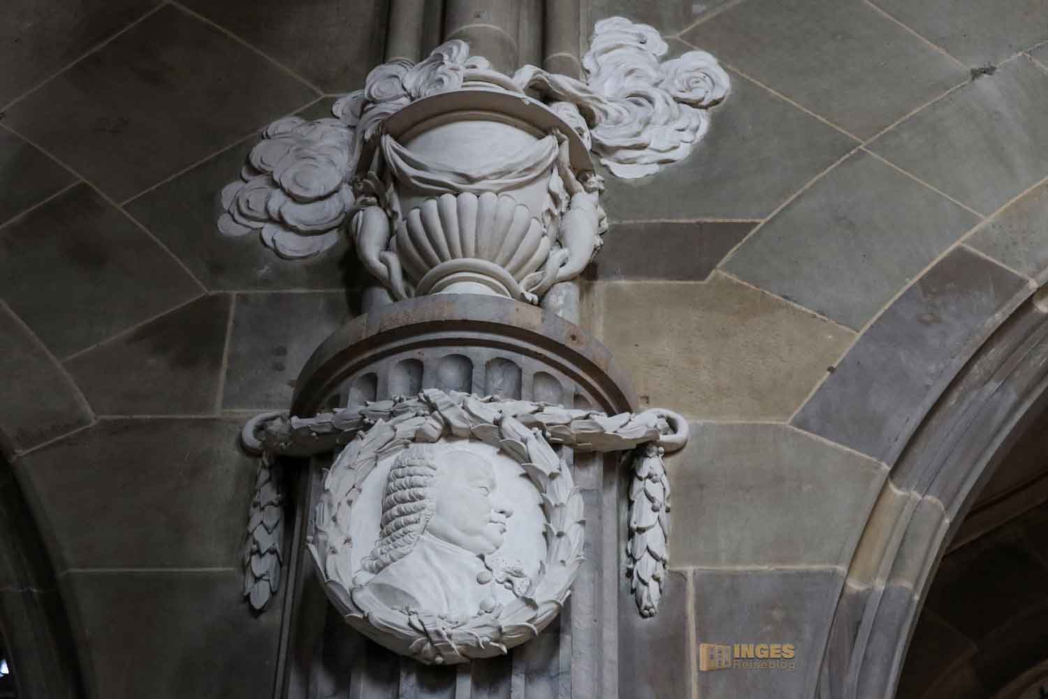 Ich war ja wirklich nun schon in sehr vielen Kirchen, und St. Michael erinnert mich mit den Chorkapellen sehr an unser Hl.-Kreuz-Münster und auch an den Veitsdom in Prag. Aber diese Anzahl an Altären und Altärchen, an Grabdenkmalen und Epitaphen ist schon eine Erwähnung in Zahlen wert: 10 Chorkapellen, 31 Grabmale und über 50 Epitaphen (also Erinnerungsmale für Verstorbene). Die große Anzahl ist dem geschuldet, dass im 14. Jahrhundert eine große Frömmigkeit und Sorge um das Seelenheil von Verstorbenen vorherrschte. Und so bekam eben jeder seine Ehrung in der Kirche. 1462 waren 12 Priester an der Kirche, die vorwiegend predigten.