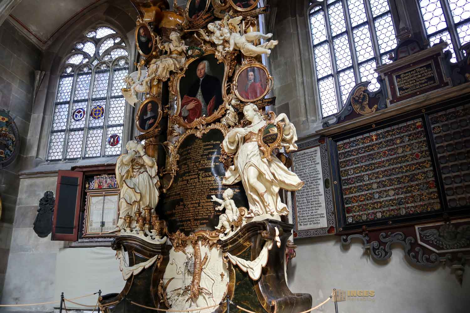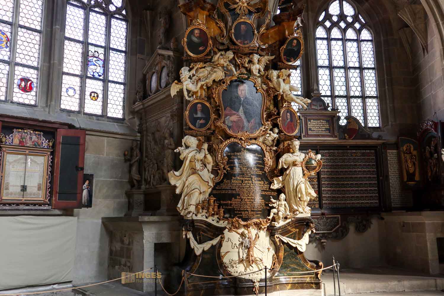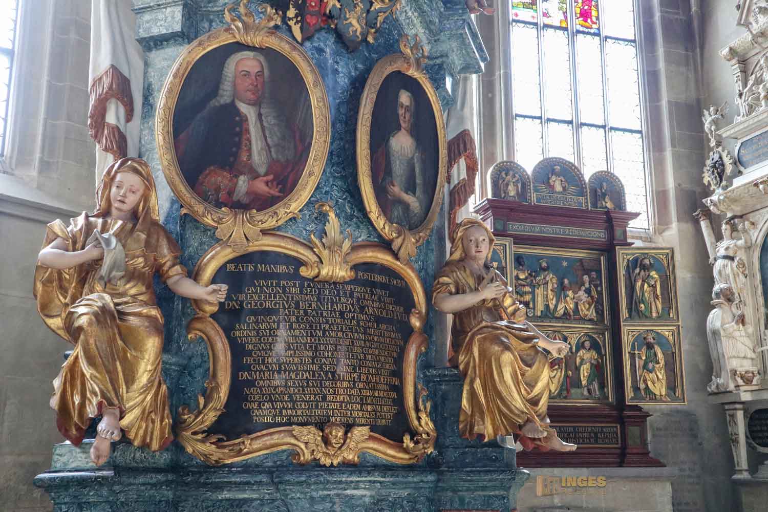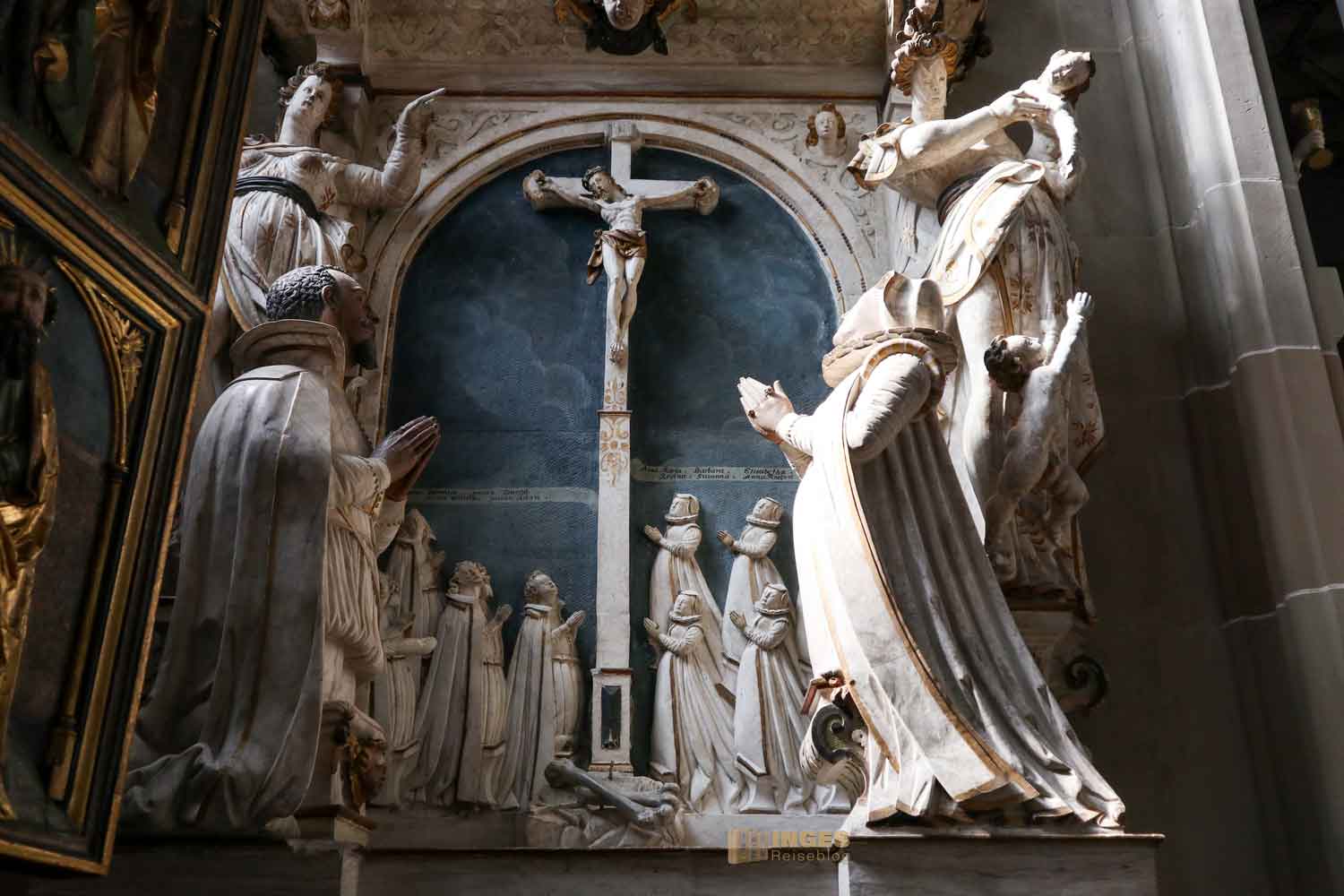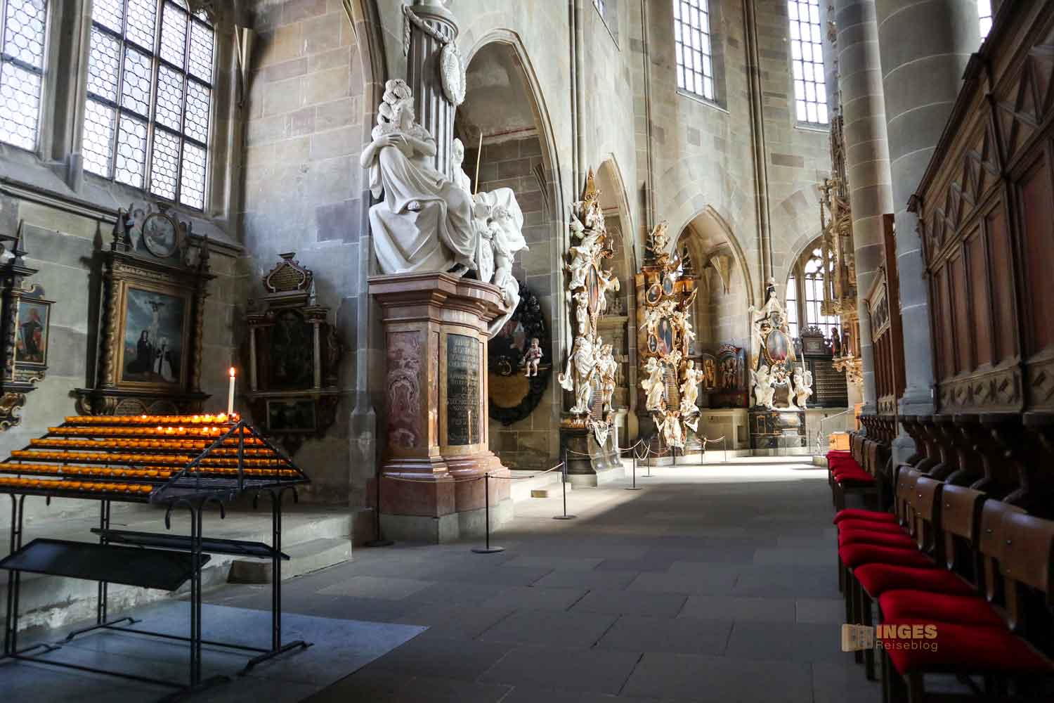 Ich war ja wirklich nun schon in sehr vielen Kirchen, und St. Michael erinnert mich mit den Chorkapellen sehr an unser Hl.-Kreuz-Münster und auch an den Veitsdom in Prag. Aber diese Anzahl an Altären und Altärchen, an Grabdenkmalen und Epitaphen ist schon eine Erwähnung in Zahlen wert: 10 Chorkapellen, 31 Grabmale und über 50 Epitaphen (also Erinnerungsmale für Verstorbene). Die große Anzahl ist dem geschuldet, dass im 14. Jahrhundert eine große Frömmigkeit und Sorge um das Seelenheil von Verstorbenen vorherrschte. Und so bekam eben jeder seine Ehrung in der Kirche. 1462 waren 12 Priester an der Kirche, die vorwiegend predigten.