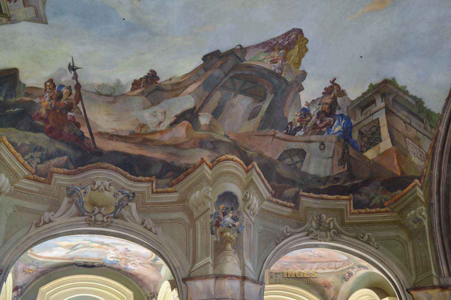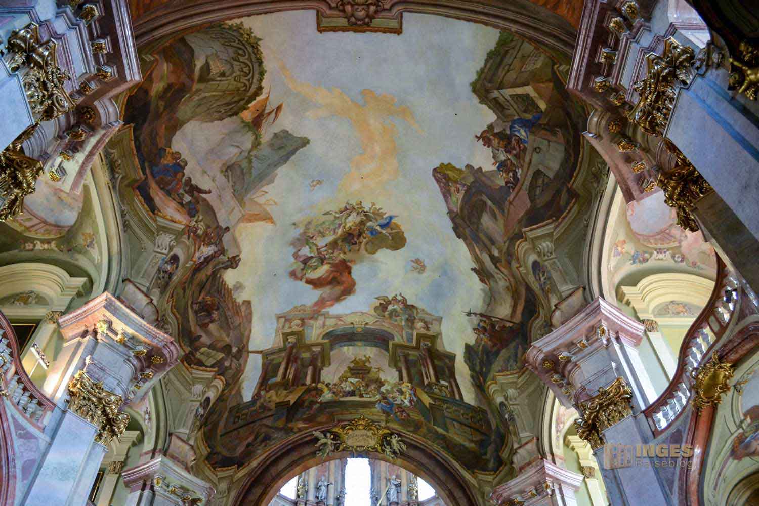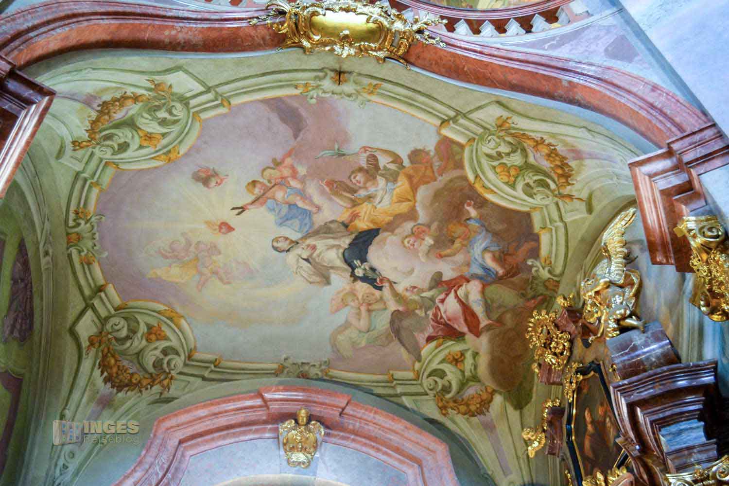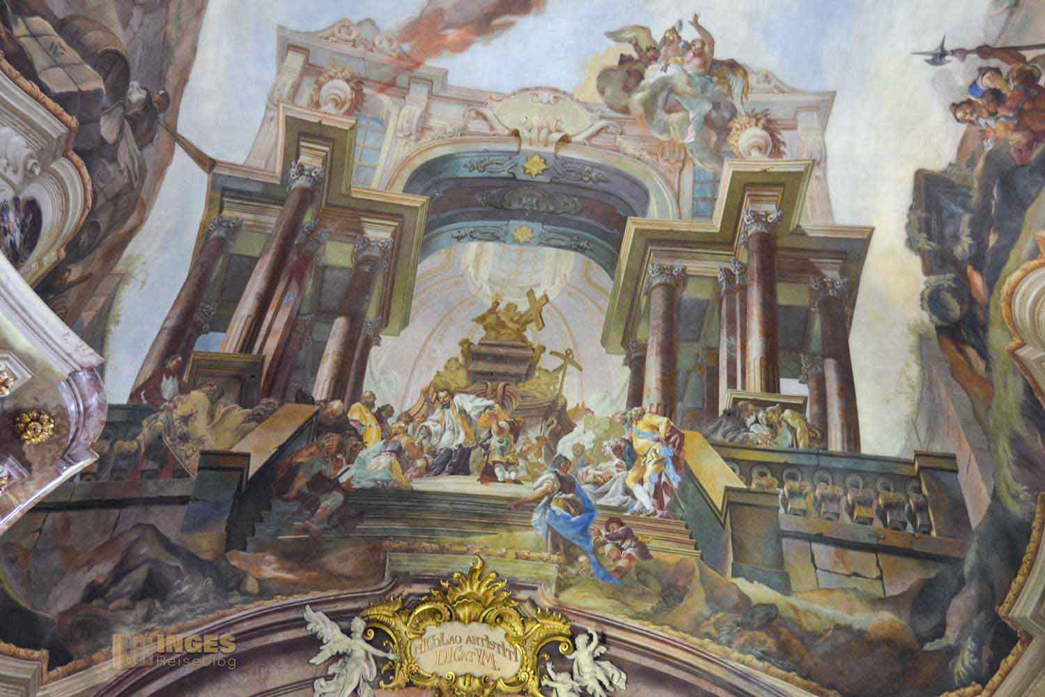 zählt mit seinen 1500 Quadratmetern zu den größten Deckengemälden in Europa. Die Verherrlichung und Szenen aus dem Leben des hl. Nikolaus von Myra stellt es dar, und wurde von Johann Lucas Kracker geschaffen. 1760 hat der in Wien geborene Maler des Spätbarocks damit begonnen.