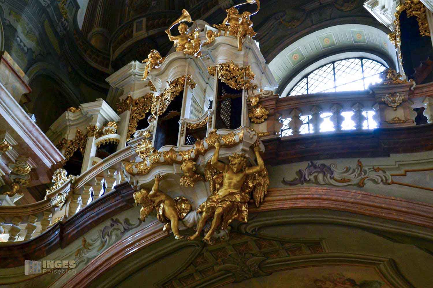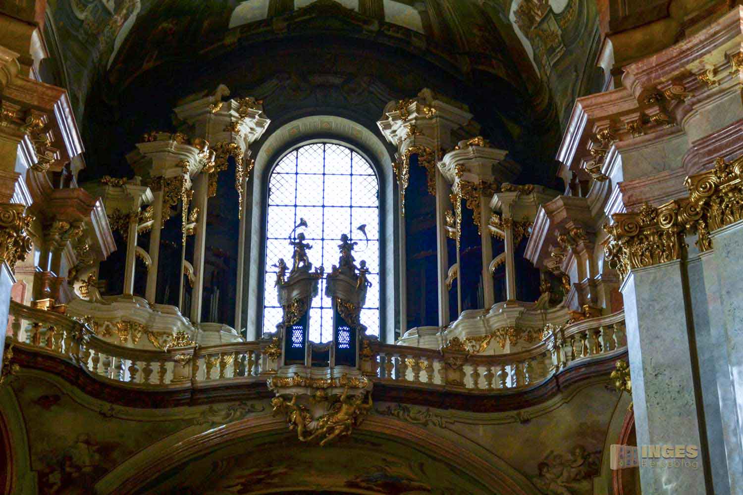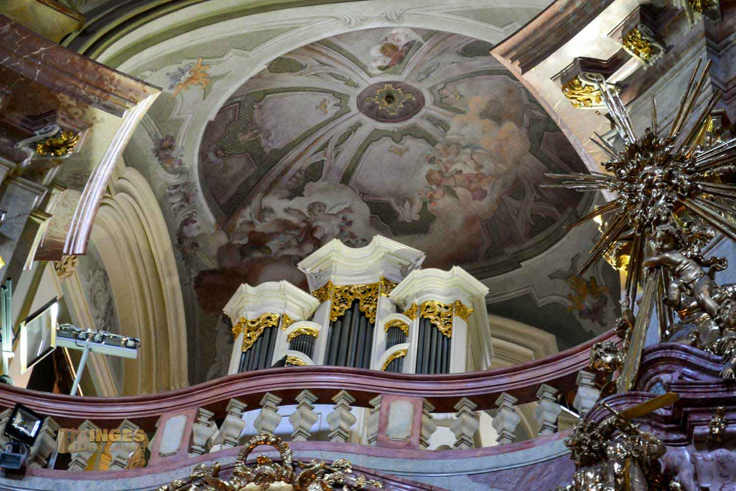 Jetzt kommt er! War es Silbermann in Sachsen, der als Orgelbauer berühmt wurde, so ist es in Böhmen der Jesuit Thomas Schwarz. 1745 fertigte er die Kirchenorgel mit ca. 4000 Pfeifen, die längste ist bis zu 6 Meter lang. Als 1787 Wolfgang Amadeus Mozart in Prag war, spielte er auf dieser Orgel. Vier Jahre nach seinem Besuch wurde wieder auf ihr gespielt, dann aber in einer Totenmesse im Gedenken an den verstorbenen Mozart.