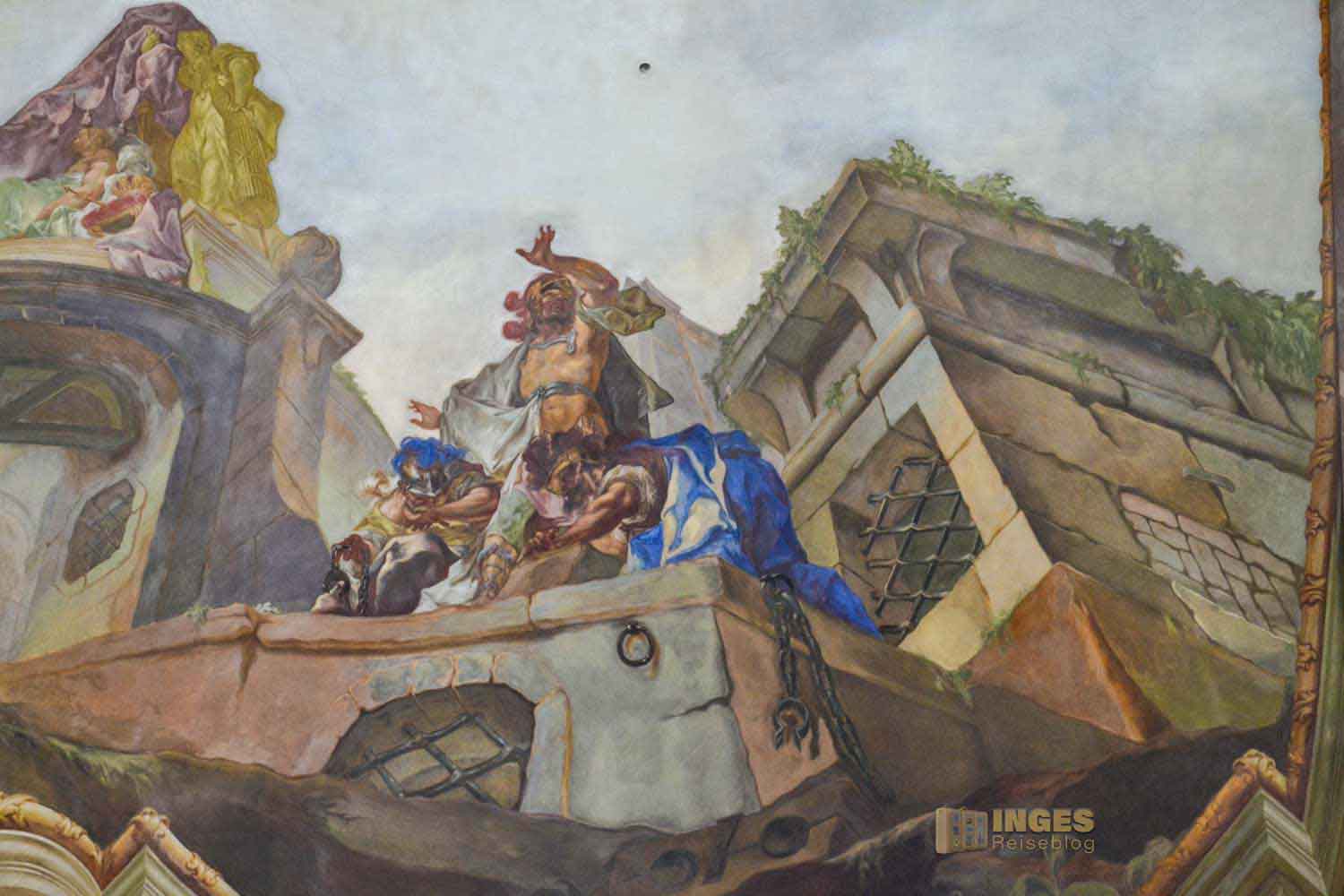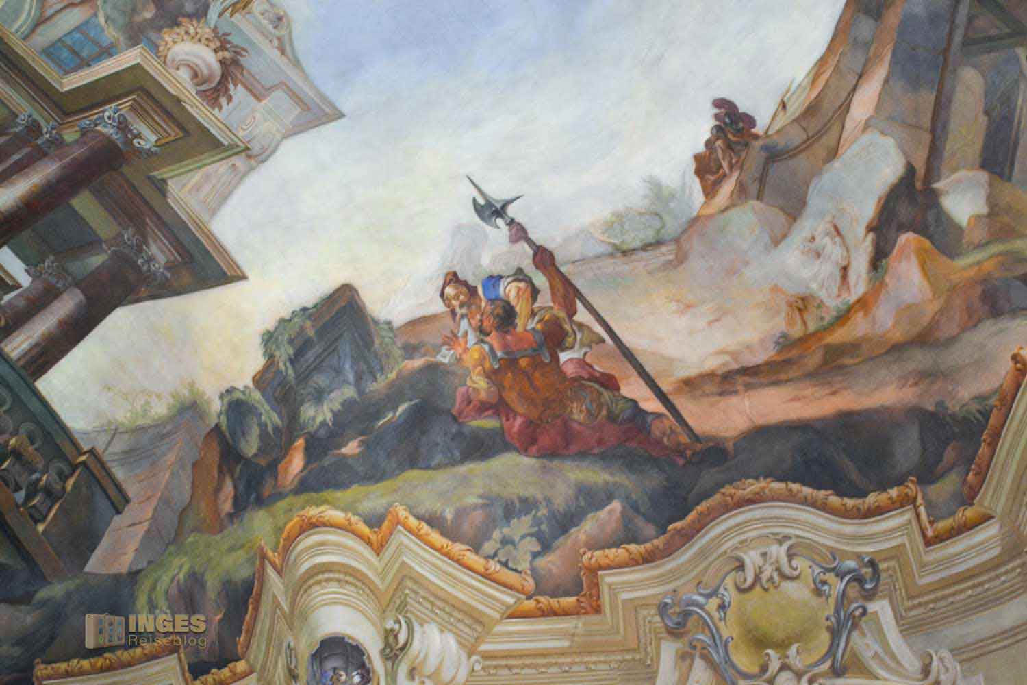 Einer hielt sich nicht an die Vorgaben und wurde beim neugierigen Blick auf die Decke von Kraker hinter einer Säule entdeckt. Kurzerhand verewigte er diese Szene in dem Deckengemälde.