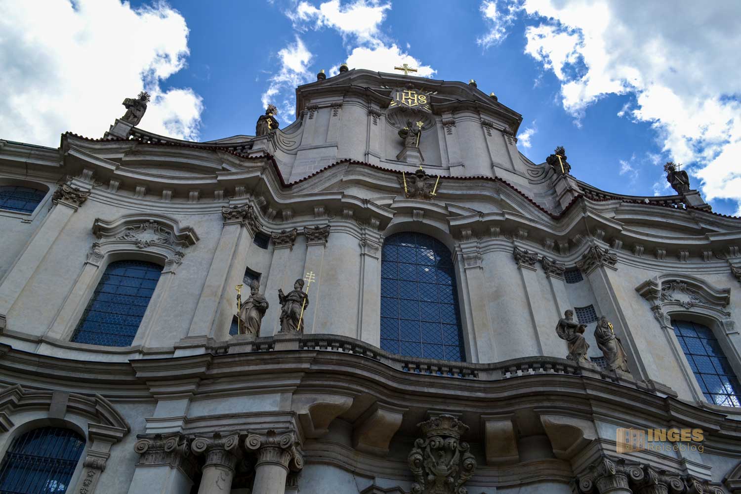 Anstelle der heutigen Kirche stand bereits 1283 eine gotische Kirche, die dem Hl. St. Nikolaus geweiht war. Nachdem 1620 in der Schlacht am Weißen Berg bei Prag der Habsburger Ferdinand nach einem Sieg über Böhmen, der neue Kaiser von Böhmen wurde, begann die Rekatholisierung. Die bis dahin ultraquistischen Kirche (ein Ableger der Hussiten, mehr über diese Bewegung lest ihr in meinem Beitrag zu Jan Hus) wurde den Jesuiten übergeben, die einen großen Gebäudekomplex, unter Einbezug der Kirche, errichteten. In diesem Jesuitenkolleg schulten sie Missionare für ihre Reisen in ferne Länder. Bewusst blieb die Gestaltung des Neubaus schlicht, hatten sie doch zuvor eine Schelte vom Vatikan wegen den reichen Verzierungen an ihrem Bau des Klementinums bekommen.