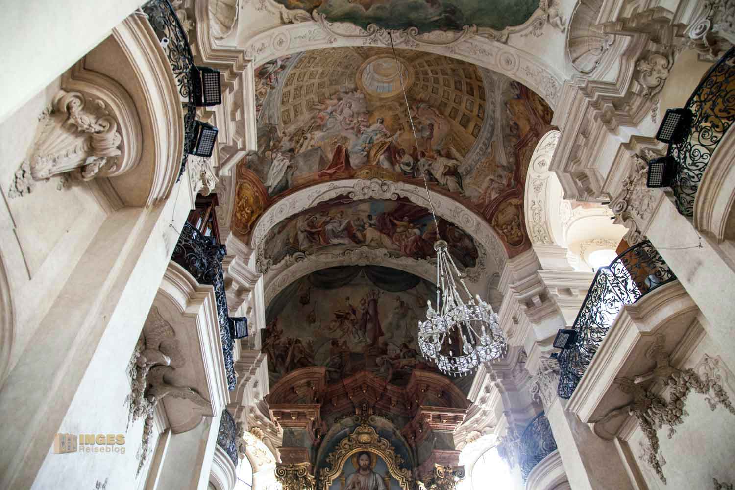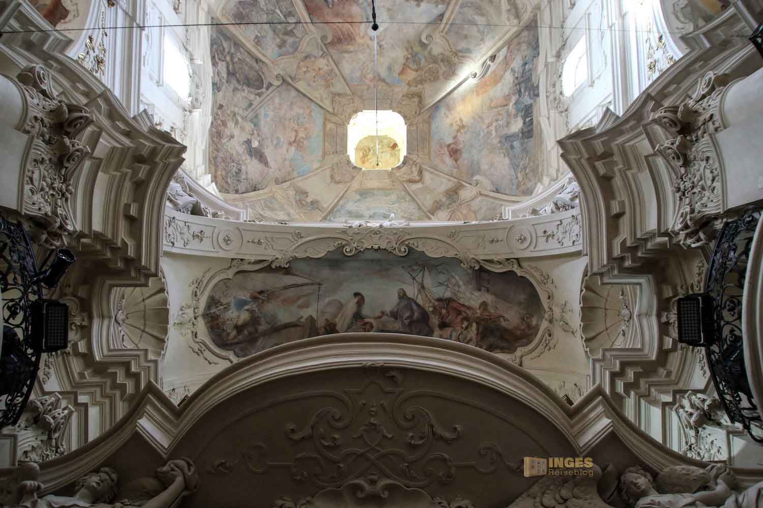 ist über und über mit Fresken gestaltet. Da war wahrhaft ein Künsterteam am Werk - die Stuckarbeiten werden Bernard Spinetti zugeschrieben, die Fresken dem bayerischen Maler Kosmas Damian Assam. Zu Bernard Spinetti, dessen Arbeiten in Prag reichlich zu bewundern sind, muss ich euch doch noch was schreiben - ganz zu Anfang seiner Karriere, wurde er wegen versuchten Mordes an seiner Auserwählten zum Tod durch das Schwert verurteilt. Vermutlich steckte bei der Hinrichtung aber eine Inszenierung dahinter, denn ansonsten hätte er sich wohl nicht selbstständig von seinen Fesseln befreien können. Das Todesurteil wurde in drei Jahre Arbeitsdienst umgewandelt. In dieser Zeit fegte er die Straßen von Prag. Ja, solche Zeiten läutern die Menschen - zukünftig war er vor allem in Kirchen und Klöster mit Stuckdekoration beschäftigt, und fertigte Heiligen-Statuen aus Stein.