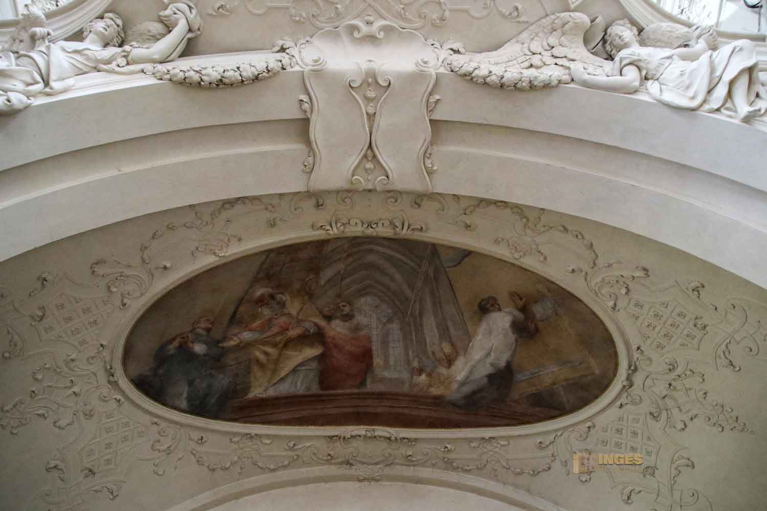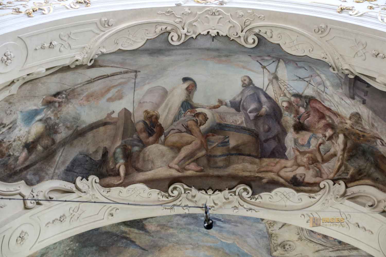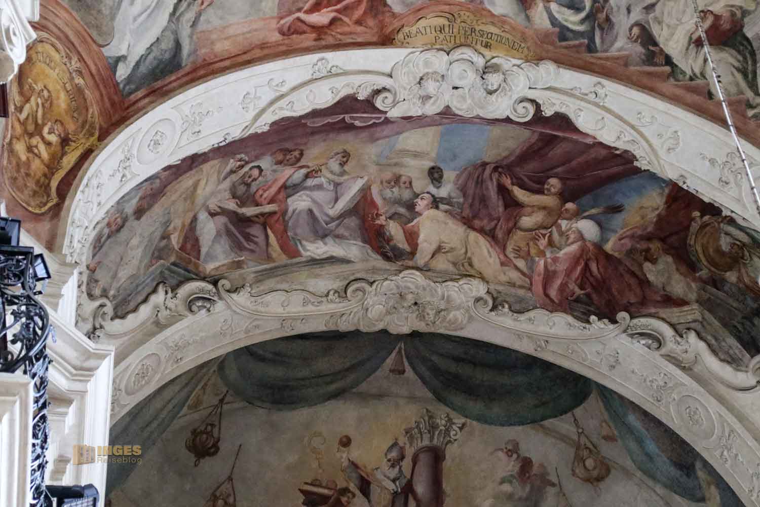auch nicht fehlen. Die Deckenfresken ziehen sich über die gesamte Orgelempore.