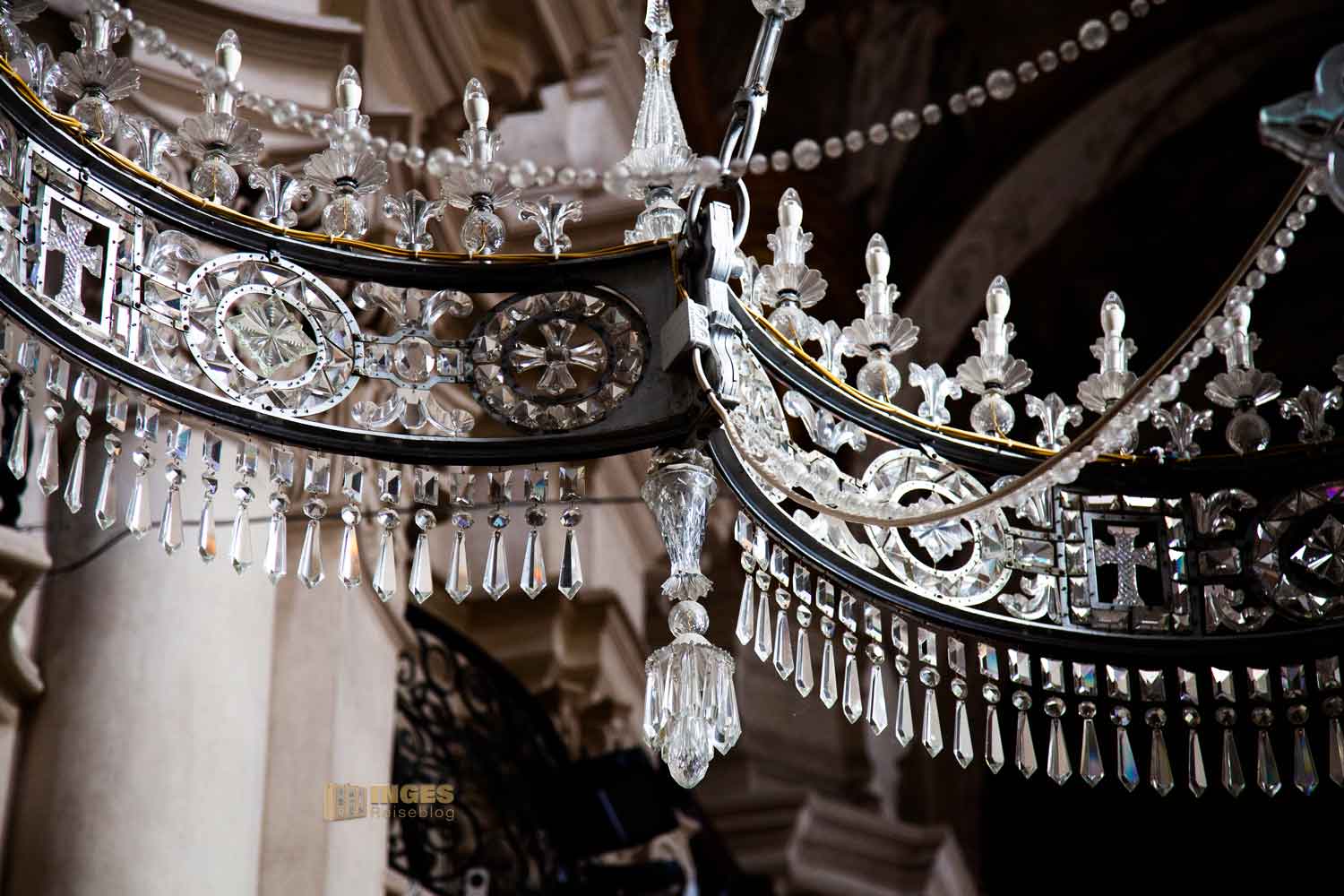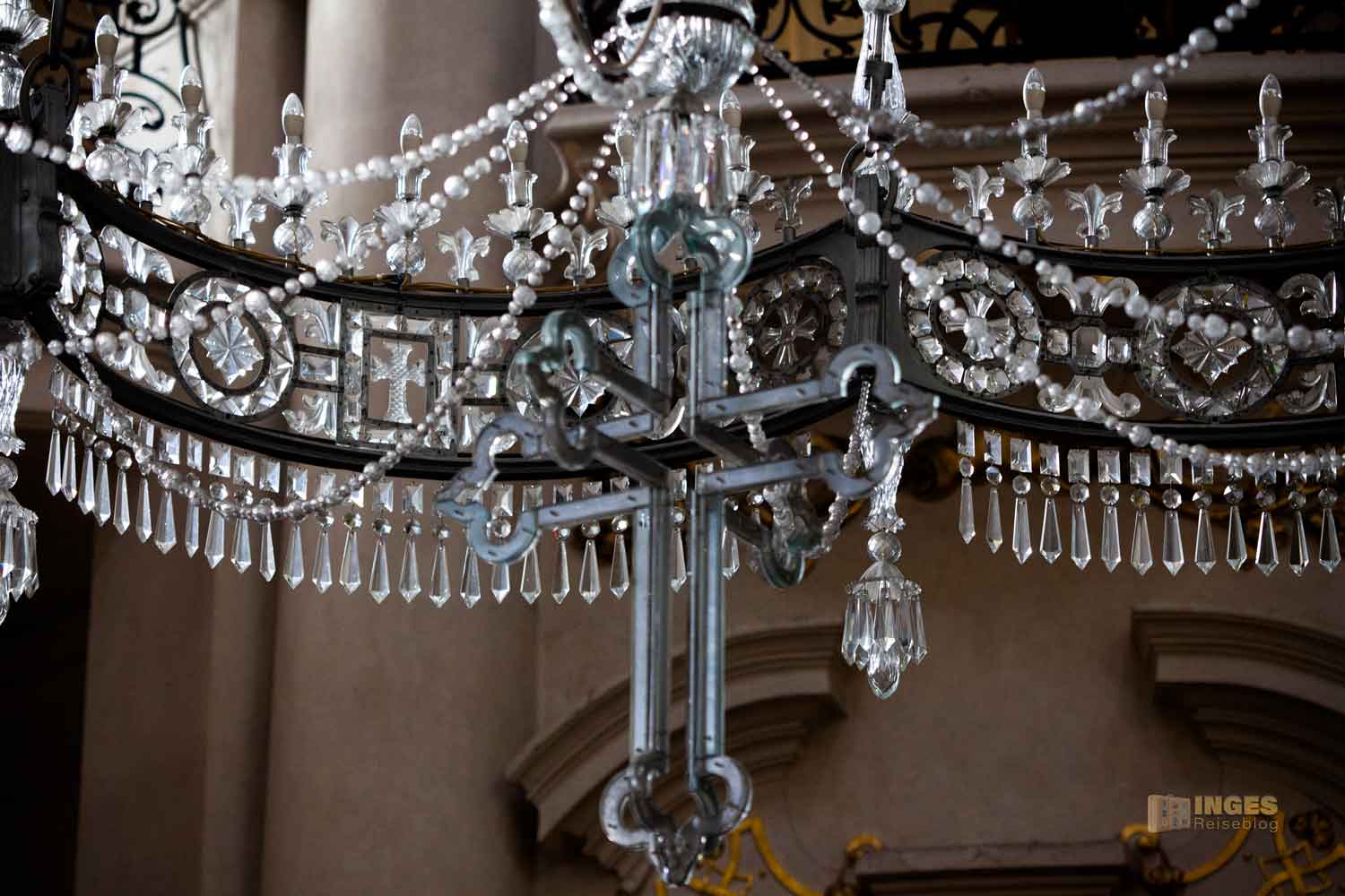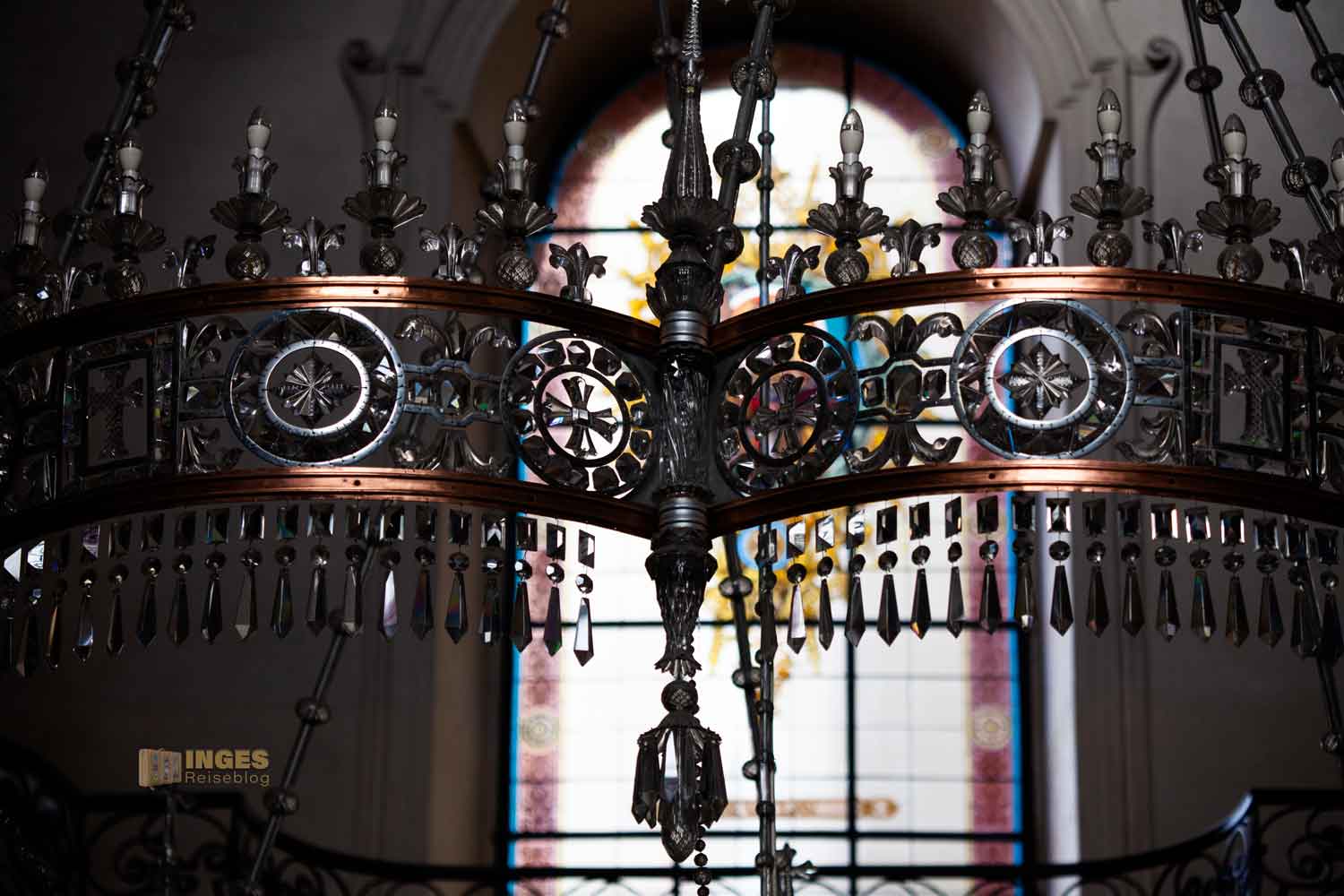 der im Hauptschiff hängt. Zar Nikolai II. hat es 1880 der damaligen orthodoxen Kirche geschenkt. Das Kunstwerk mit geschliffenem Kristallglas hat die Form einer Zarenkrone und weist stattliche vier Meter Durchmesser auf. Keine Sorge wer da drunter steht, die 1400 kg sind gut an der Decke befestigt.