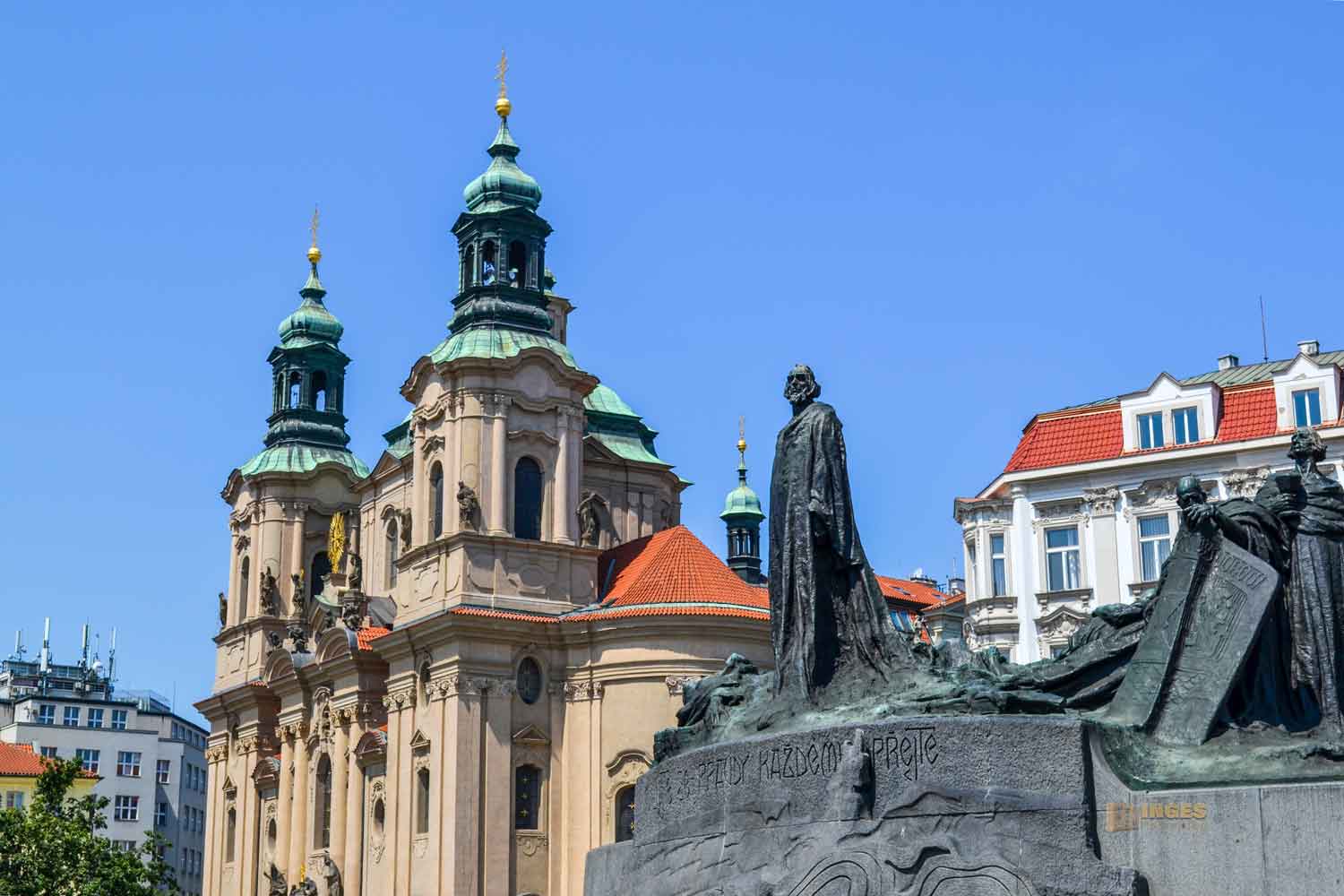 Als Buß- und Reformprediger machte sich Milicius in St. Nikolaus und in der nahe gelegenen St. Ägidius Kirche mit seinen tschechischen Predigten (später auch in lateinisch) einen Namen. Aufdeckend was in der Kirche passiert, war das nicht immer zu seinem Vorteil und brachte ihm mehrfache Inhaftierungen ein. Jan Hus (1371-1415) löste dann Milicius ab und predigte neben der Bethlehemskapelle auch in der St. Nikolaus-Kirche. Die Lehren des Reformatikers kamen vor allem bei der Kirche nicht gut an. Denn er kämpfte gegen die Missstände in der Kirche und prangerte die Verweltlichung der Kirche heftigst an. Hier alles aus dem Leben von Jan Hus zu berichten, ihr würdet lange lesen. Deshalb klickt einfach auf meinen ausführlichen Bericht über ihn. Das Denkmal von Jan Hus steht also nicht einfach so fast vor der Kirche.