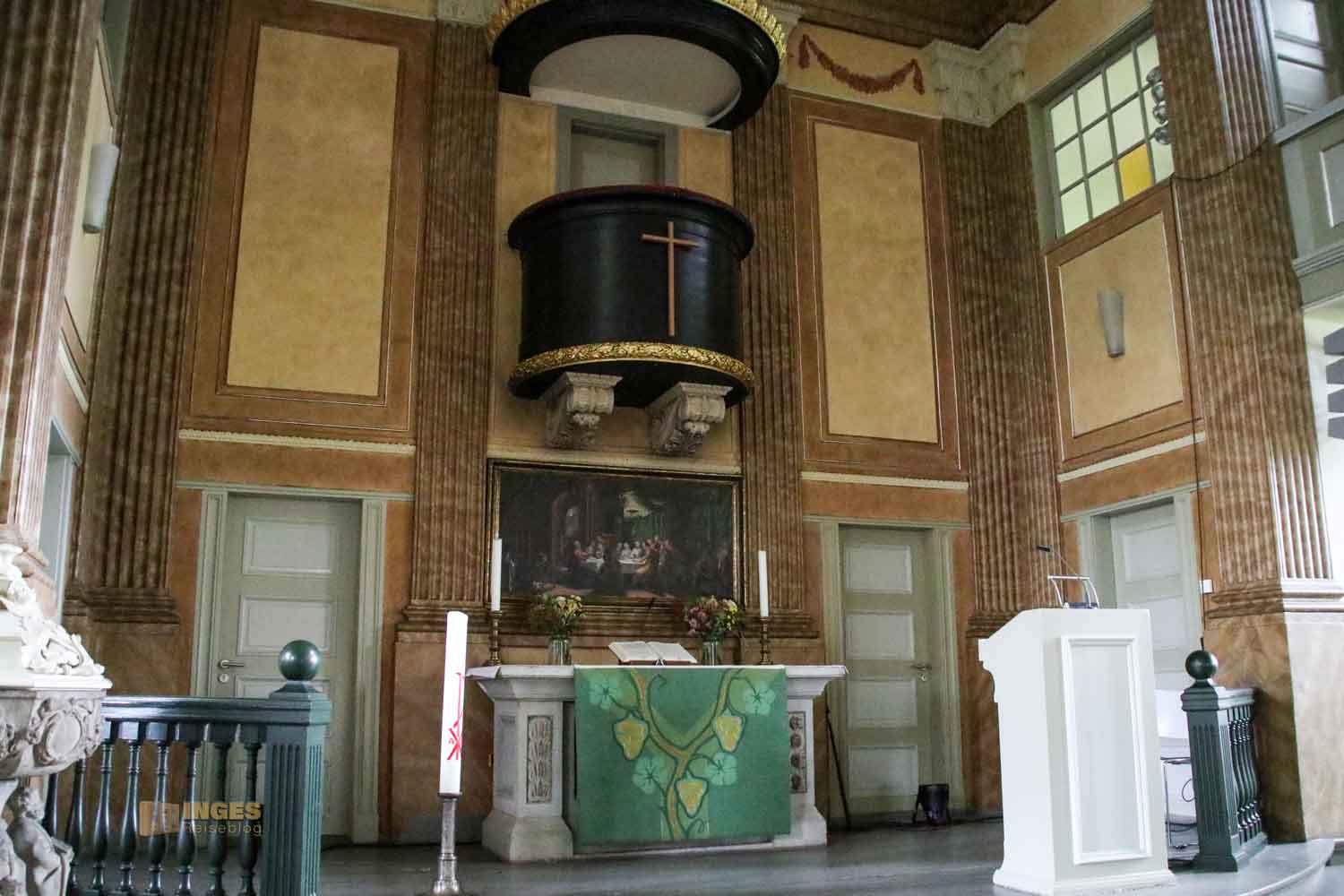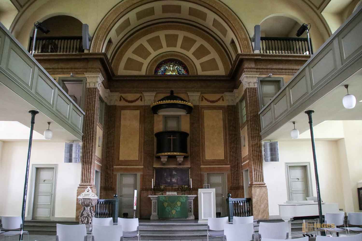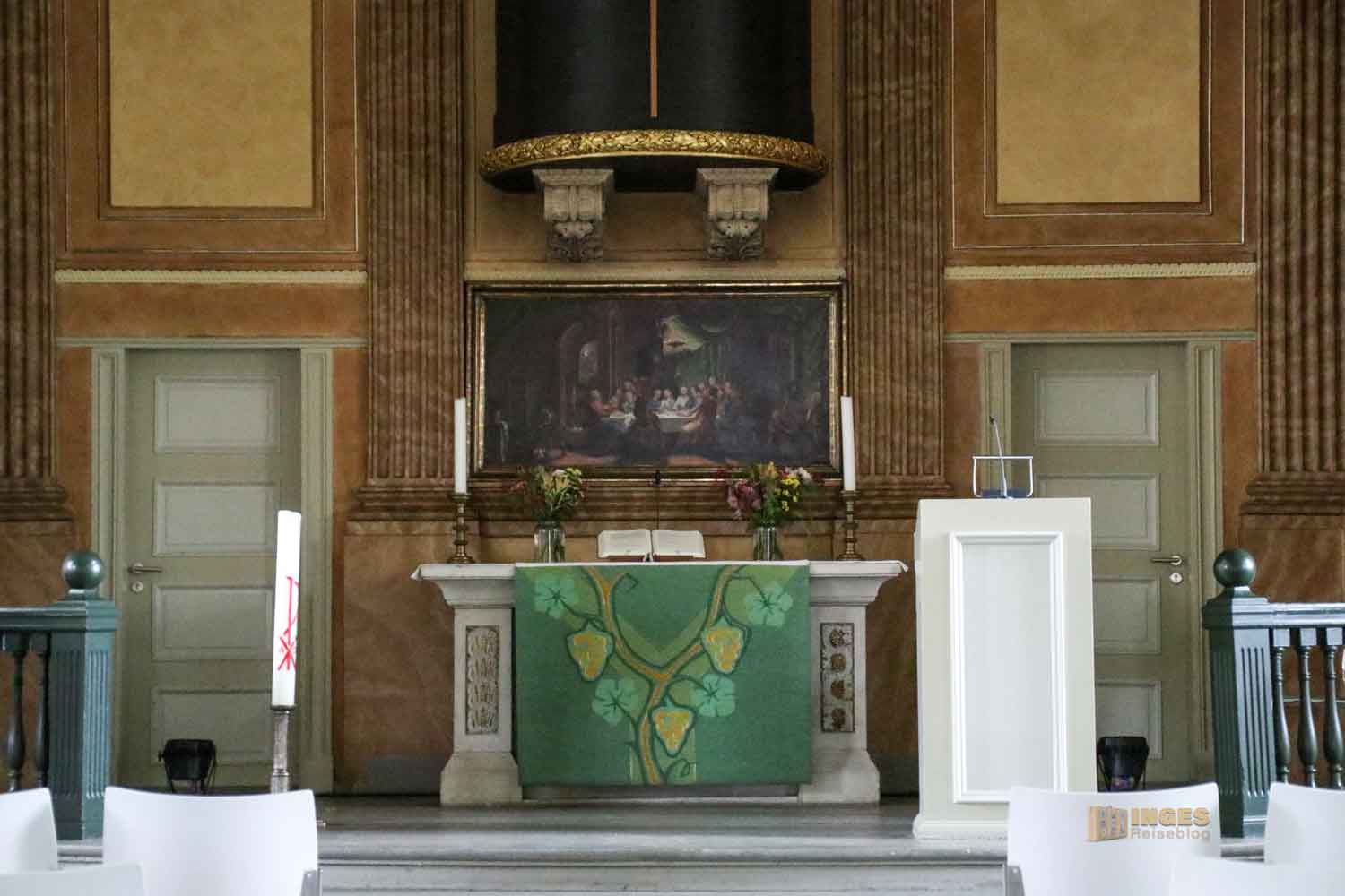 der mich auf den ersten Blick an die evangelische Stadtkirche in Göppingen (in meinem Schwabenländle) erinnert. Wimmel war auch für die Innenraumgestaltung verantwortlich und schuf einen zentralen Kanzelaltar. Auch in Göppingen gibt es solch einen Kanzelaltar, wie wir dort erfahren durften, aber auch aus dem Grund, dass in dieser Saalkirche auch politische Versammlungen abgehalten wurden und man so den Redner im Blick hatte.