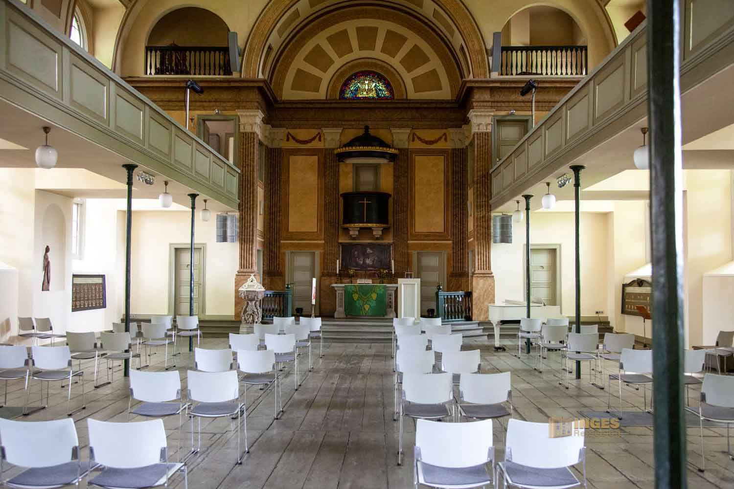 so total untypisch wie ich sie bisher noch nicht oft gesehen habe. Keine Bänke, nur Stühle im Kirchenraum verteilt (wegen Corona mit dem nötigen Abstand). Schaut mal ....