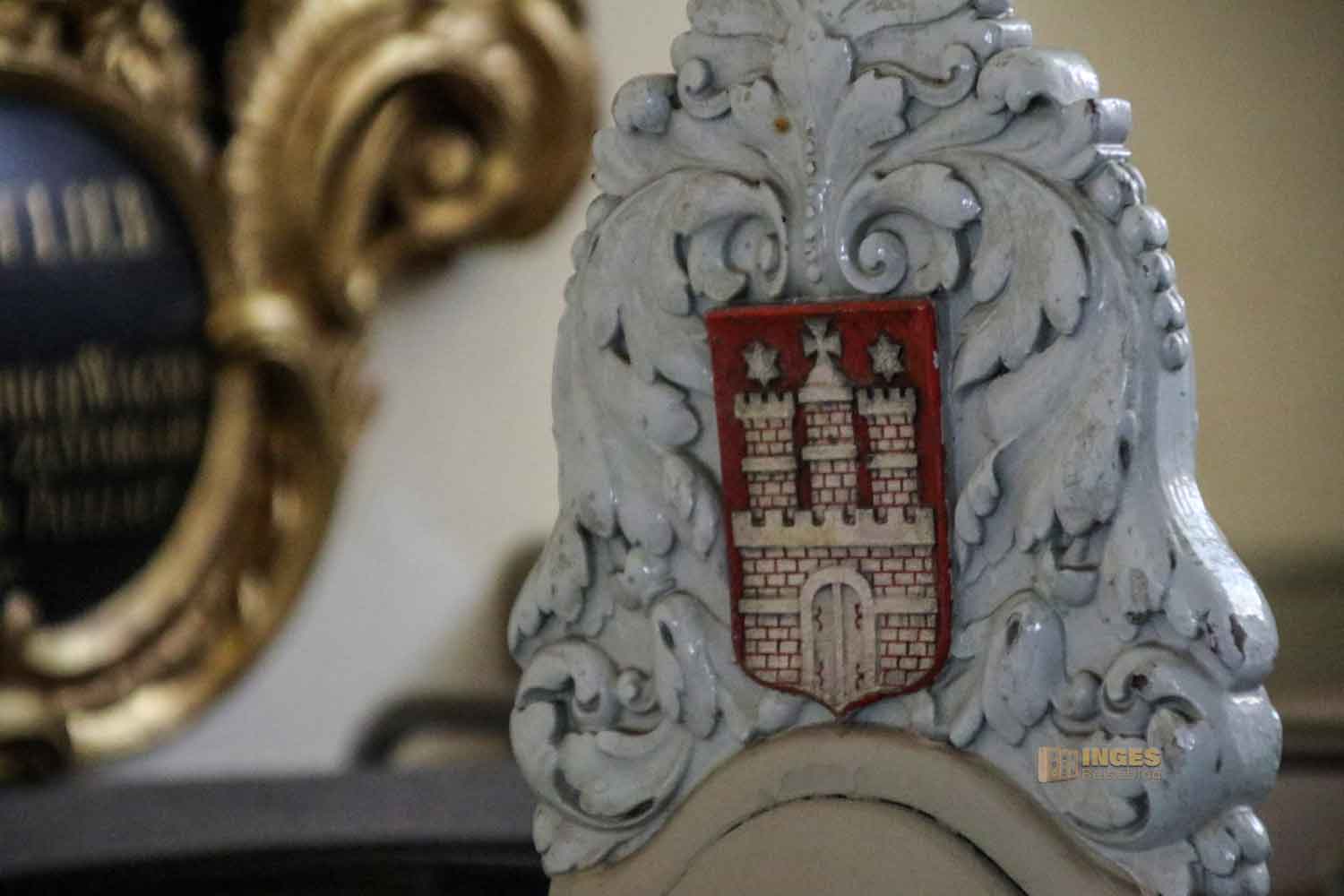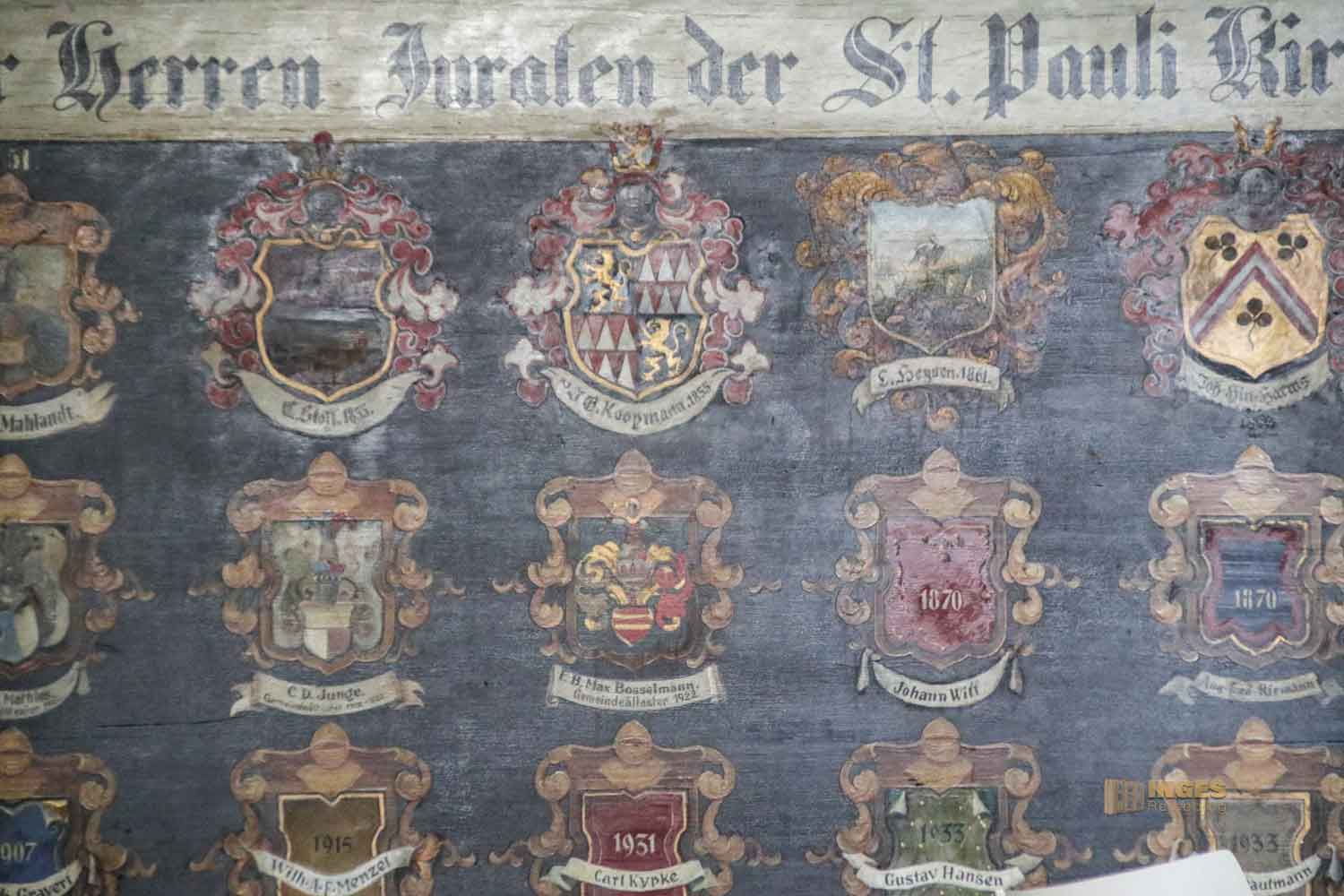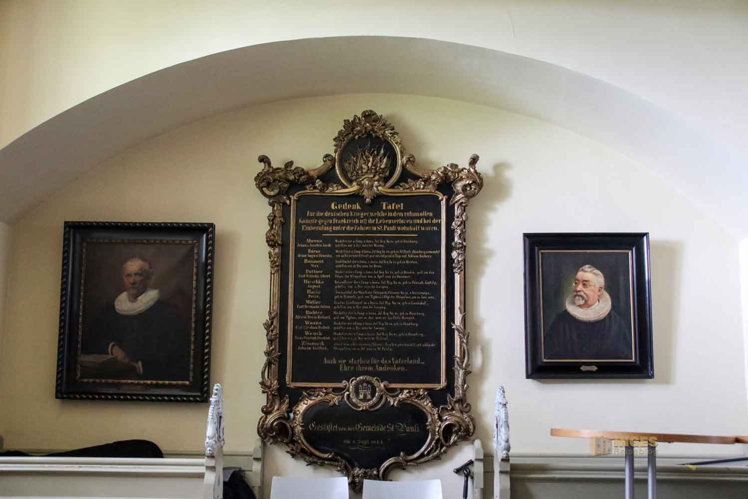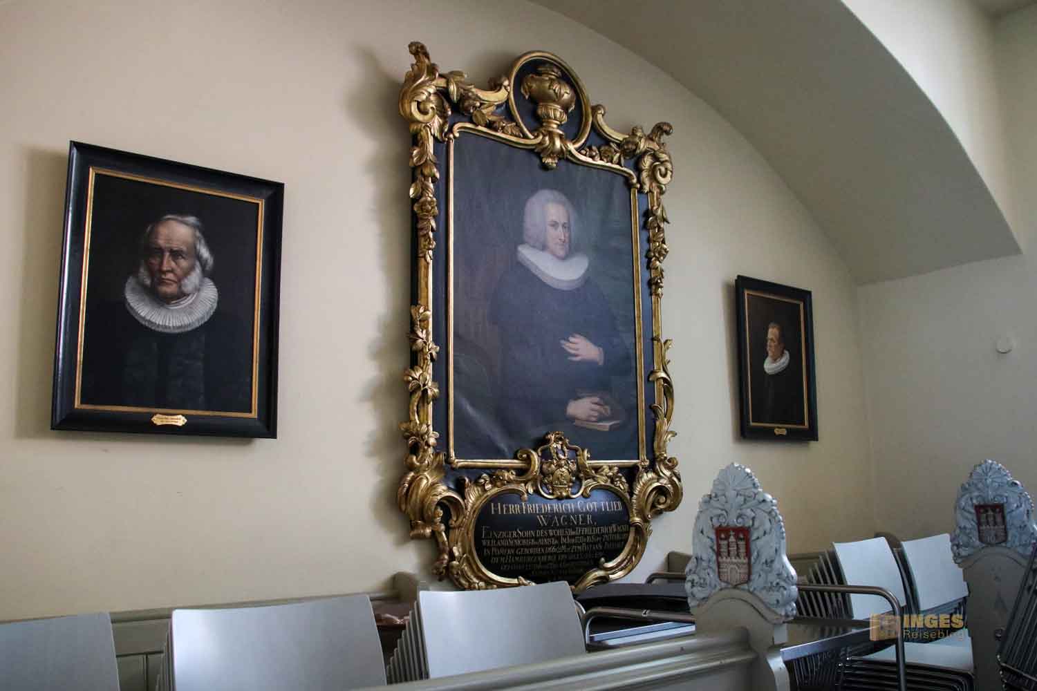 Wappen und Gemälde von Pastoren der Gemeinde ziehen ebenso meine Blicke an, wie eine alte Senatsbank mit dem Hamburger Wappen.