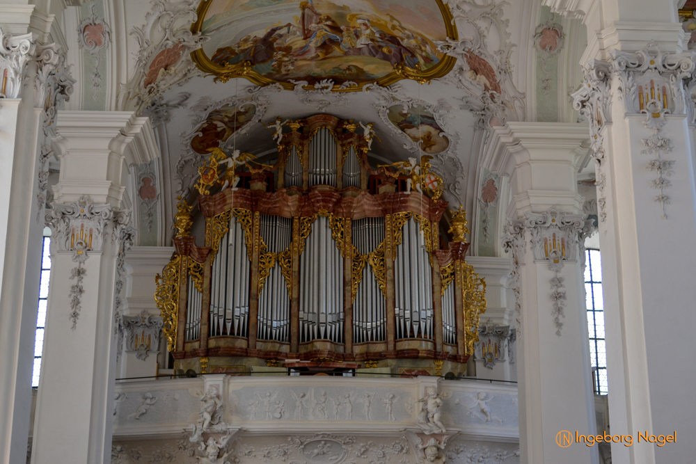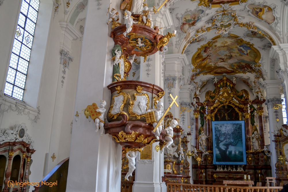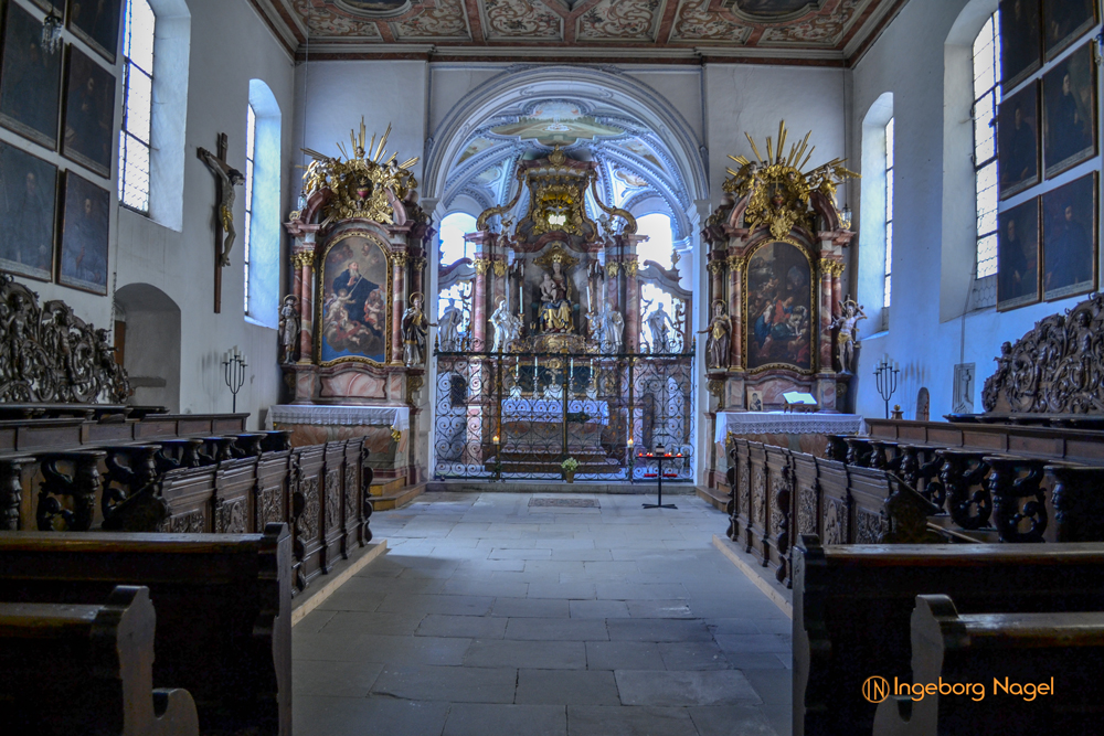 Isny hat zwei Kirchen nebeneinander, die evangelische Nikolaikirche und die katholische Kirche St. Georg und Jakobus, die wir besucht haben. Im 11. Jahrhundert schuf Graf Wolfrad von Altshausen zu Ehren des Hl. Georg und des Apostels Jakobus diese Kirche. 1096 wurde sie von seinem Sohn durch die Stiftung eines Benediktinerklosters zur Pfarr- und Klosterkirche erhoben und war dann damit nur noch den Mönchen vorbehalten.