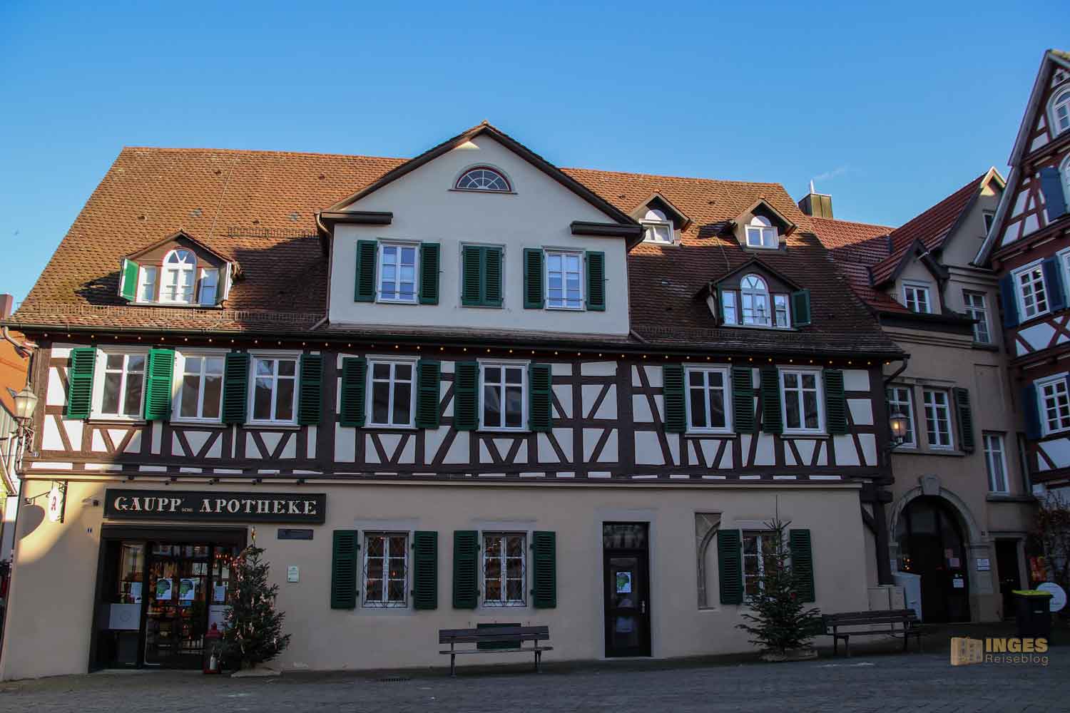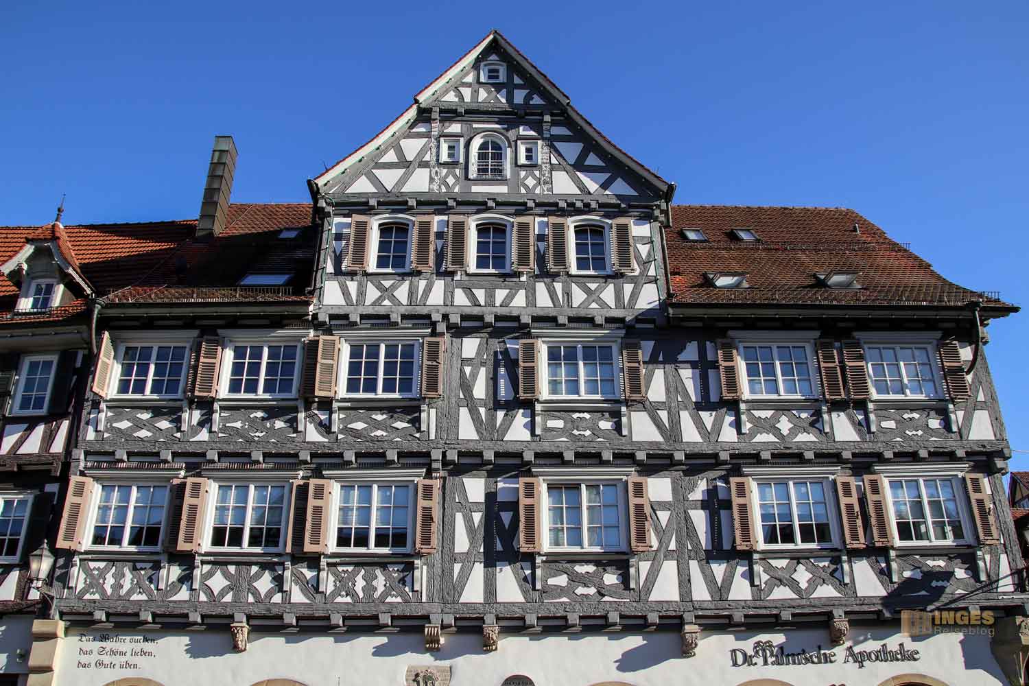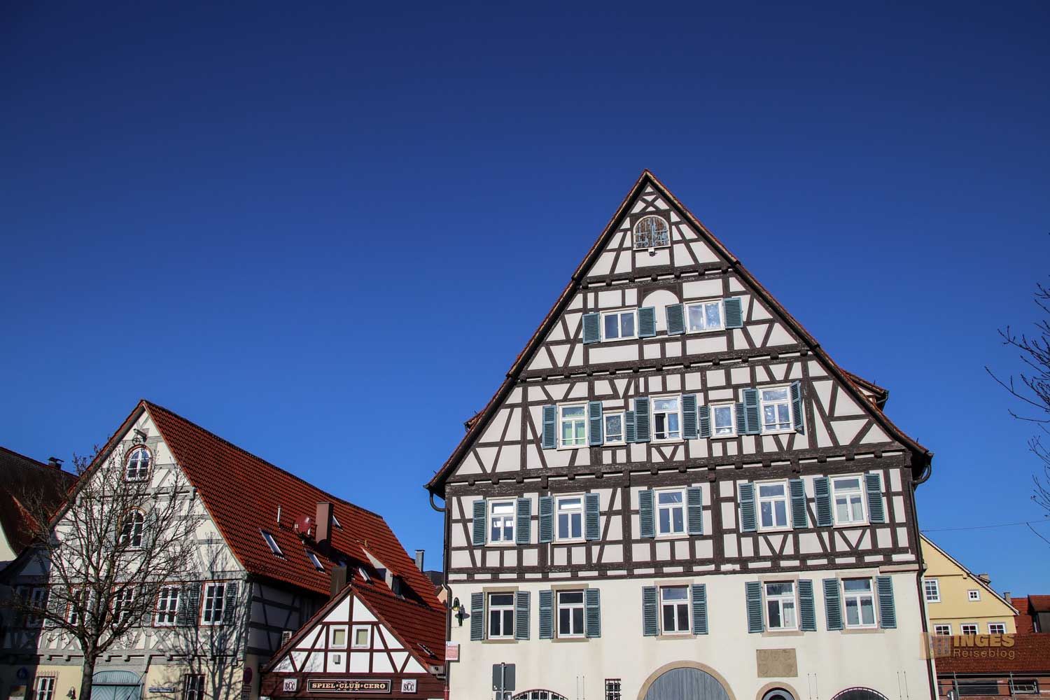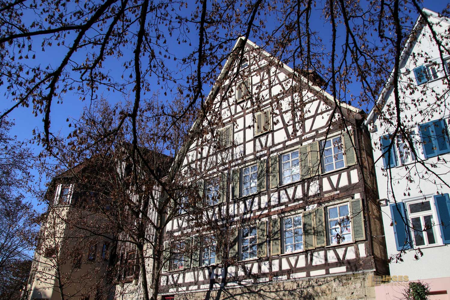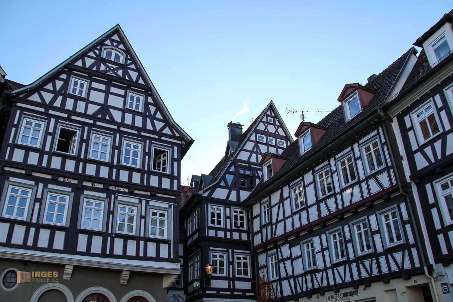 Ihr seht es an den Schattenspielen - wir hatten heute, Ende November, ein traumhaftes Wetter. Zwar kalt, aber herrlich sonnig. So macht es Spass eine Stadt zu 'erobern'. Denn kaum ums Eck Richtung Kirche, erwartet uns das nächste Fachwerk-Ensemble. Unübersehbar auch, dass man sich im Schwabenland befindet, wie man am Wirtshausschild sieht. Eigentlich ist es ja eine Bar. 🙂